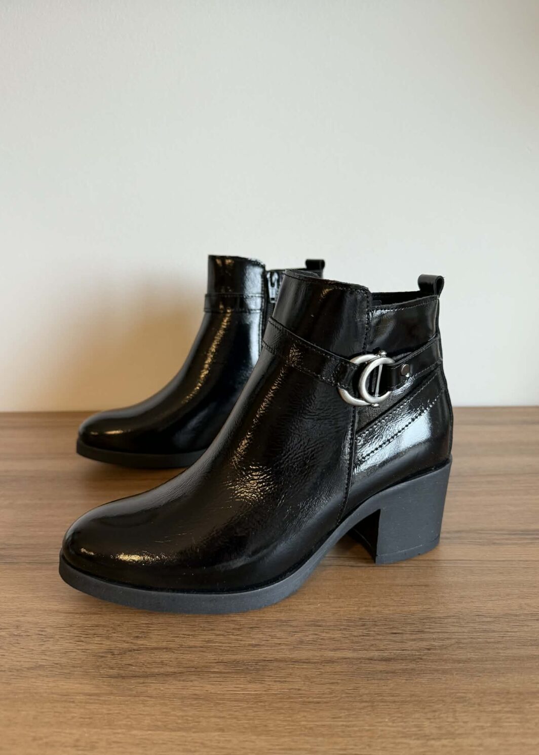 Botim em pele envernizada com tacão