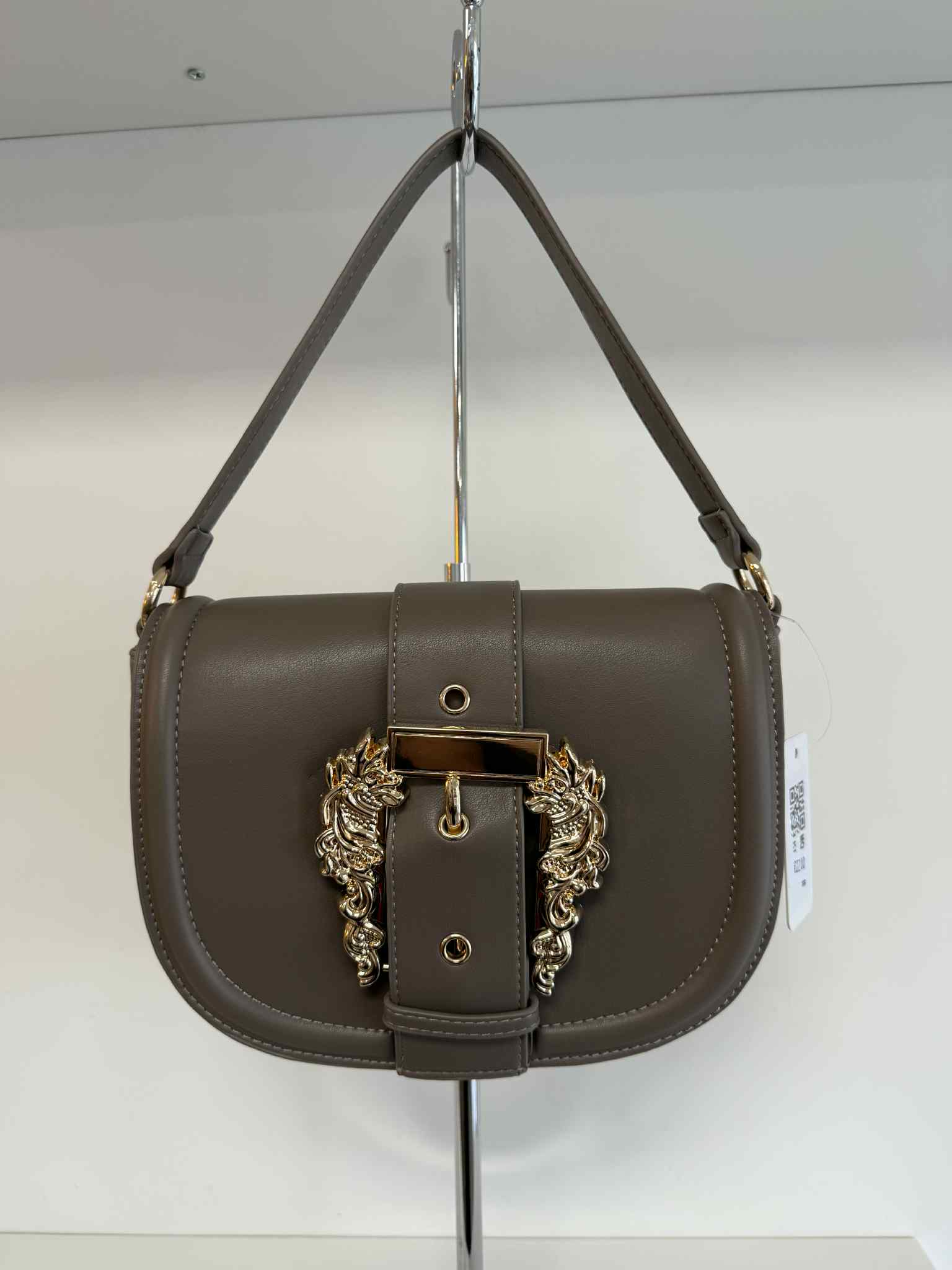 Mala em pele sintética. Com alça de ombro e tiracolo removível em corrente.