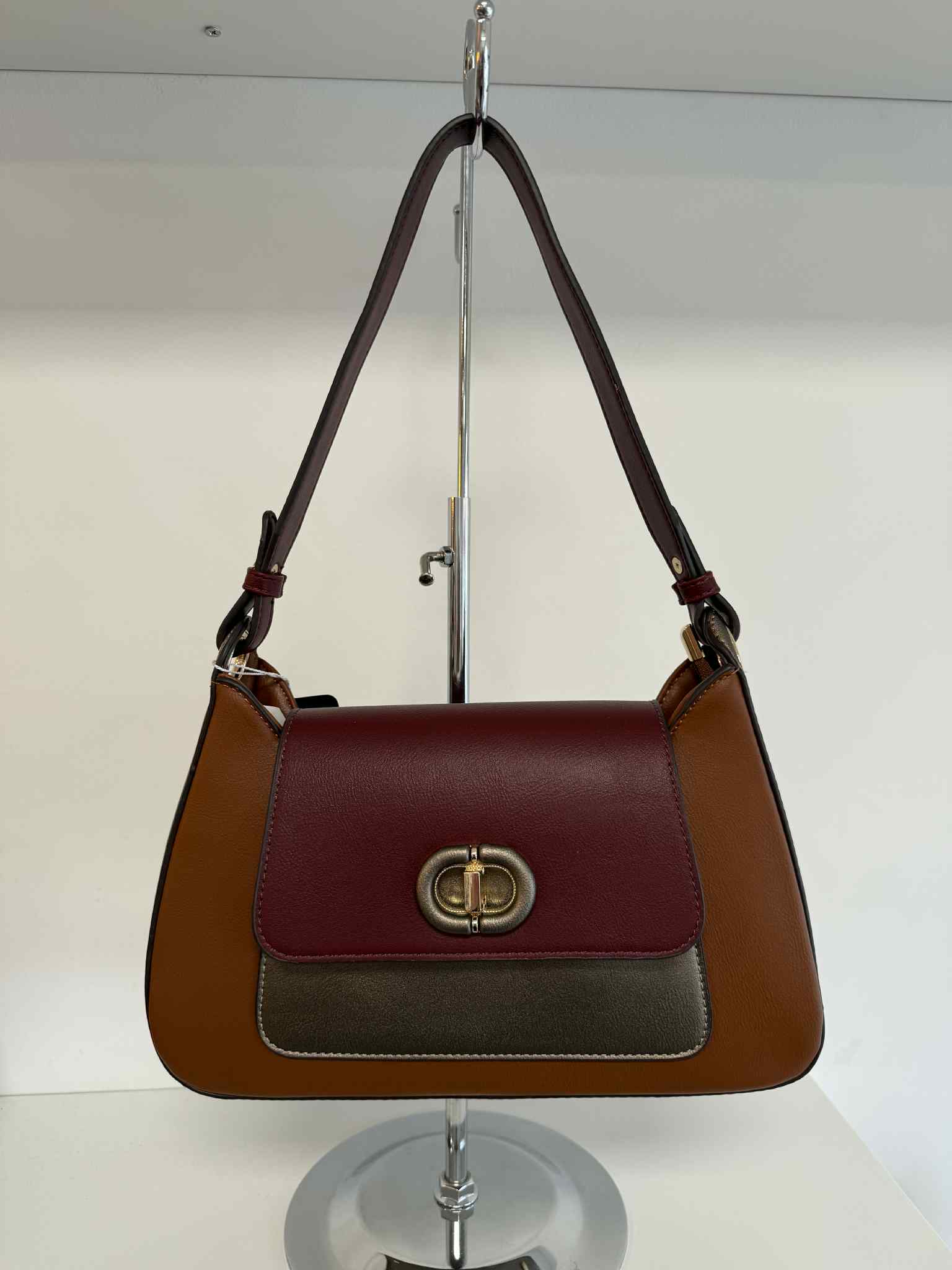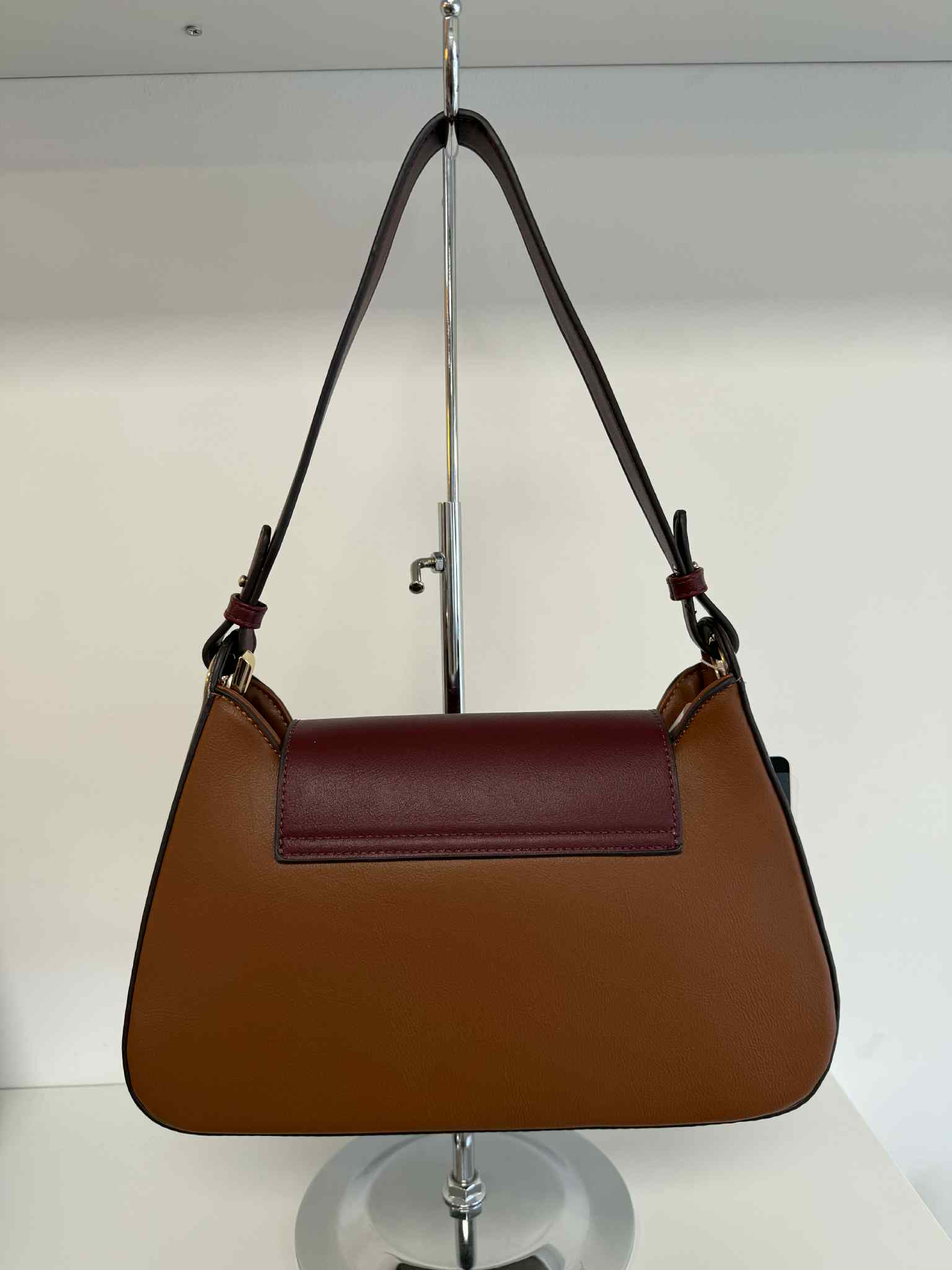 Mala em pele sintética. Com alça de ombro e tiracolo removível.