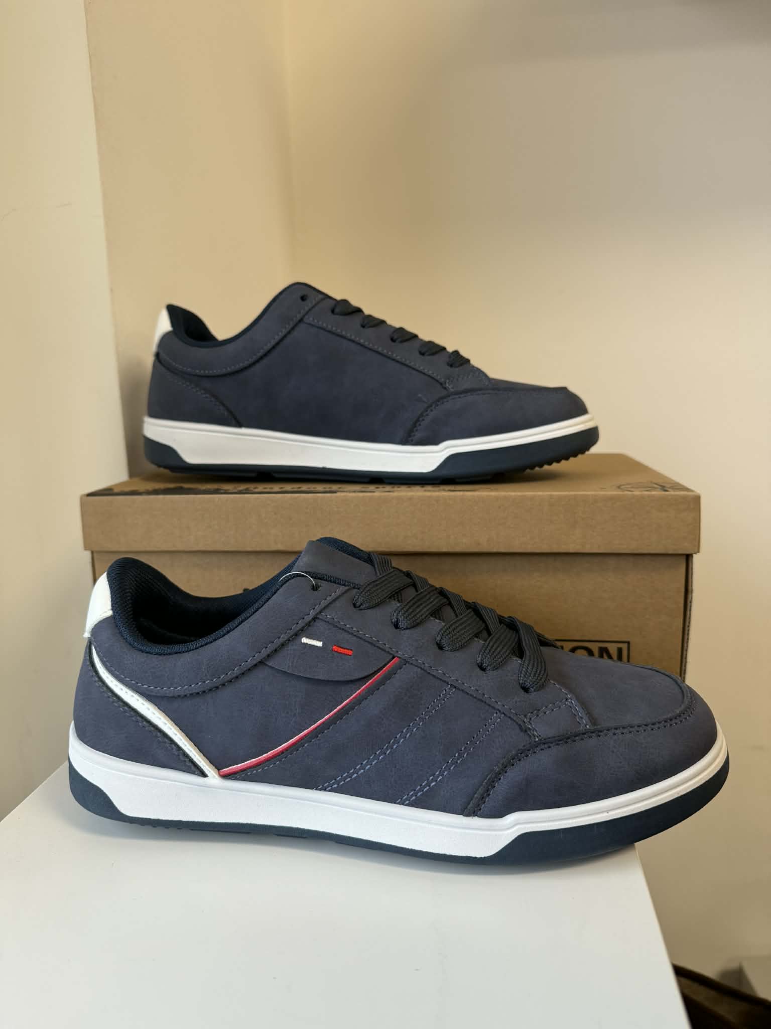 Sapatilha masculina em pele sintética. Sola rasa. Em camel, com atacadores. Da marca Innovation.