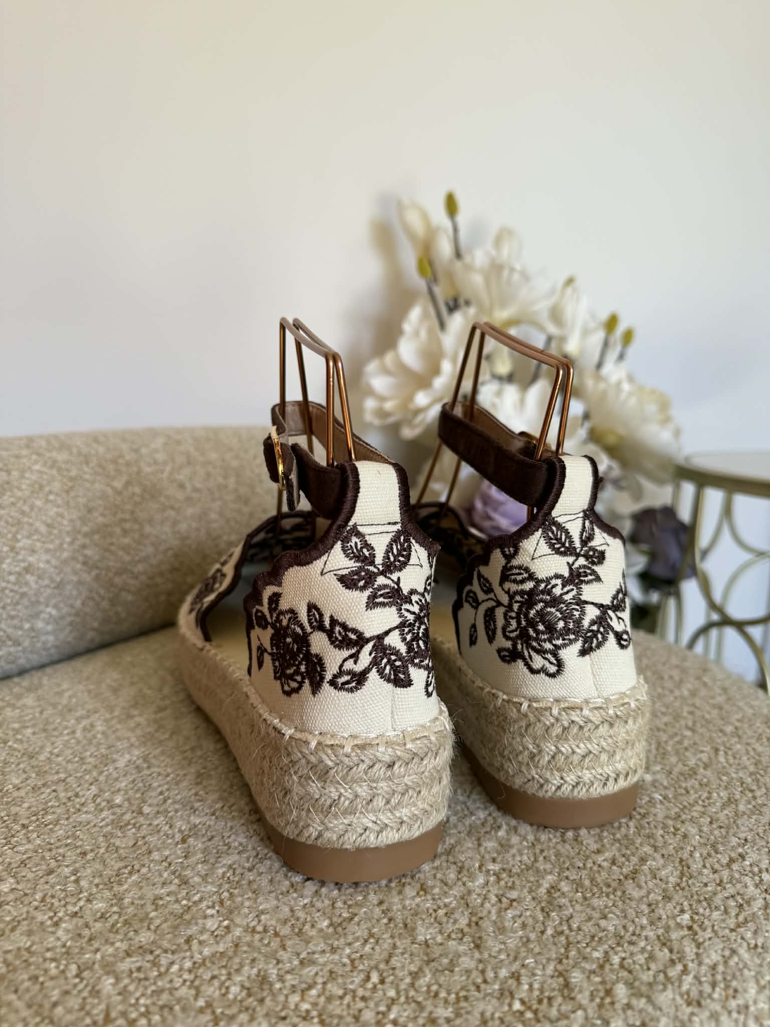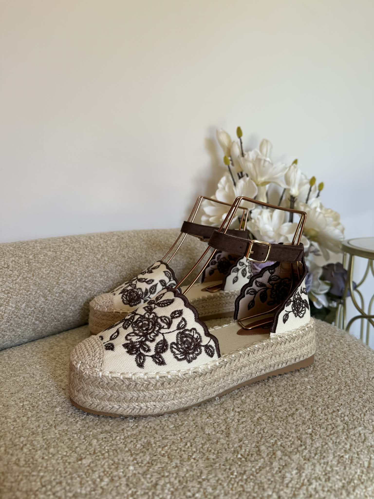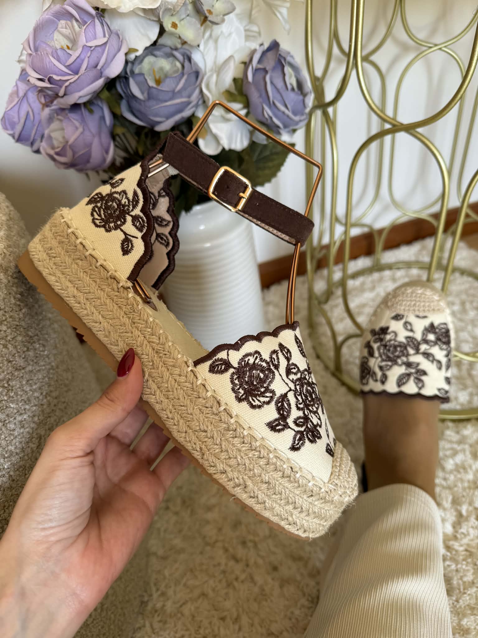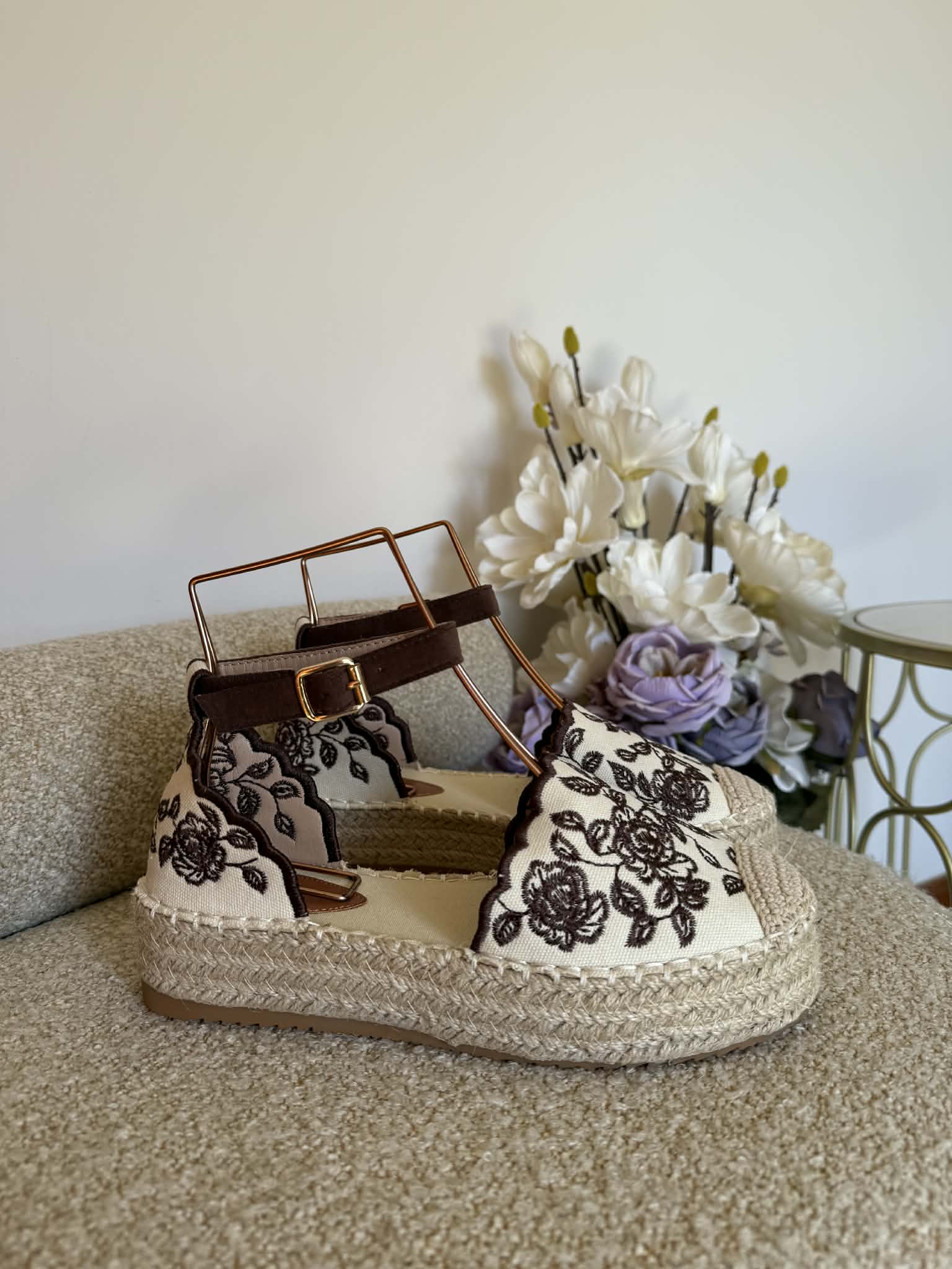 Sapato estilo alpercata. Com sola alta de cerca de 4cm de altura, forrada a corda. Aberto nas laterais. Tira com fivela ajustável no tornozelo. Bordado florido castanho.