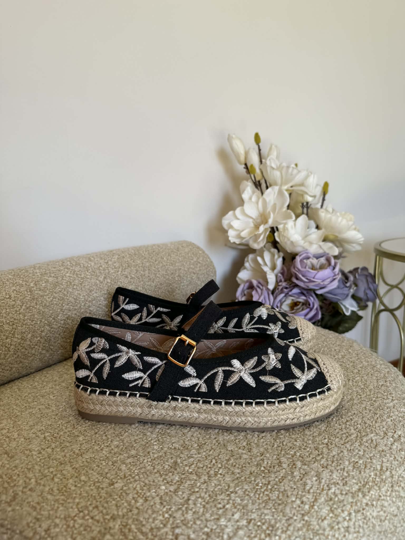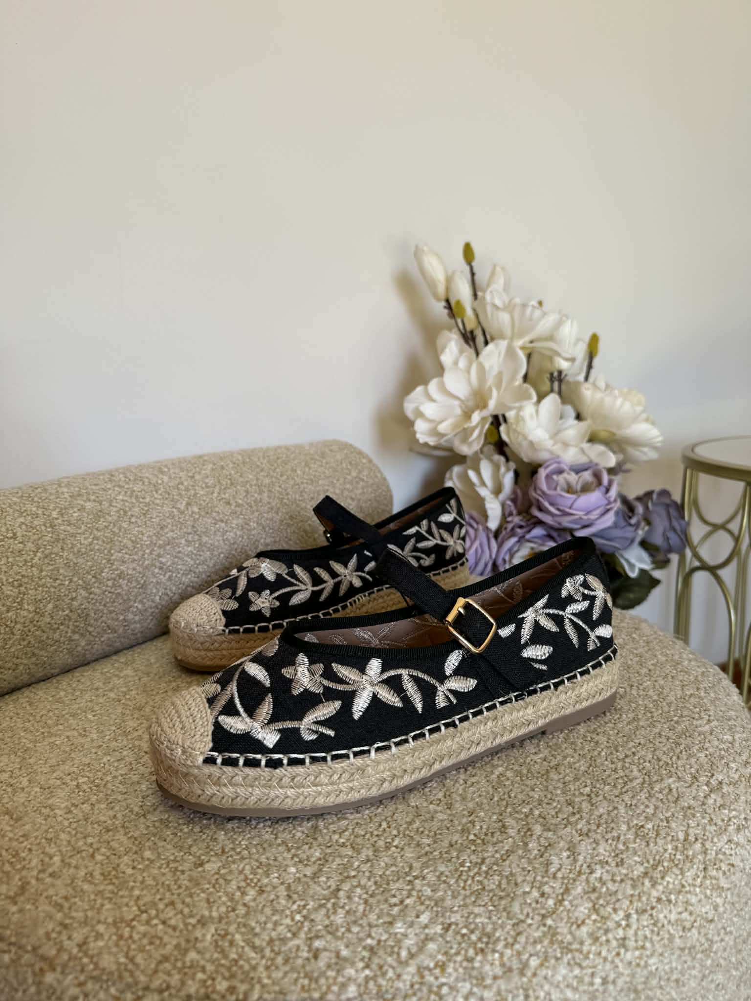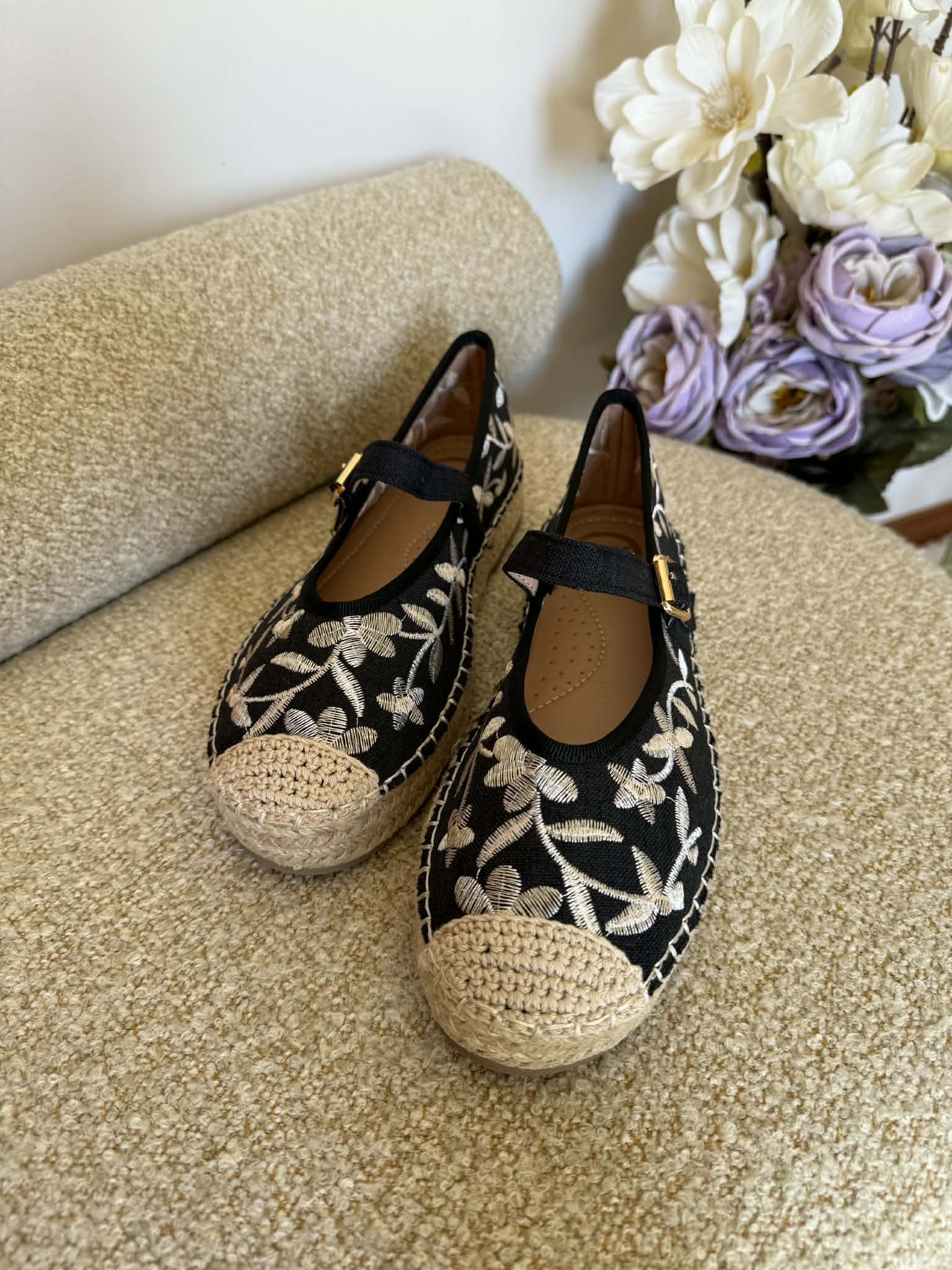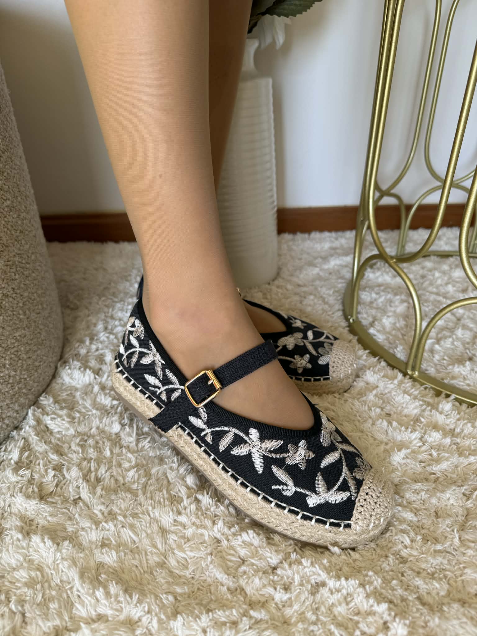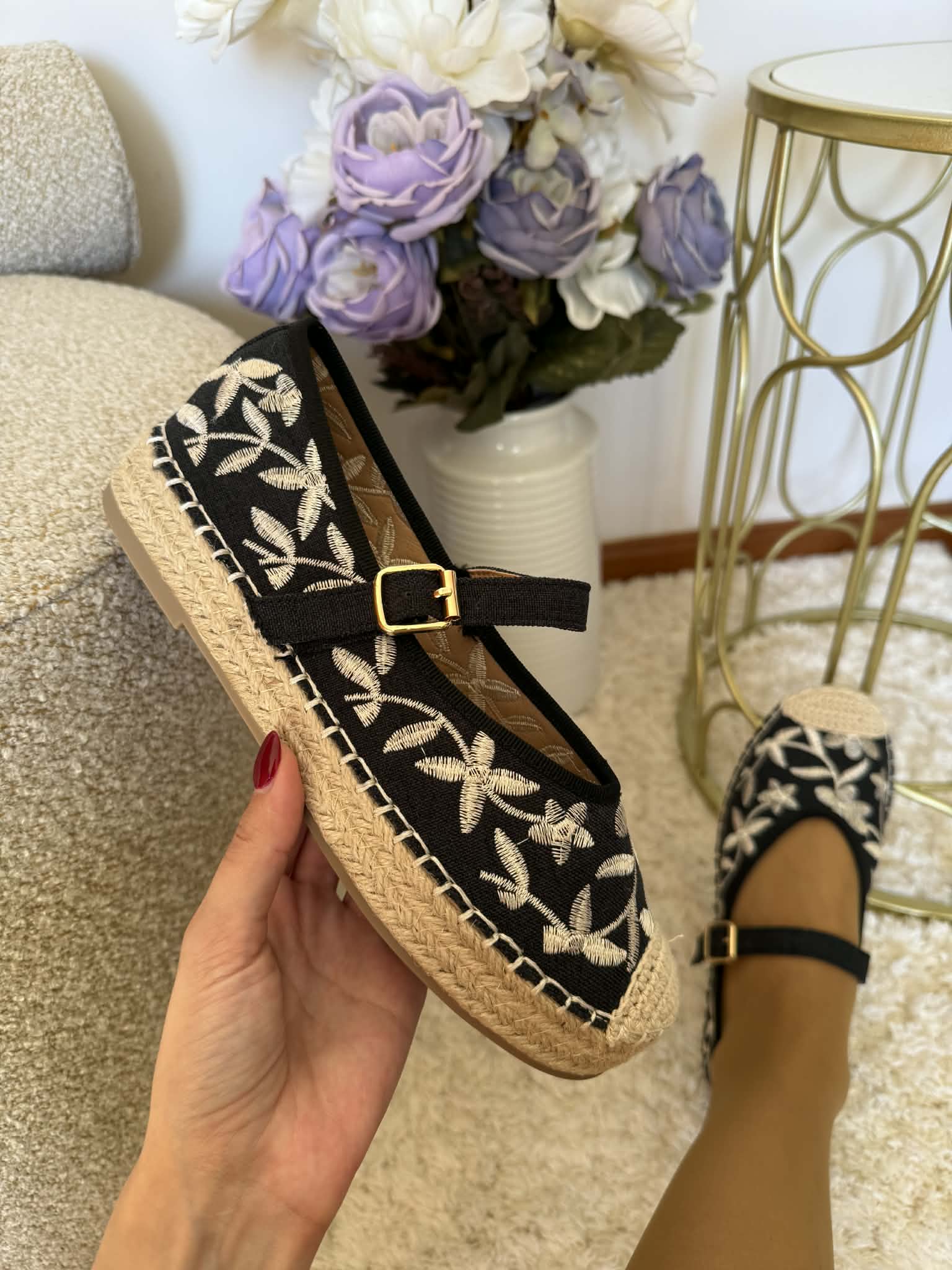 Sapato feminino, estipo alpercata. Com sola rasa forrada a corda. Detalhes floridos bordados. Com fivela ajustável no peito do pé.