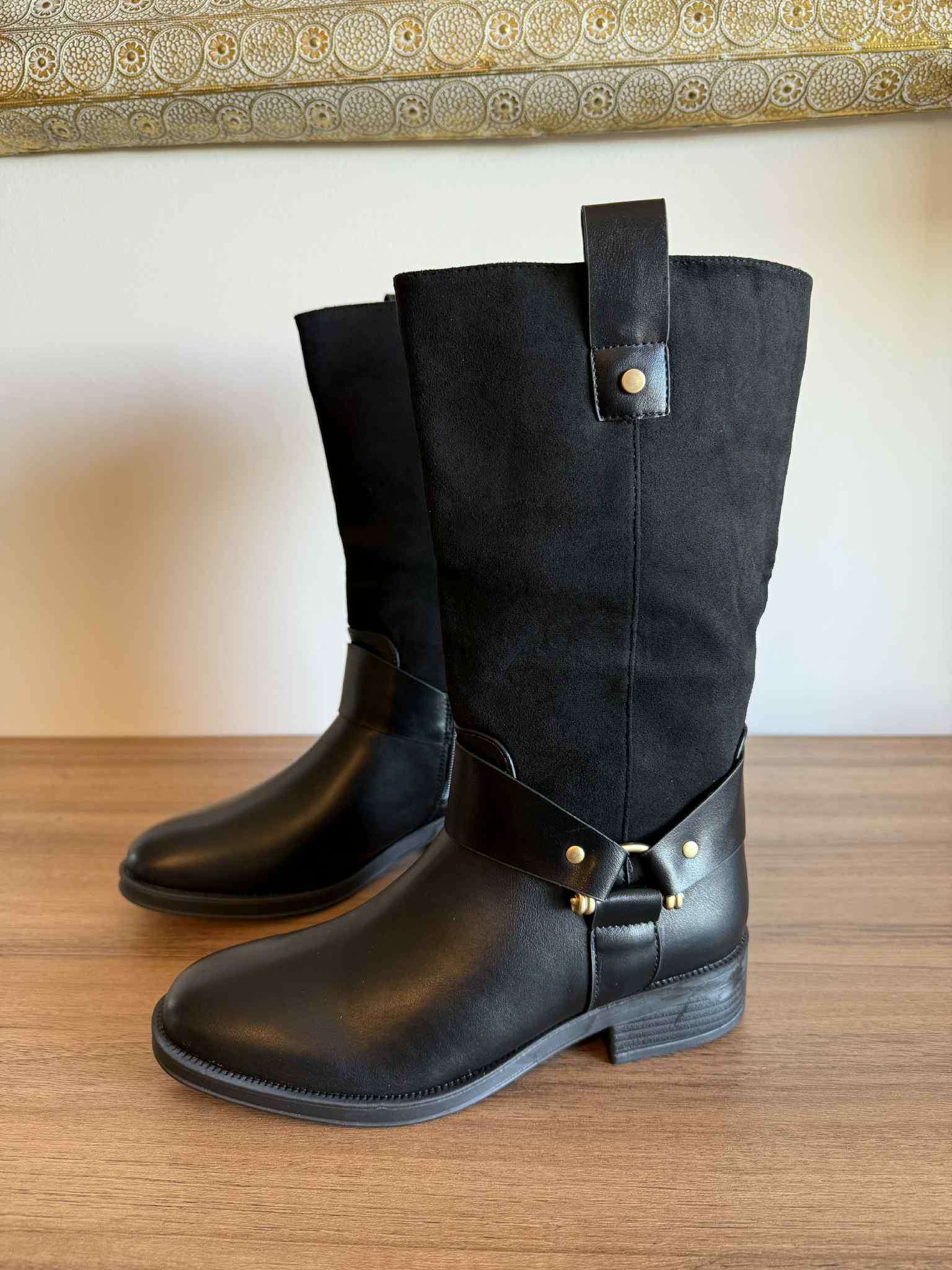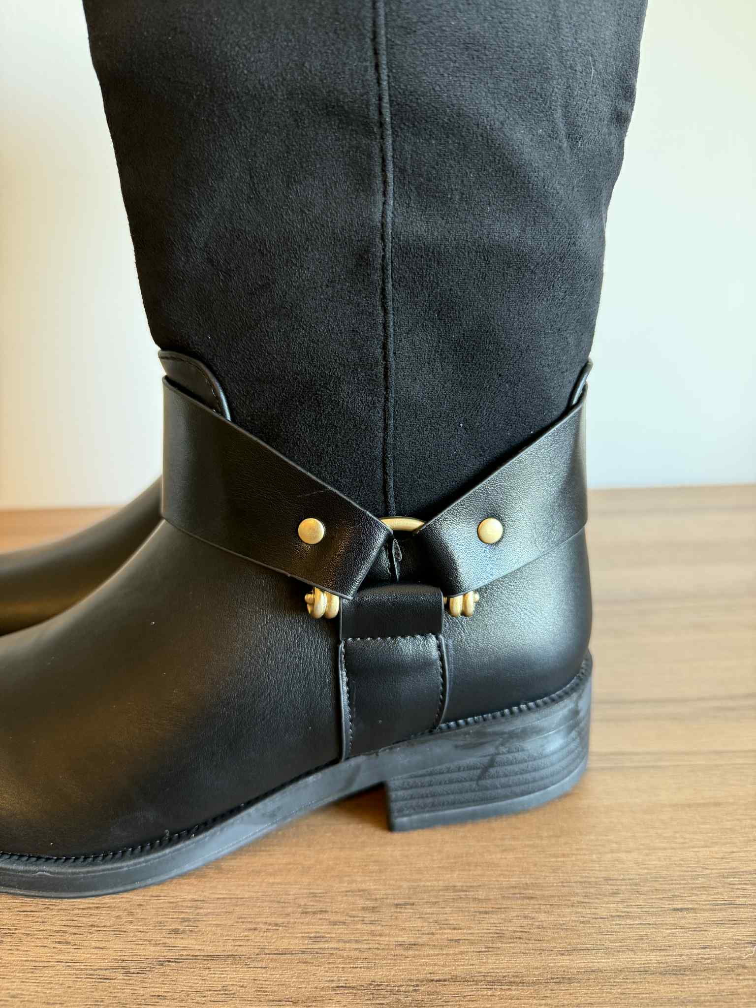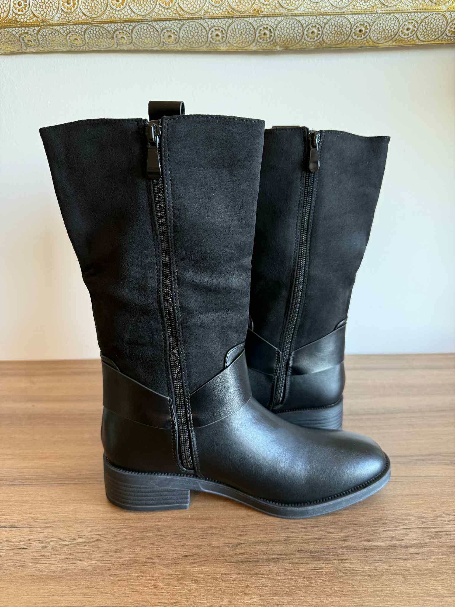 Bota feminina, estilo cavaleiro, com cano médio. Tem fecho. Pele sintética na zona do pé e camurça sintética no cano.