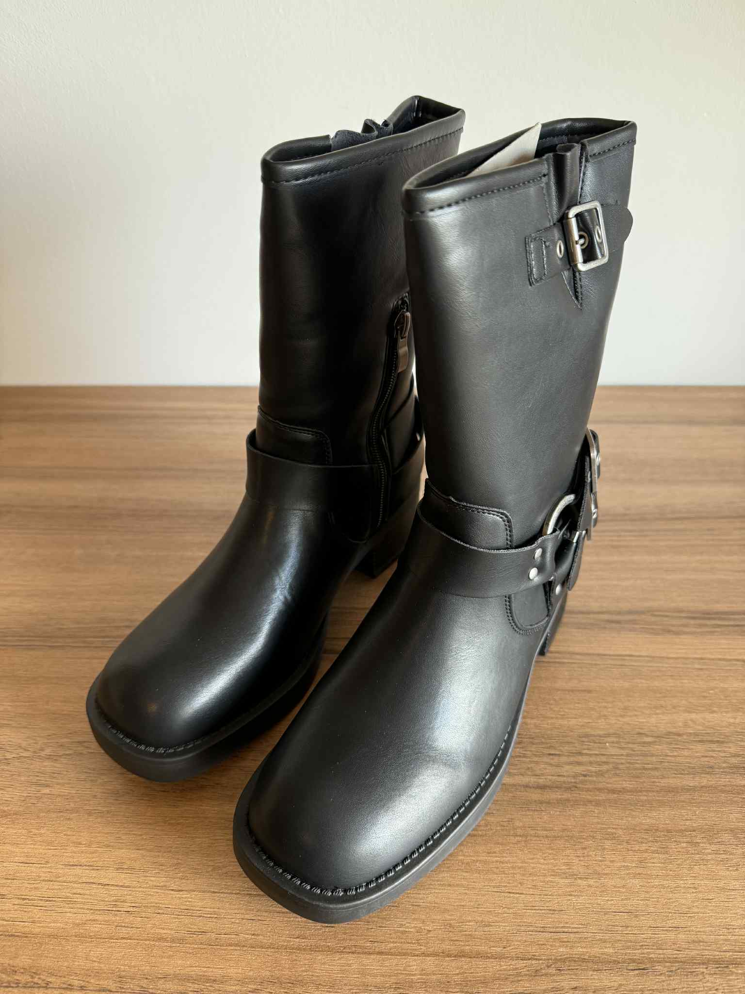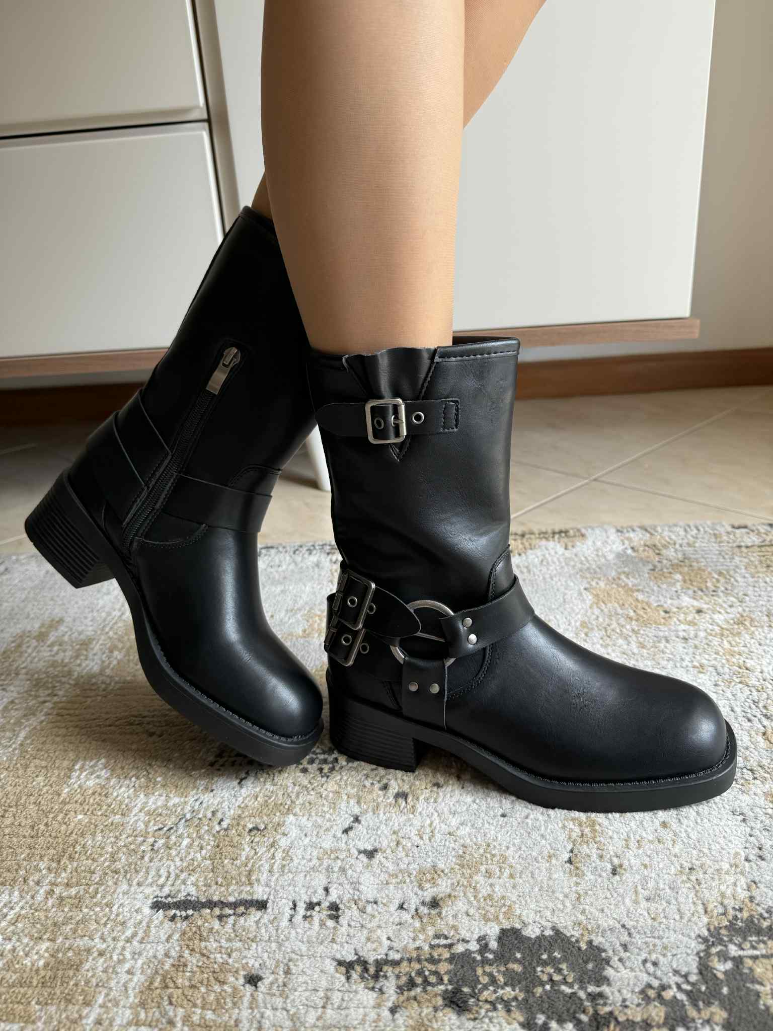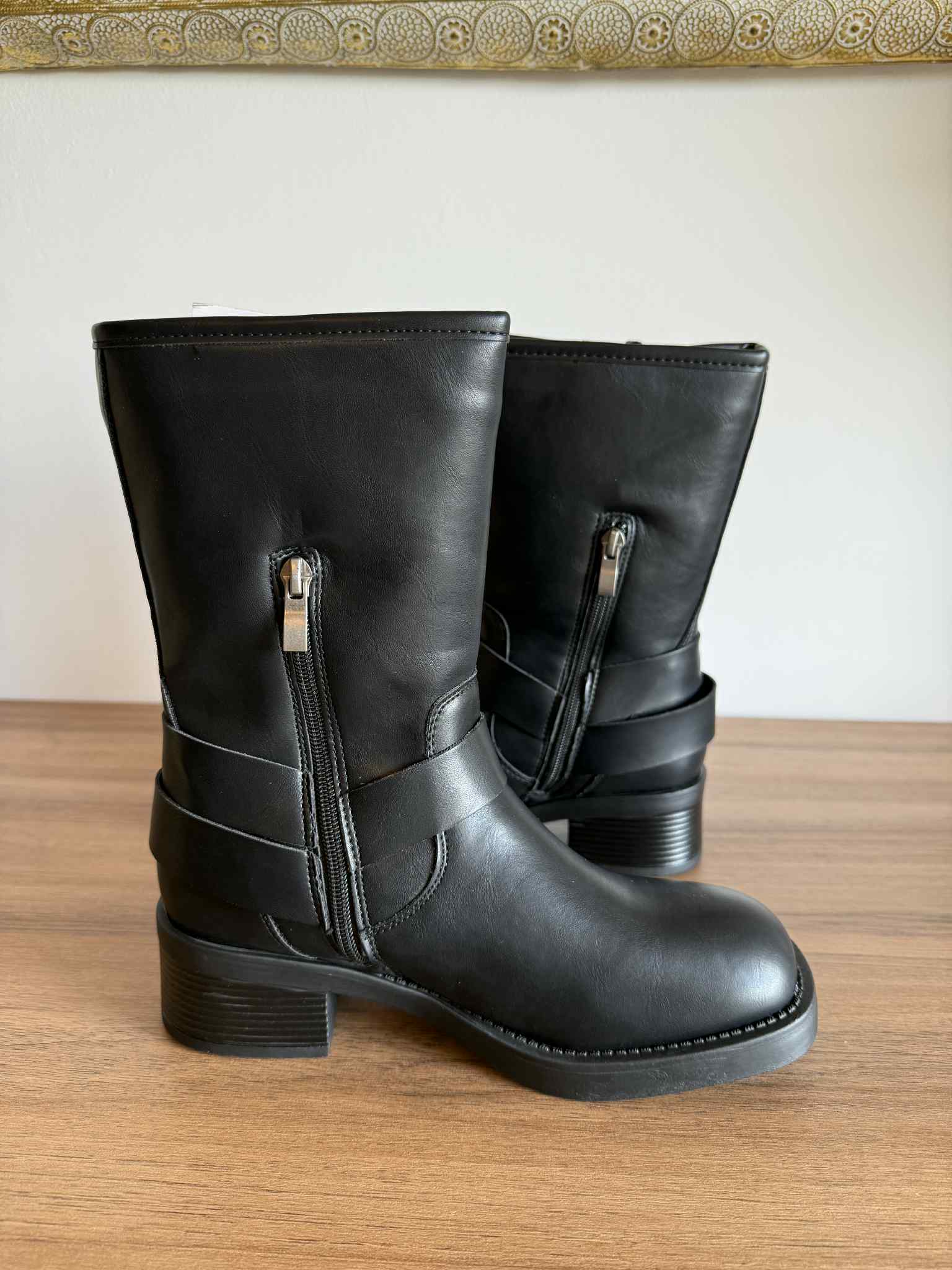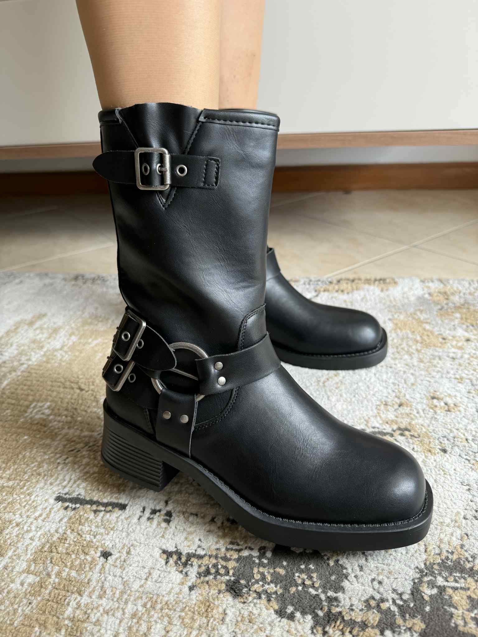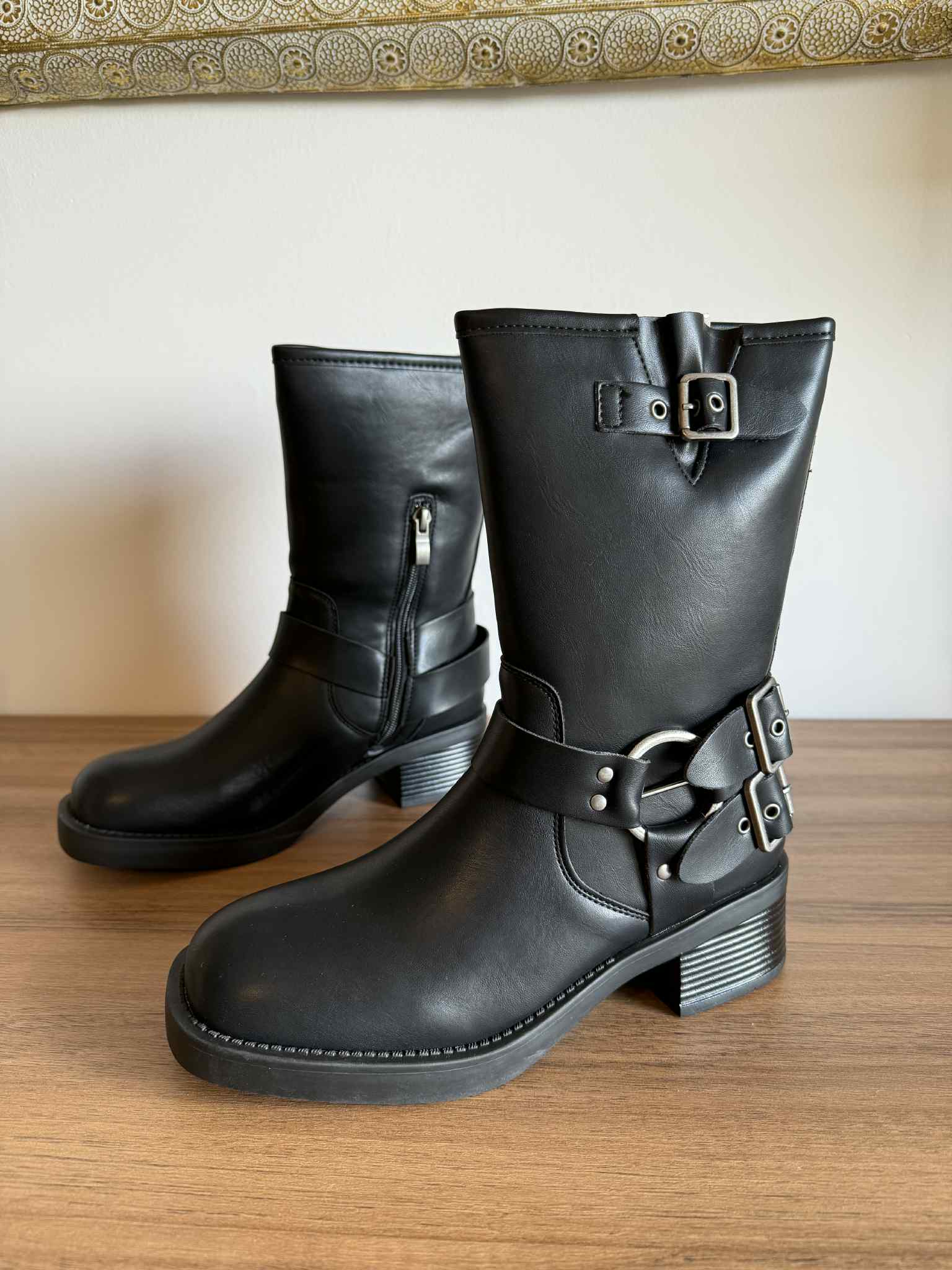 Bota feminina, estilo biker. Com detalhes metálicos e fivelas. Tem fecho. Em pele sintética.
