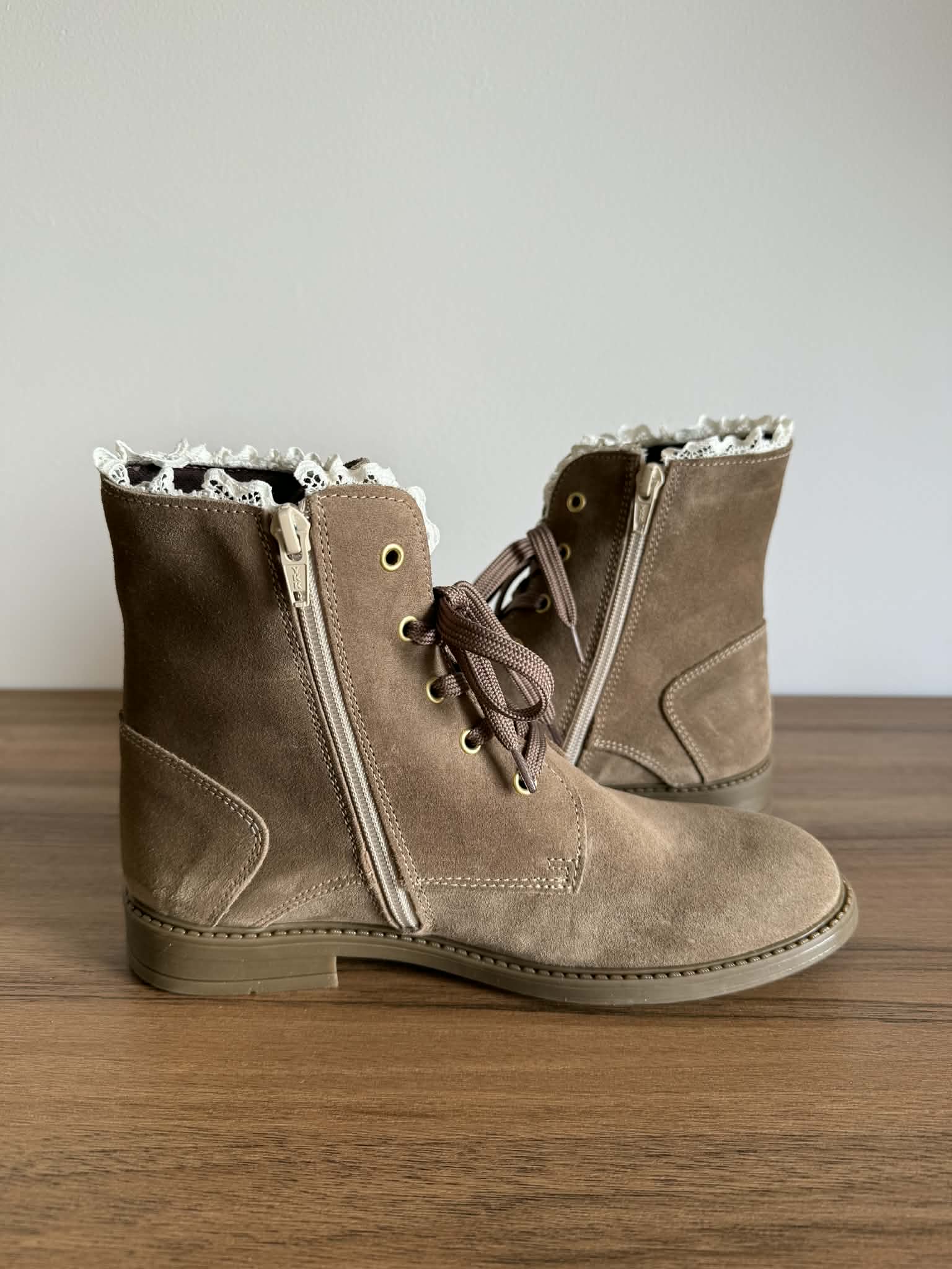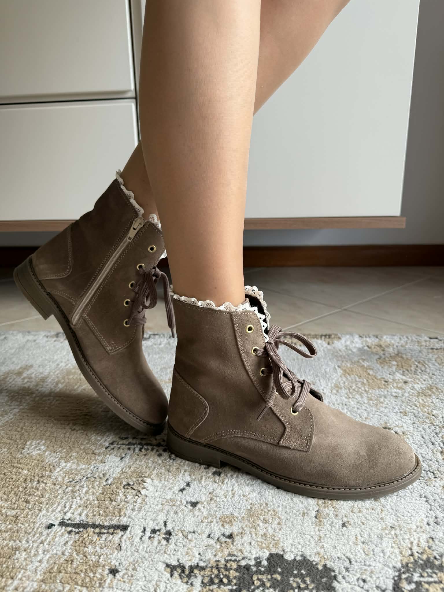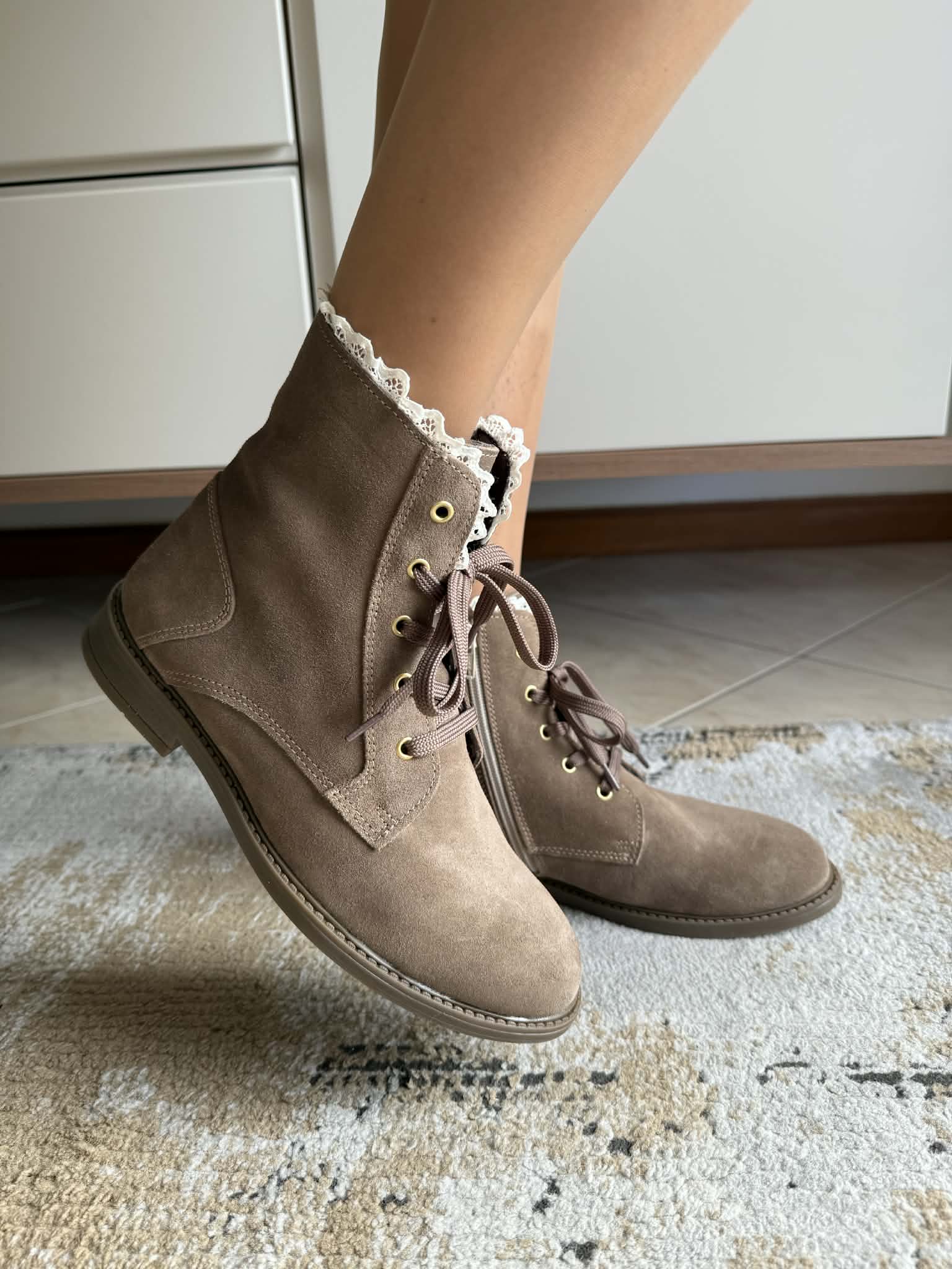 Bota fabricada em portugal, em camurça genuína. Com fecho e atacador. Detalhe de rendinha decorativa.