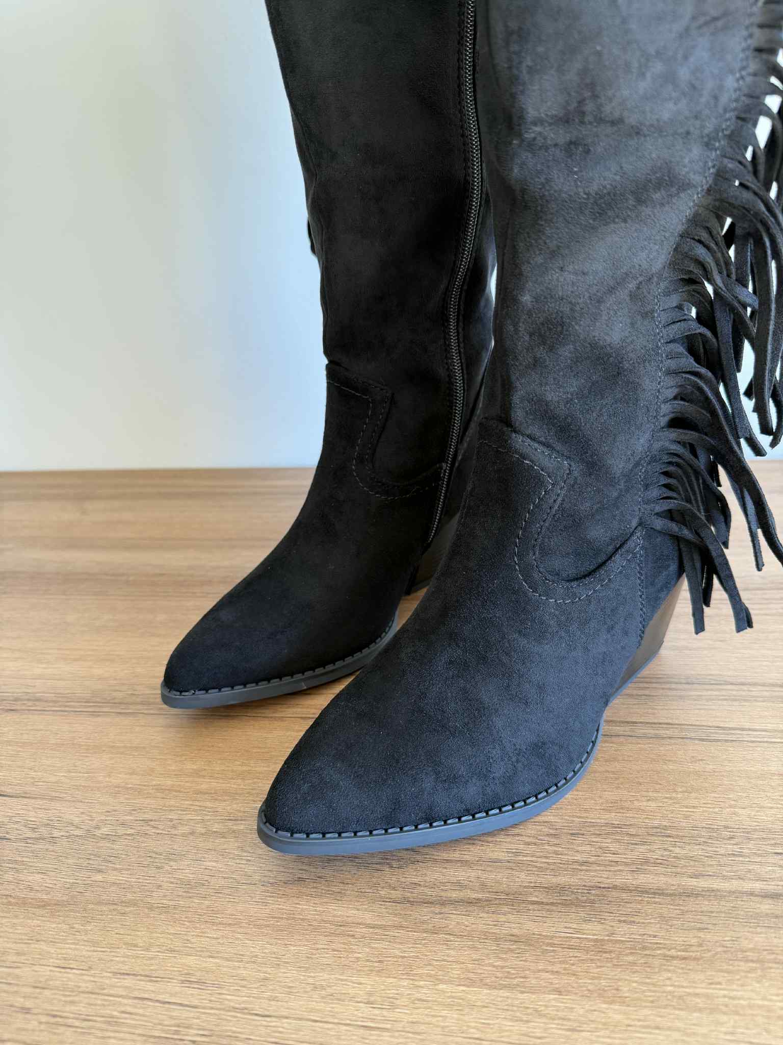 Bota de cano alto bicuda, estilo texana, em camurça sintética. Com detalhe de franjinhas no camo. Tem fecho. Tacão largo com 7cm de altura.