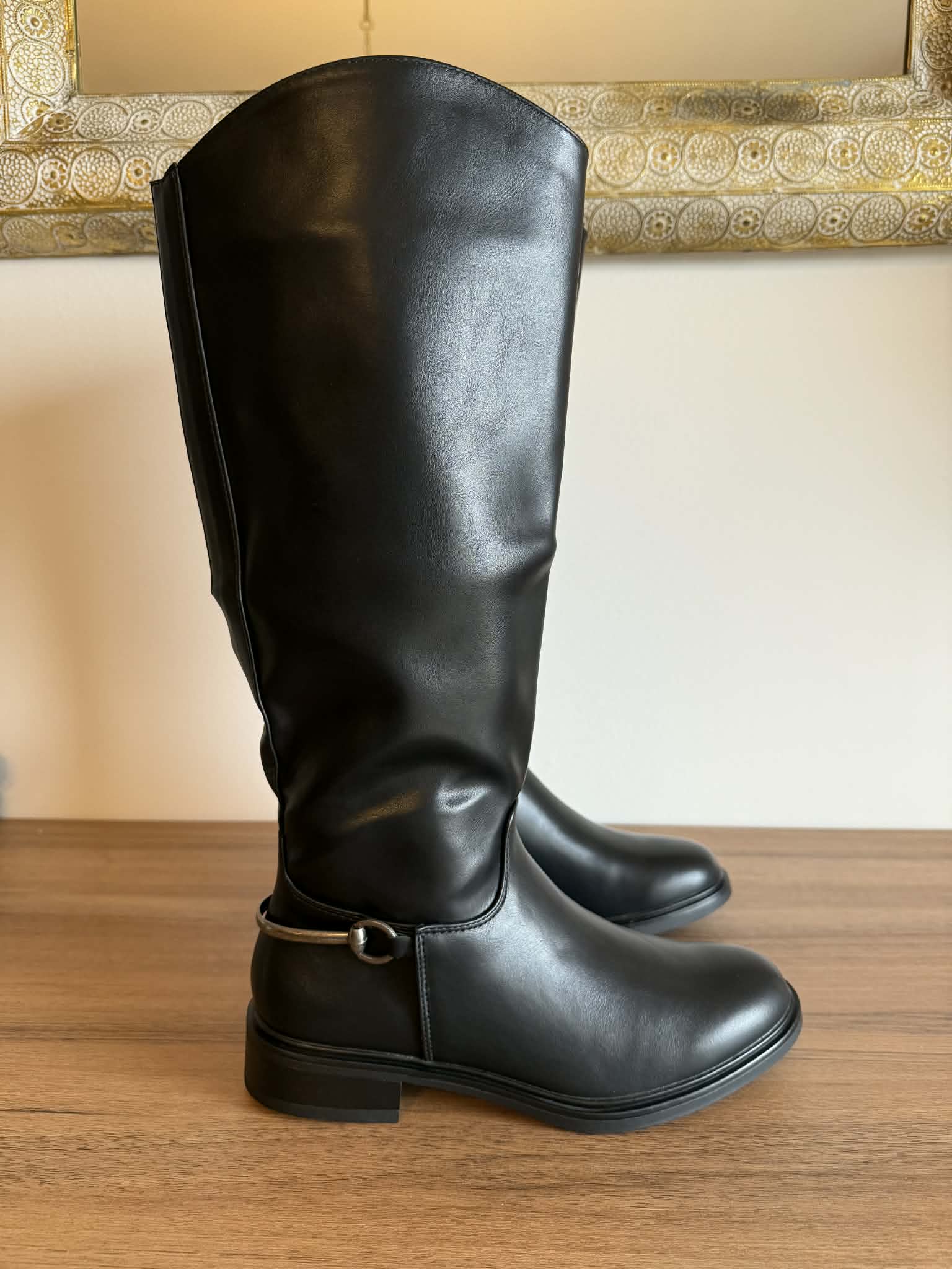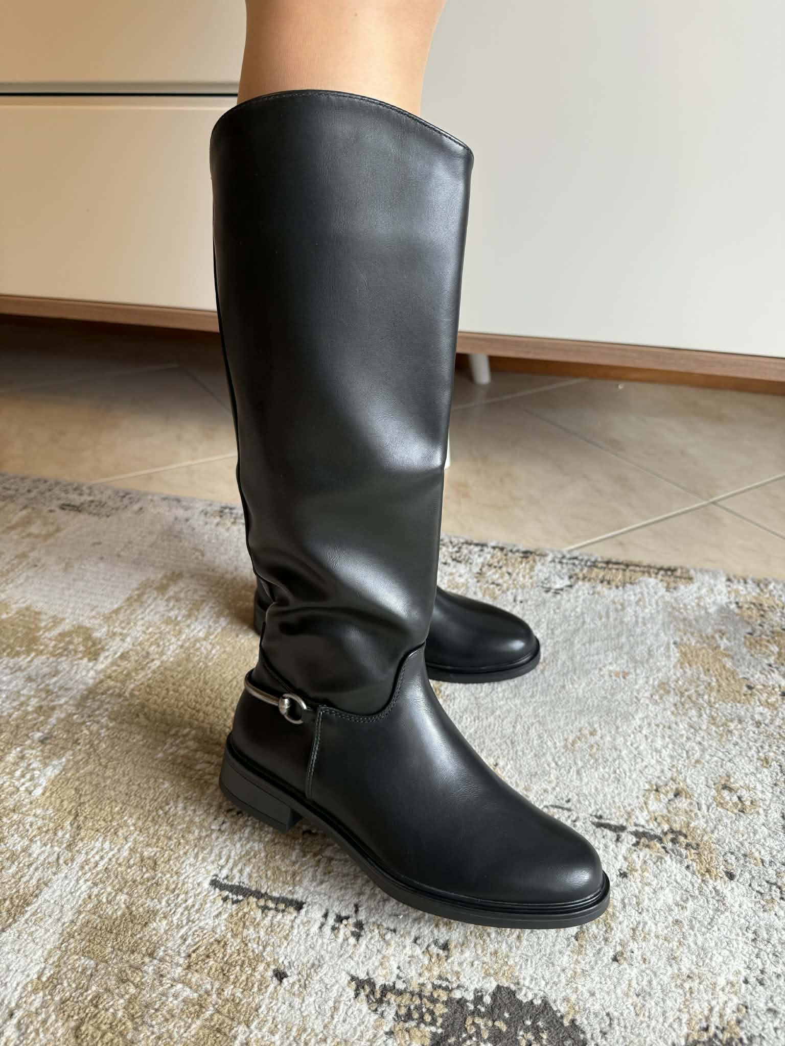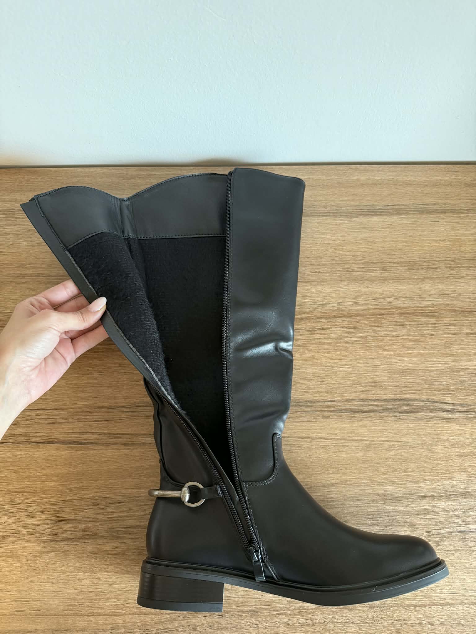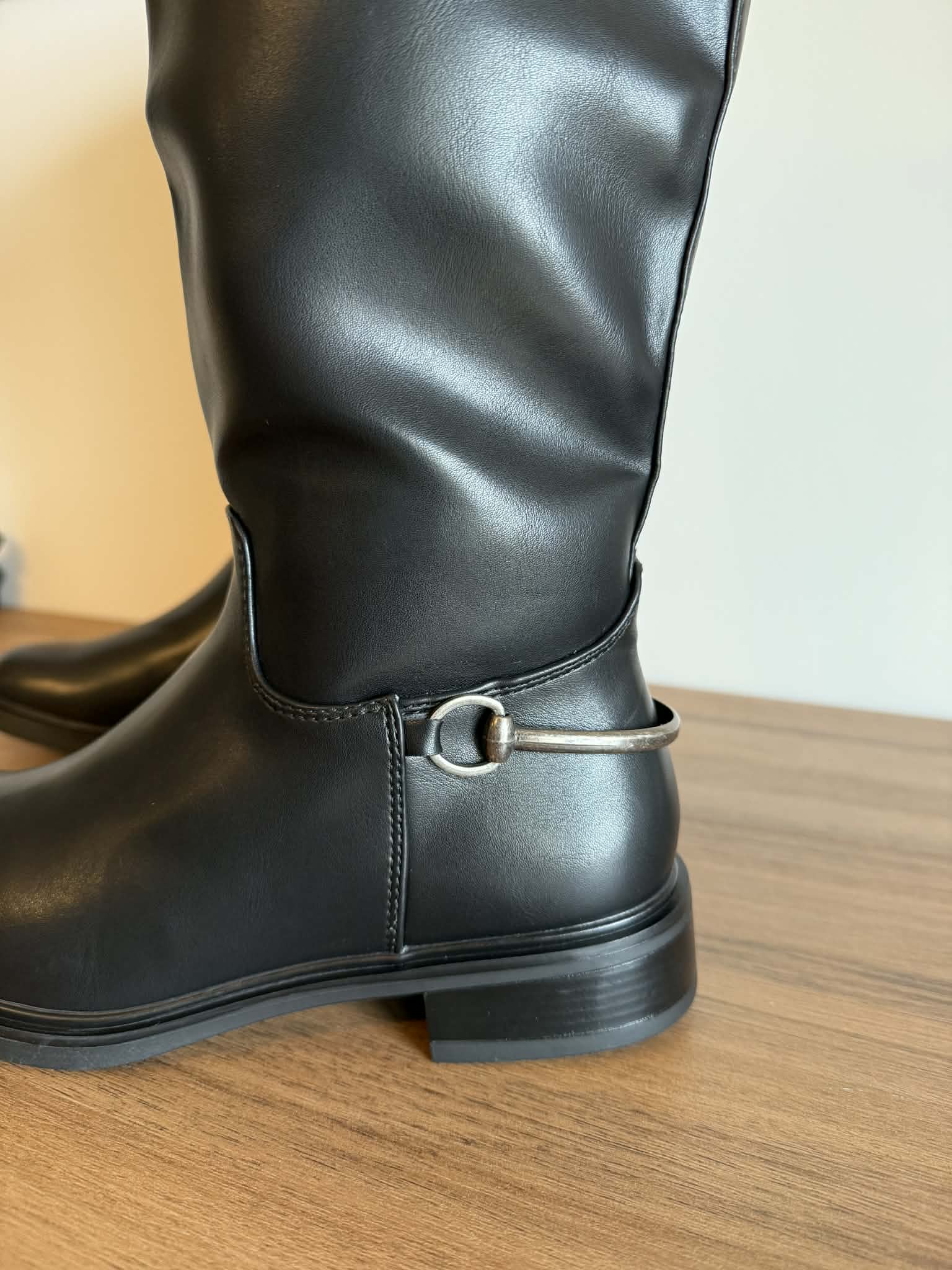 Bota de cano alto, em pele sintética. Com fecho. Sola baixa com apenas 3cm de altura. Detalhe decorativo metático no calcanhar. Biqueira arredondada.