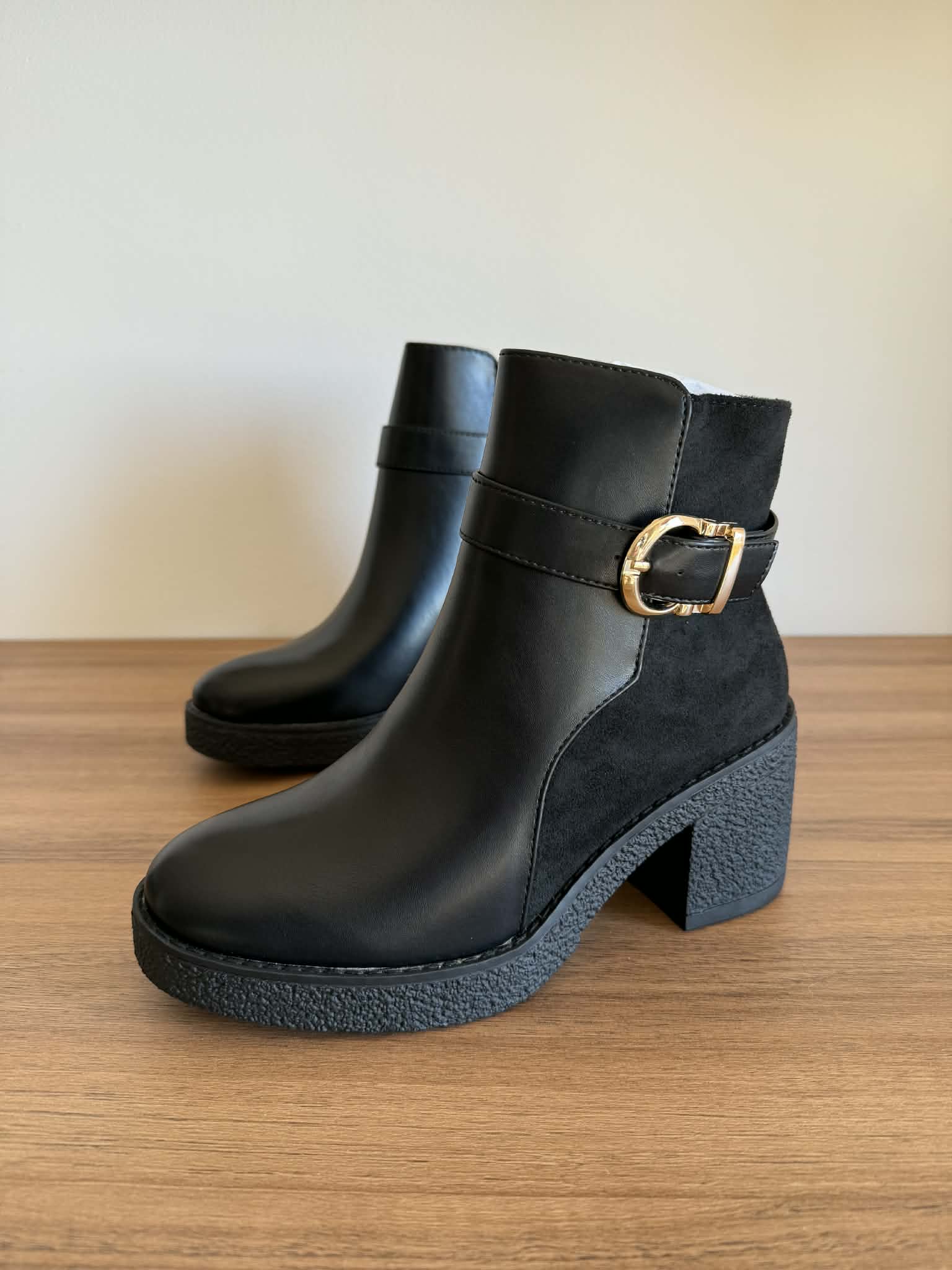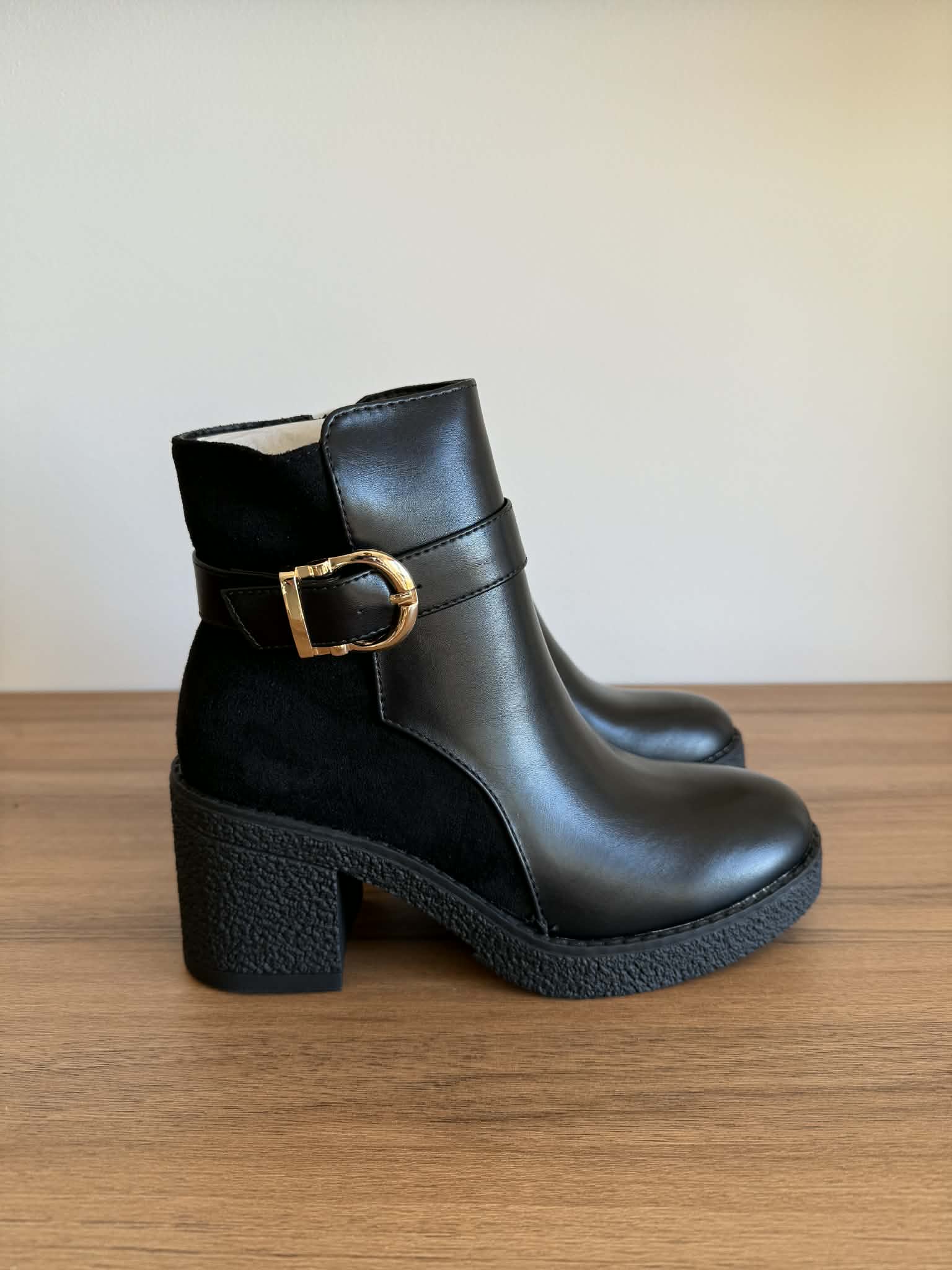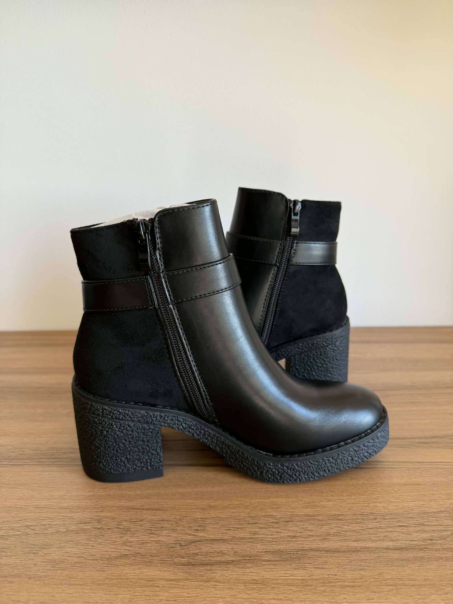 Bota em pele sintética na parte frontal e camurça sintética na zona do calcanhar e tornozelo. Com fecho. Salto bloco com 7cm de altura e 2cm de compensação.