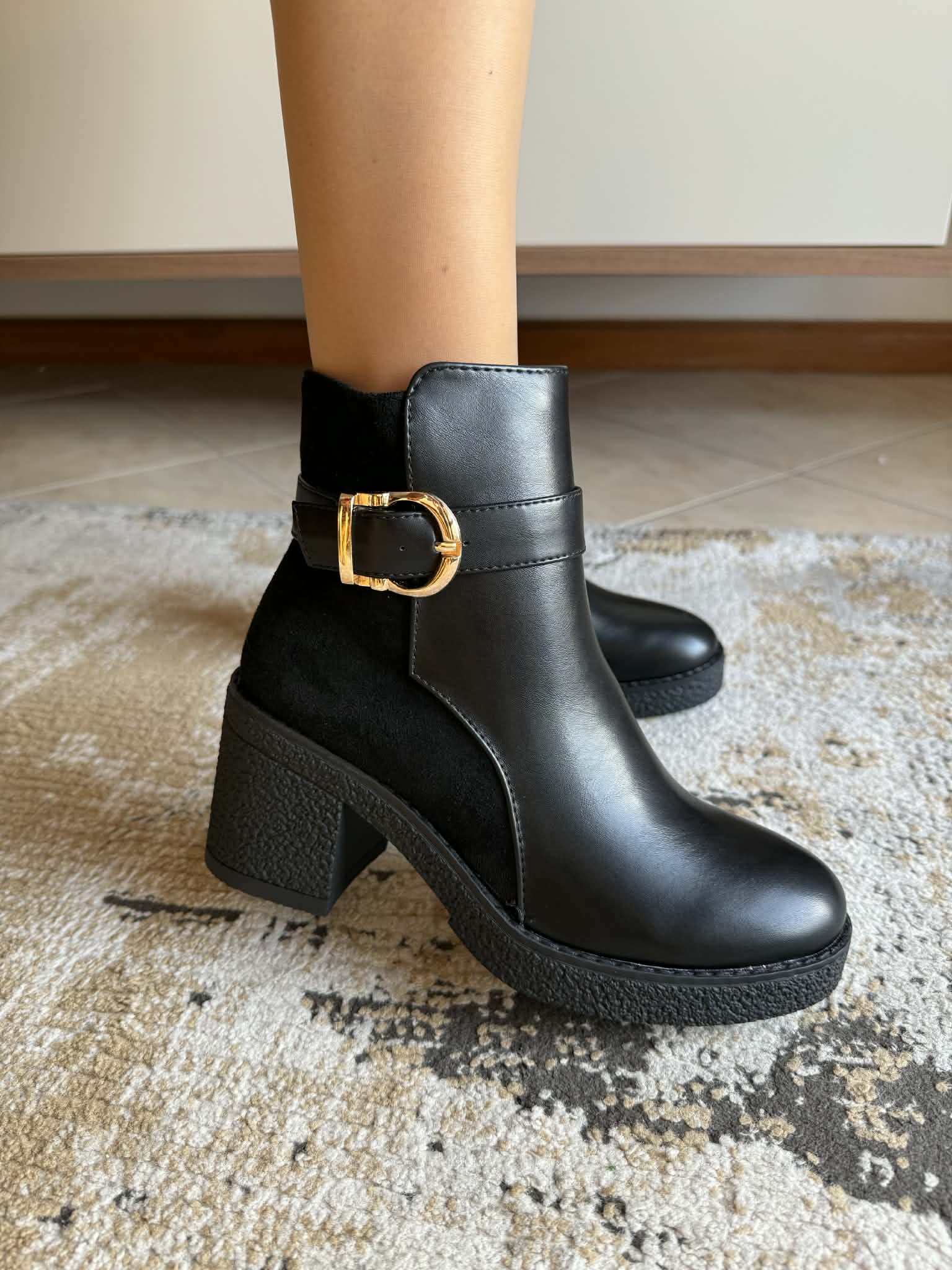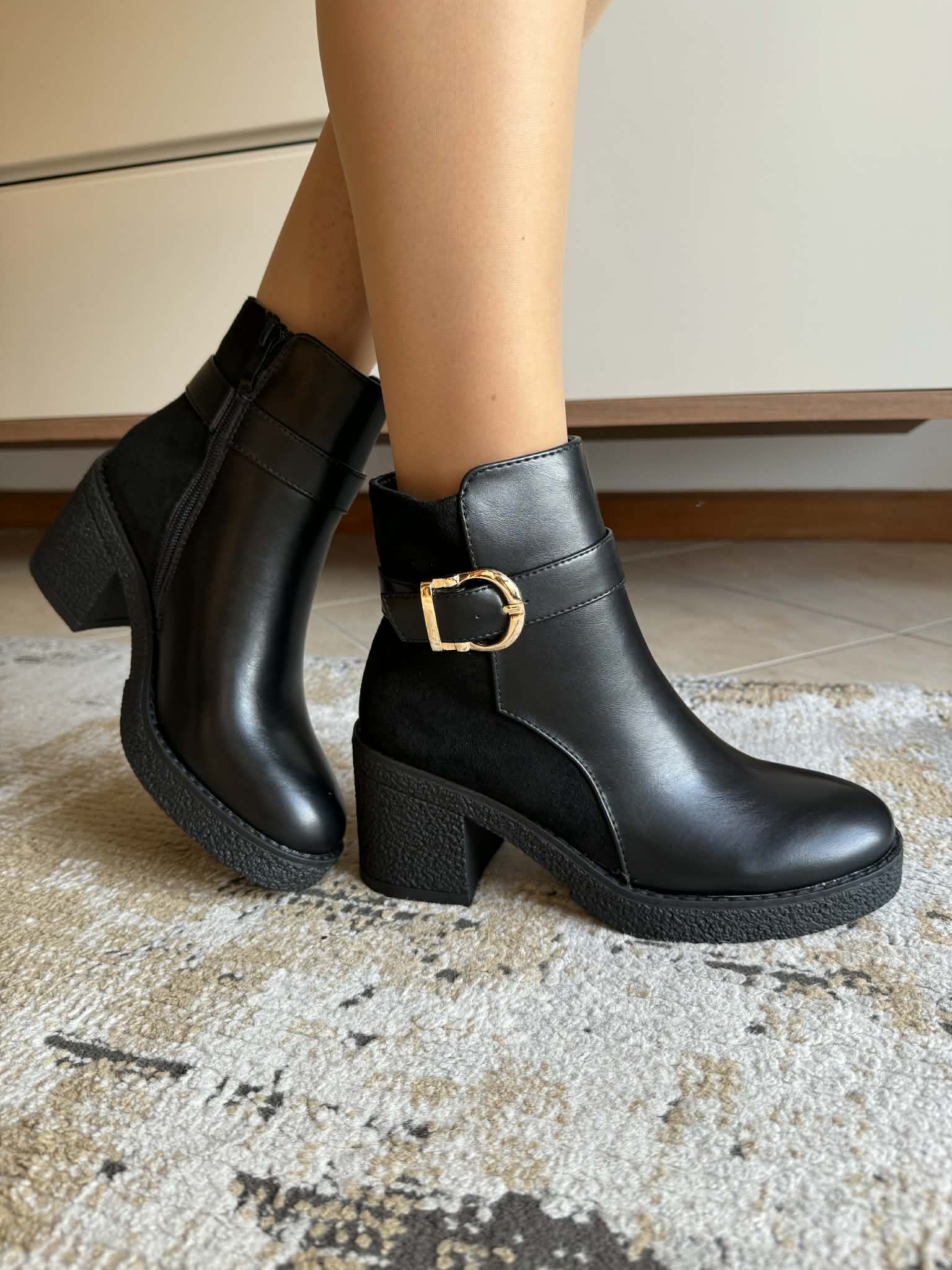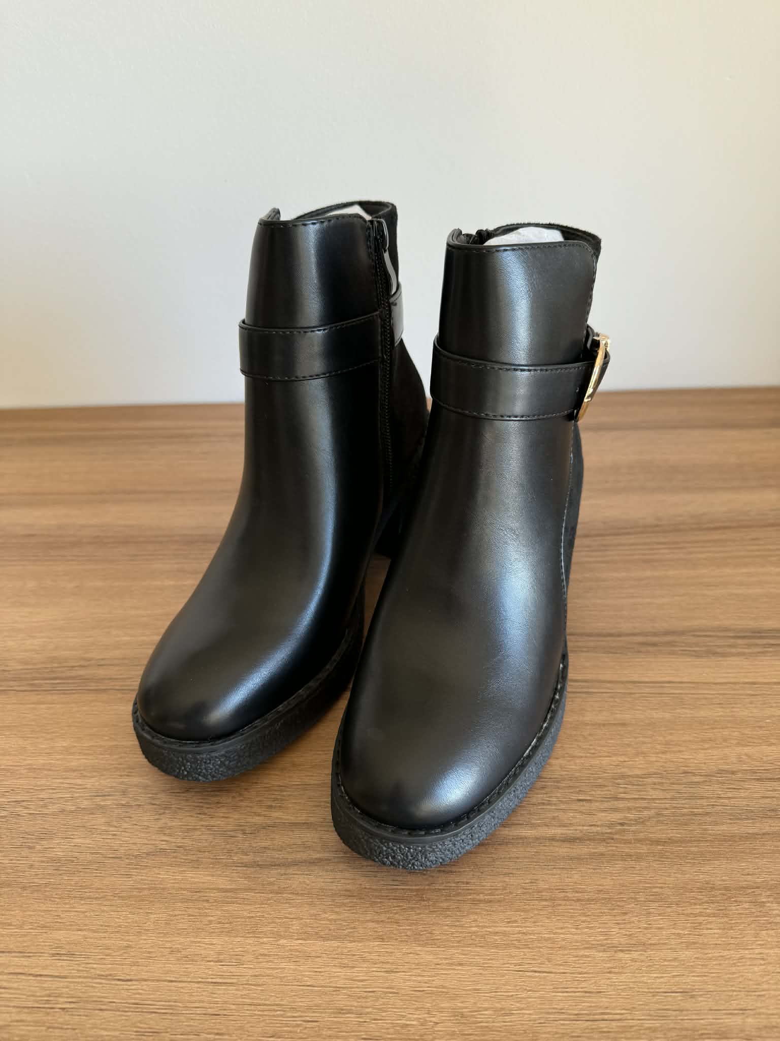 Bota em pele sintética na parte frontal e camurça sintética na zona do calcanhar e tornozelo. Com fecho. Salto bloco com 7cm de altura e 2cm de compensação.