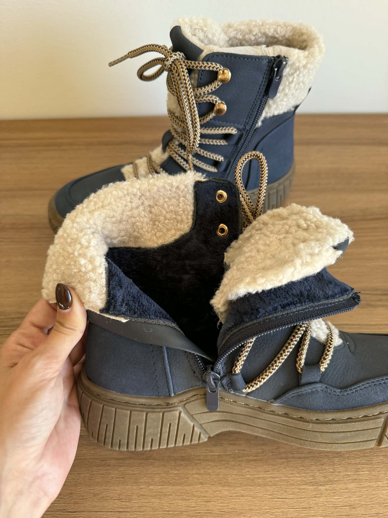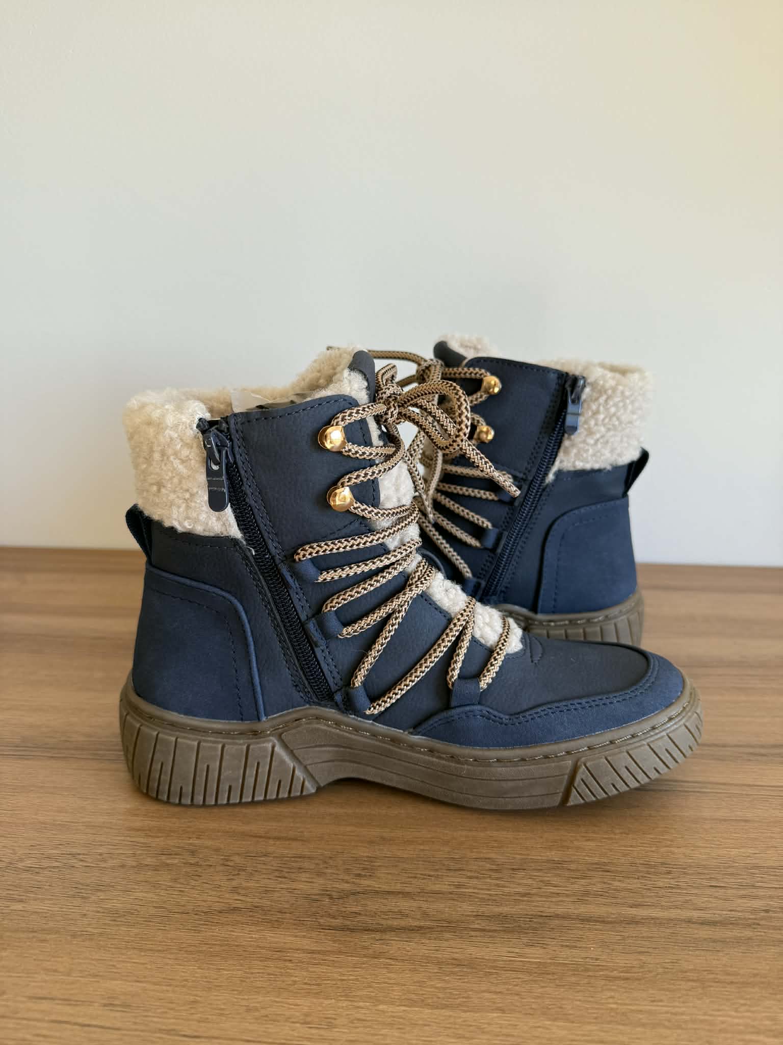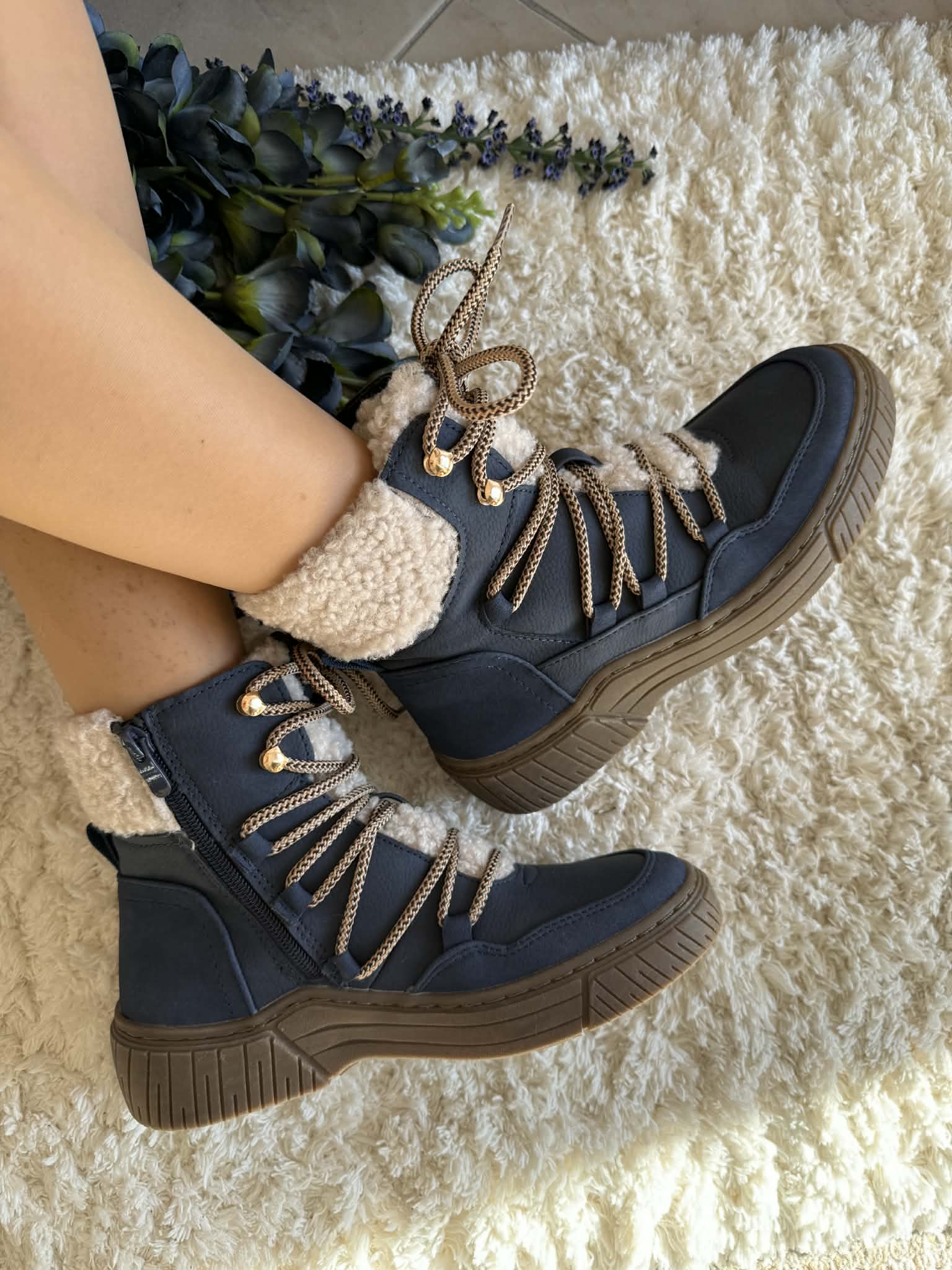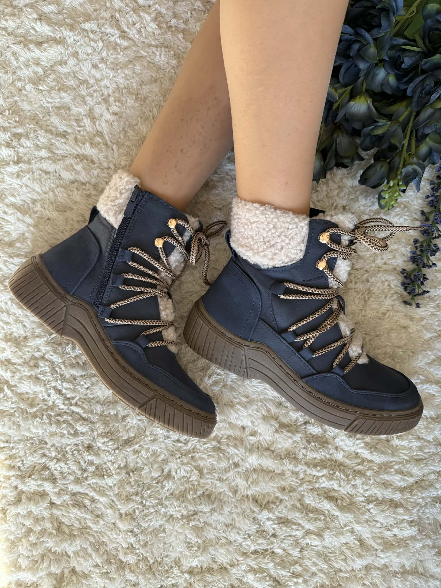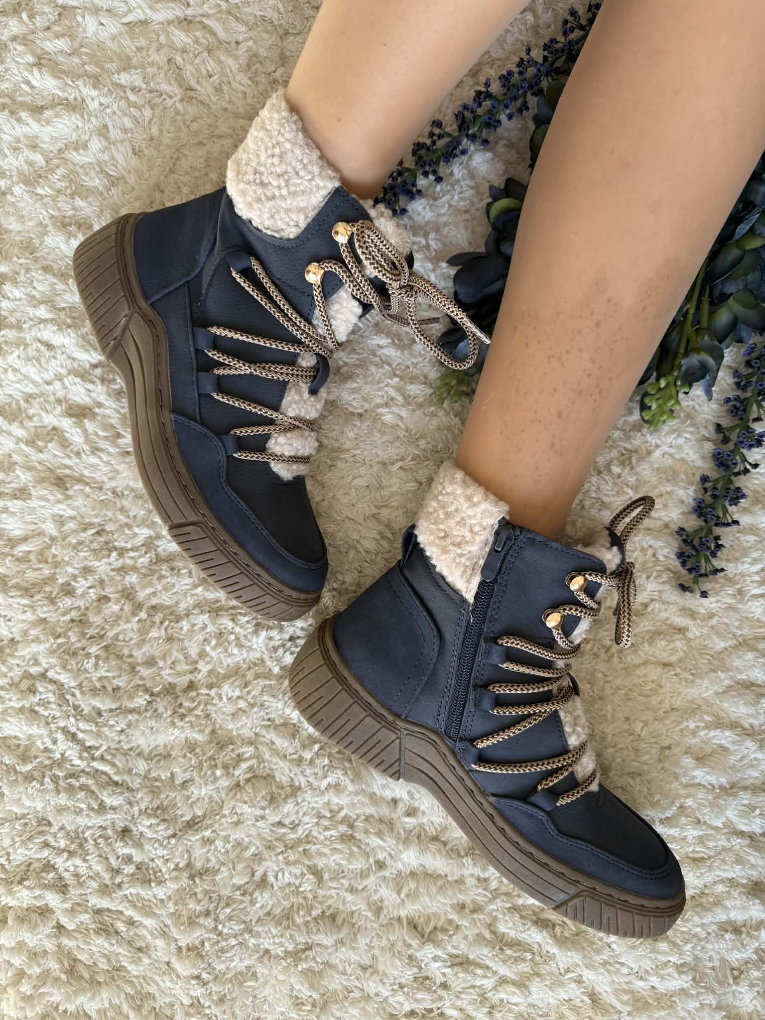 Bota com sola de borracha. Com fecho e atacador. Forradas a pelo. Detalhe no exterior tipo pelo de borrego. Em pele sintética.