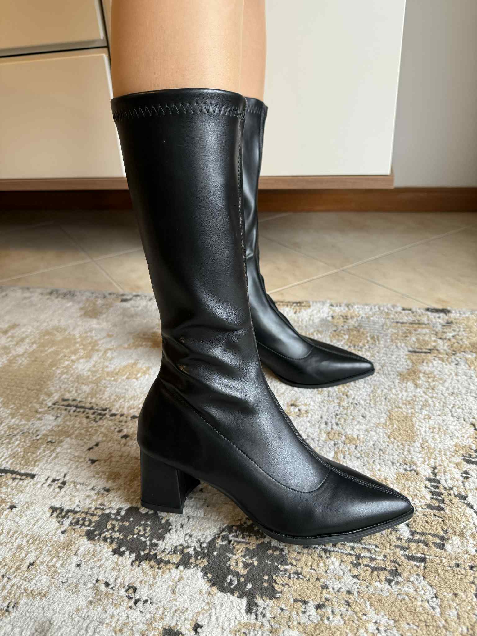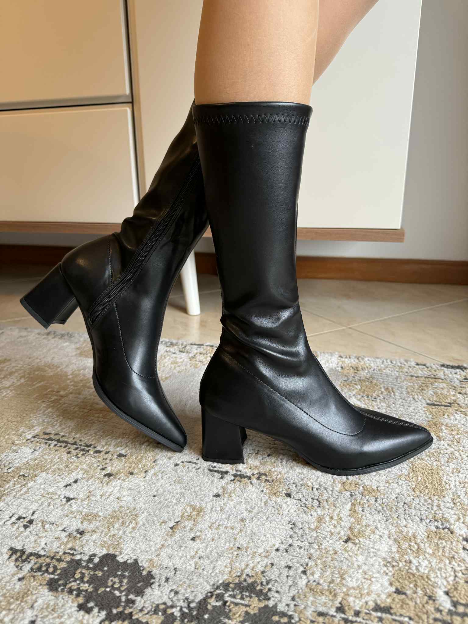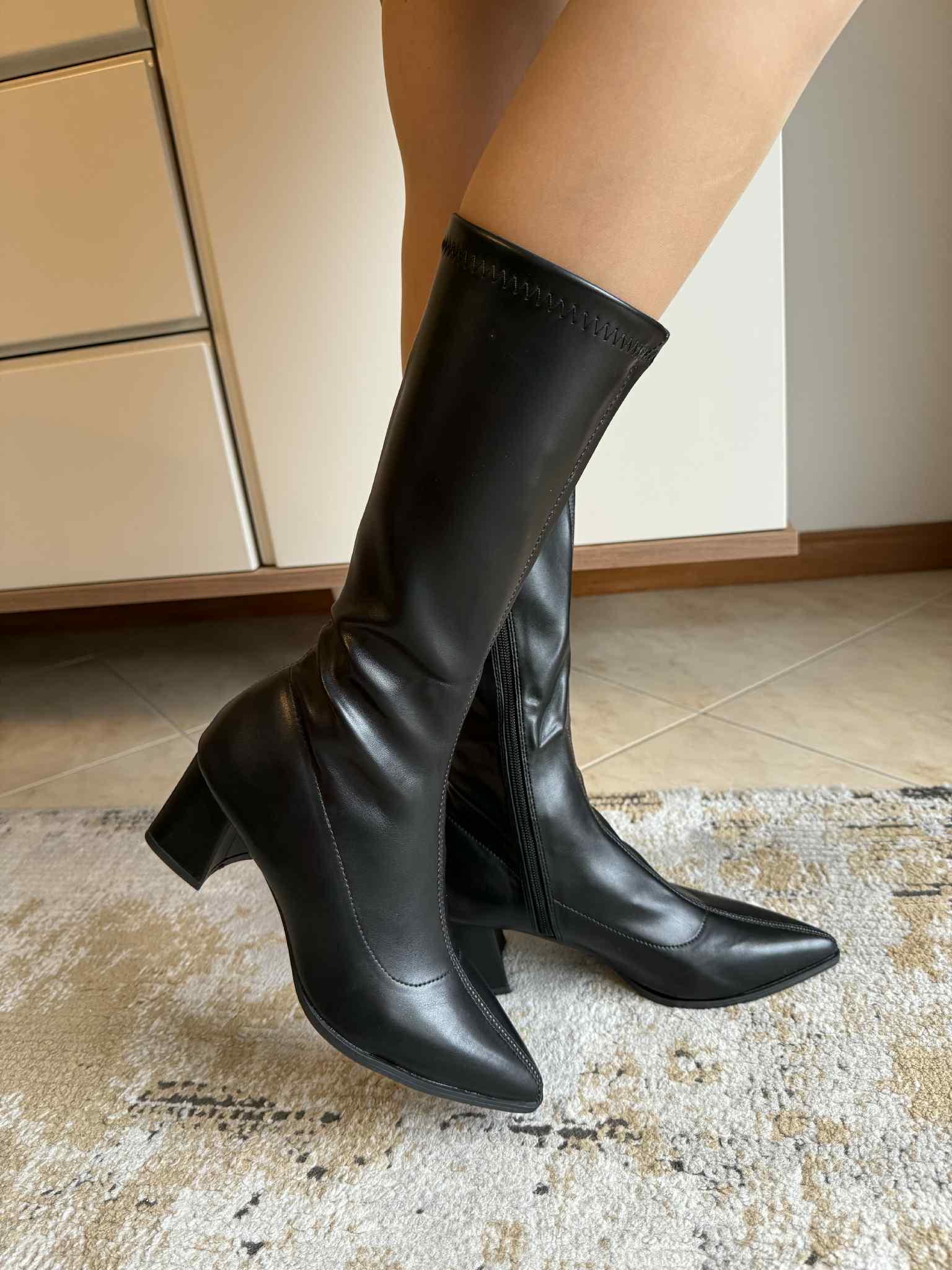 Botim feminino bicudo, com cano médio. Efeito pele. Com fecho. Salto largo com 6cm de altura.