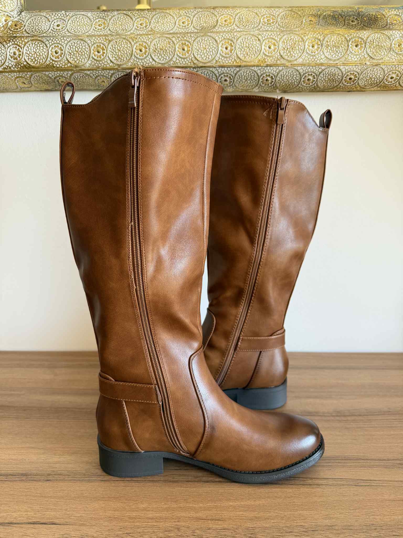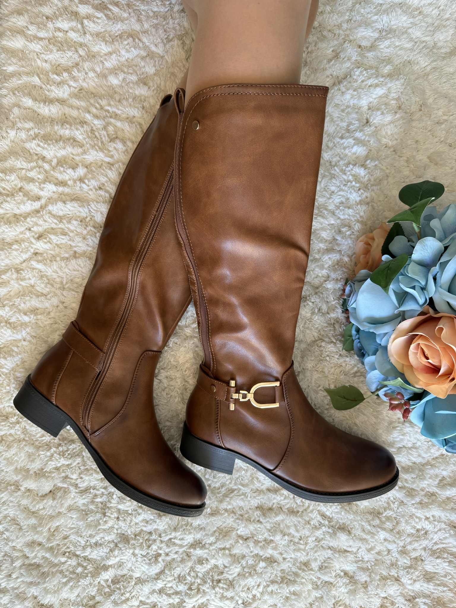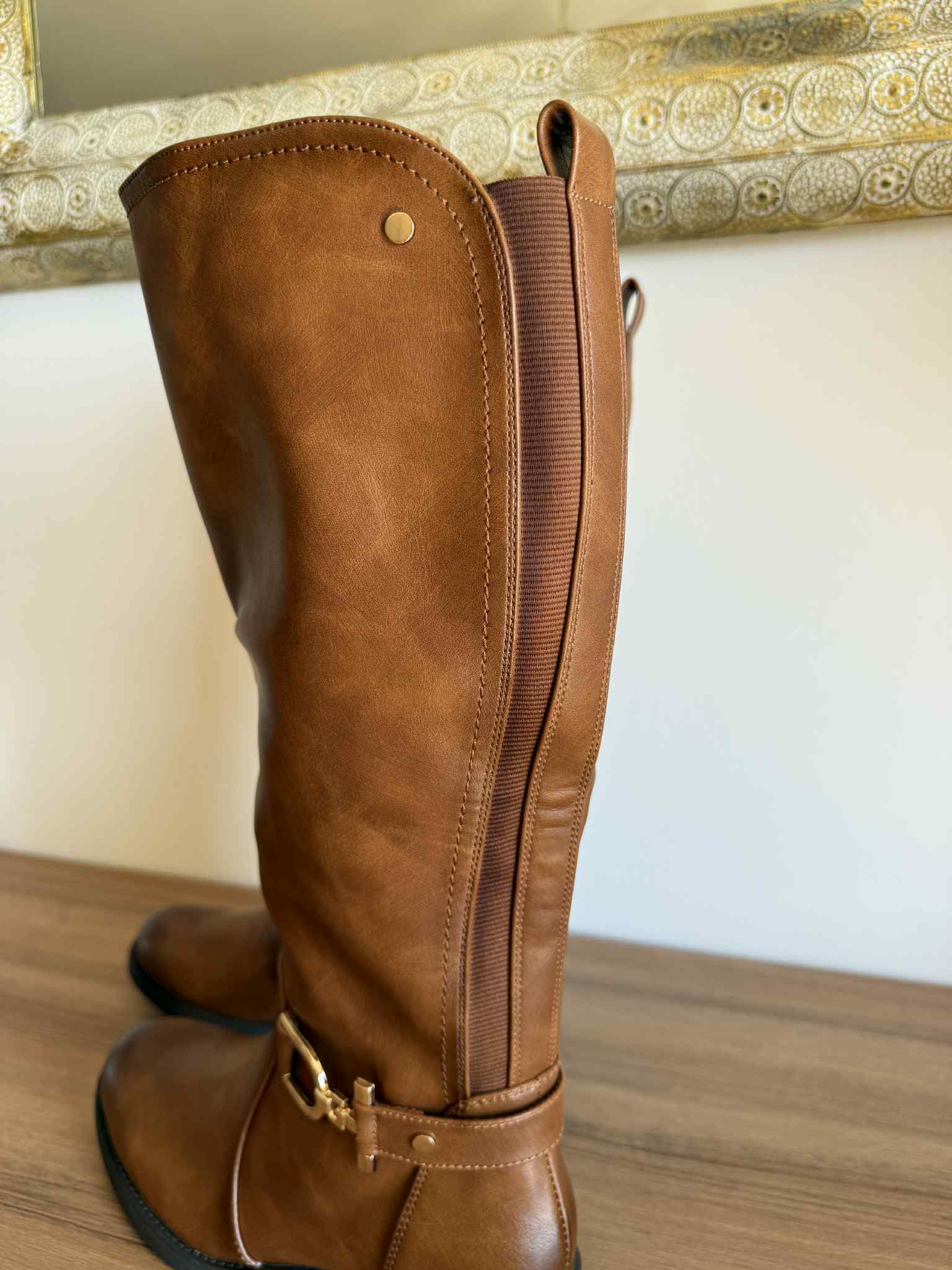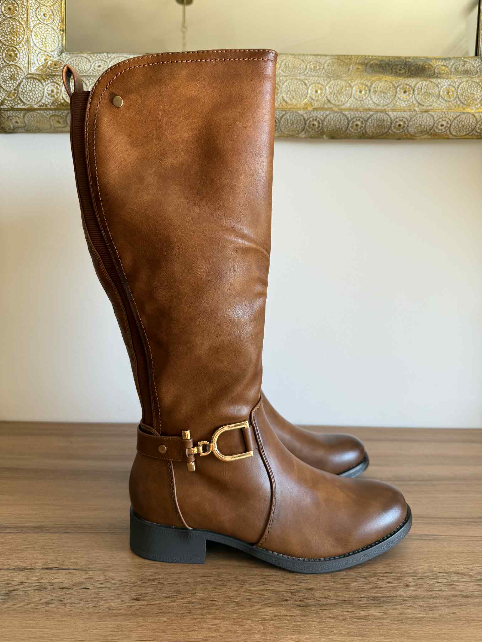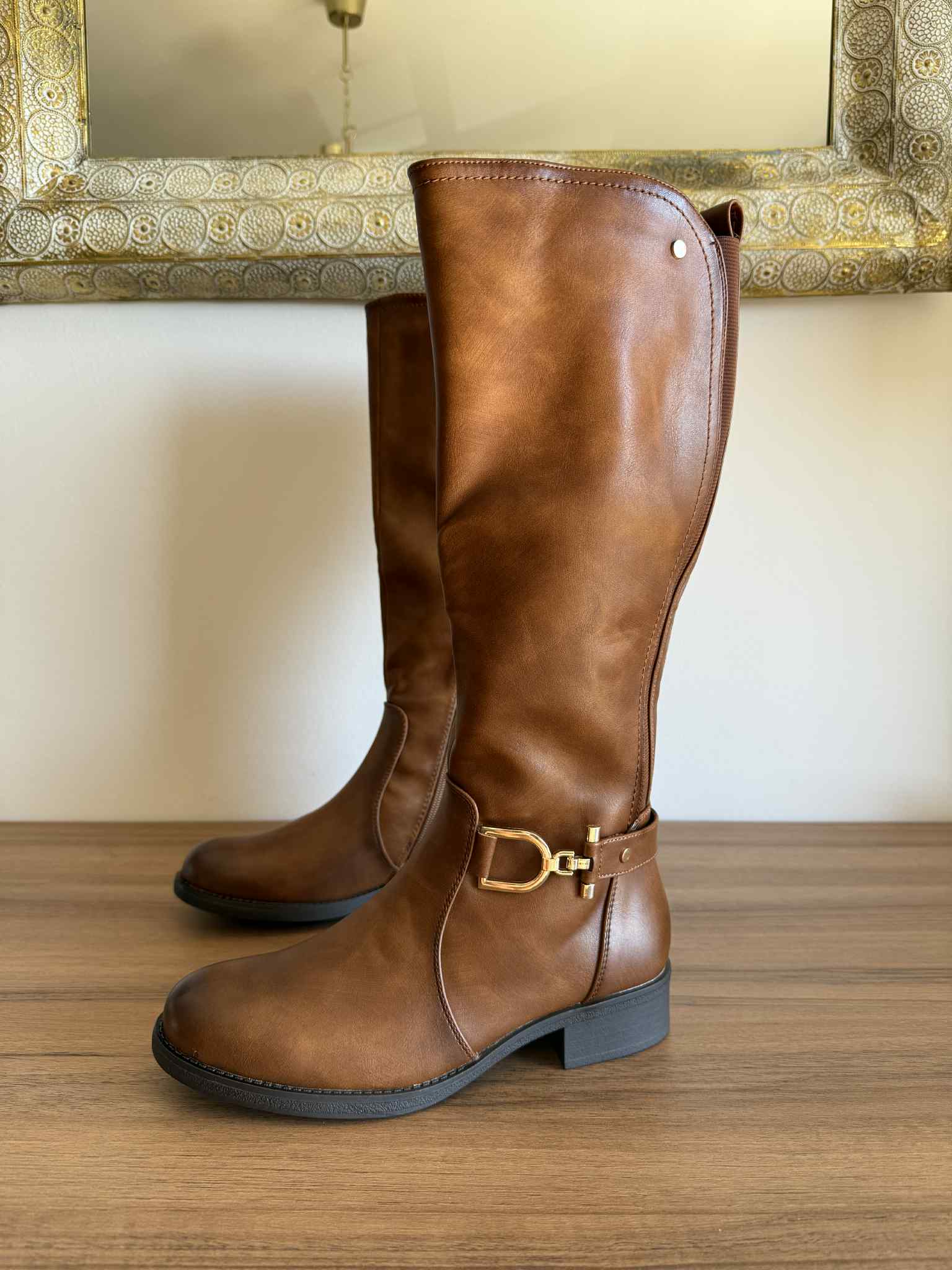 Bota de cano alto, em pele sintética. Com fecho e elástico no cano. Detalhe dourado. Sola baixa.