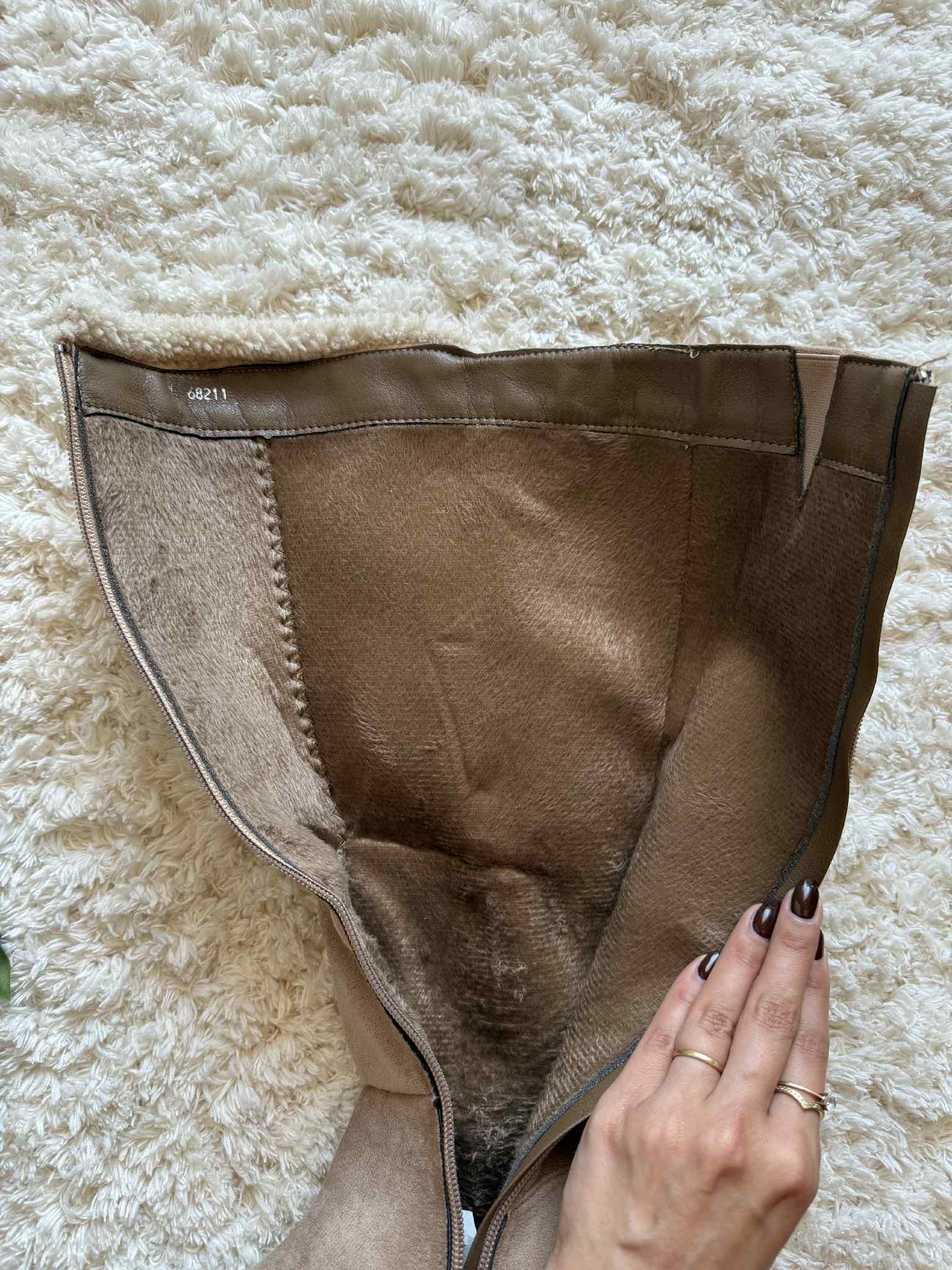 Bota feminina, de cano alto. Em camurça sintética com detalhe a pelo de borrego sintético. Tem fecho.