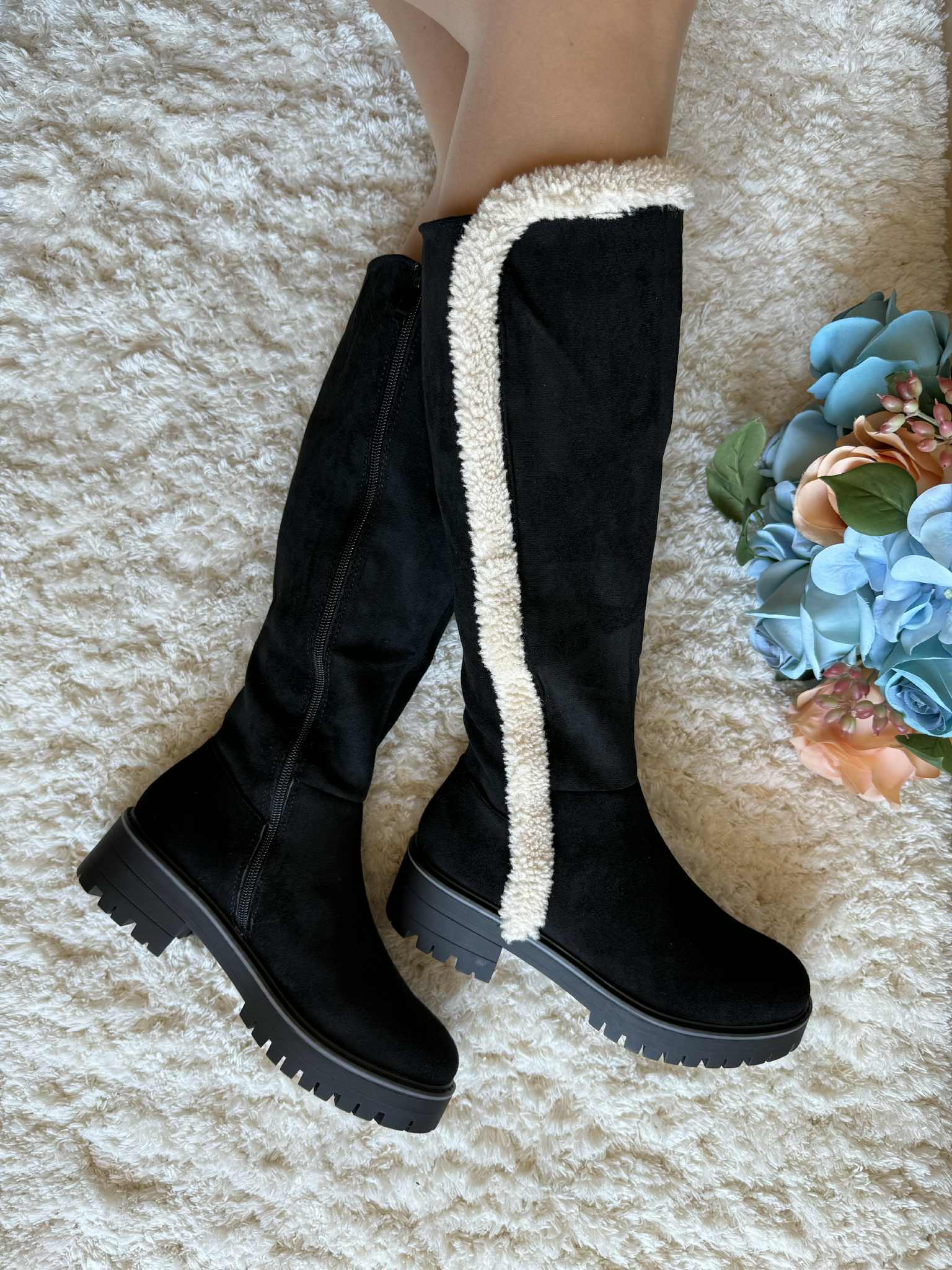Bota feminina, de cano alto. Em camurça sintética com detalhe a pelo de borrego sintético. Tem fecho.