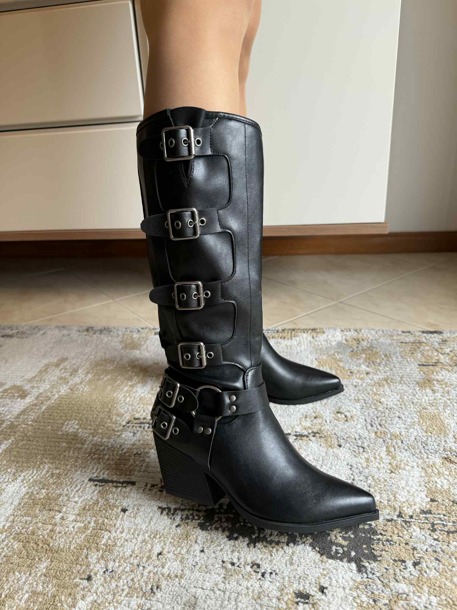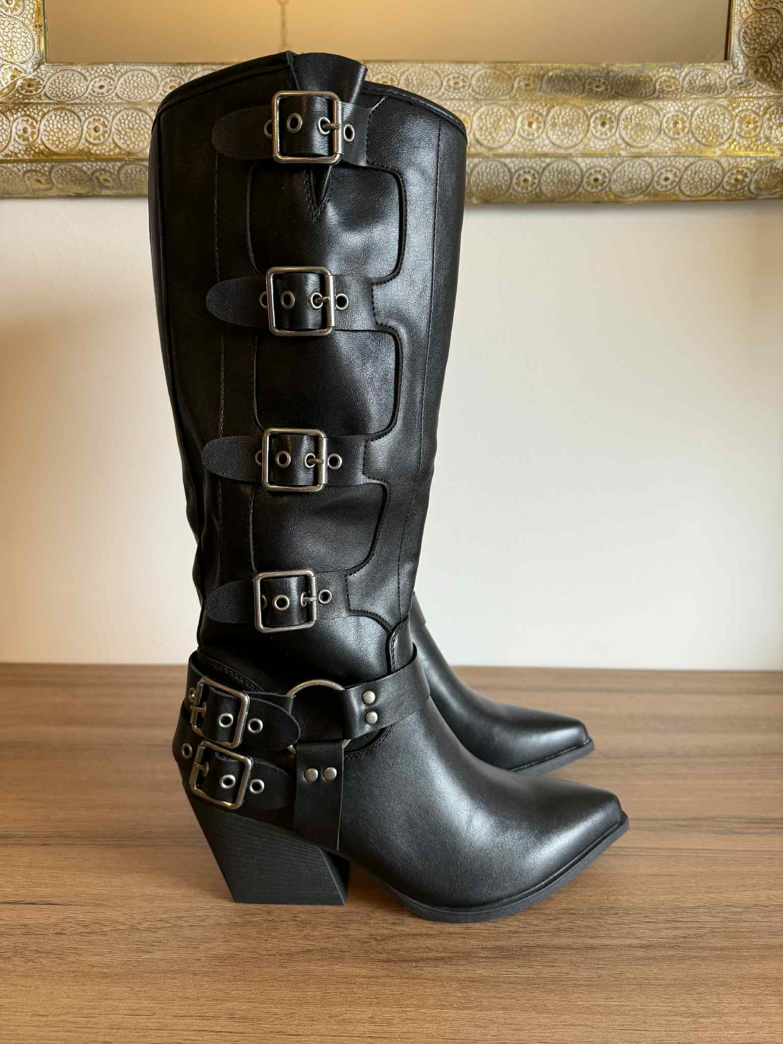 Bota de cano alto, estilo texana. Com detalhe de fivelas pelo cano. Tem fecho. Salto largo com 7cm de altura. Em pele sintética.