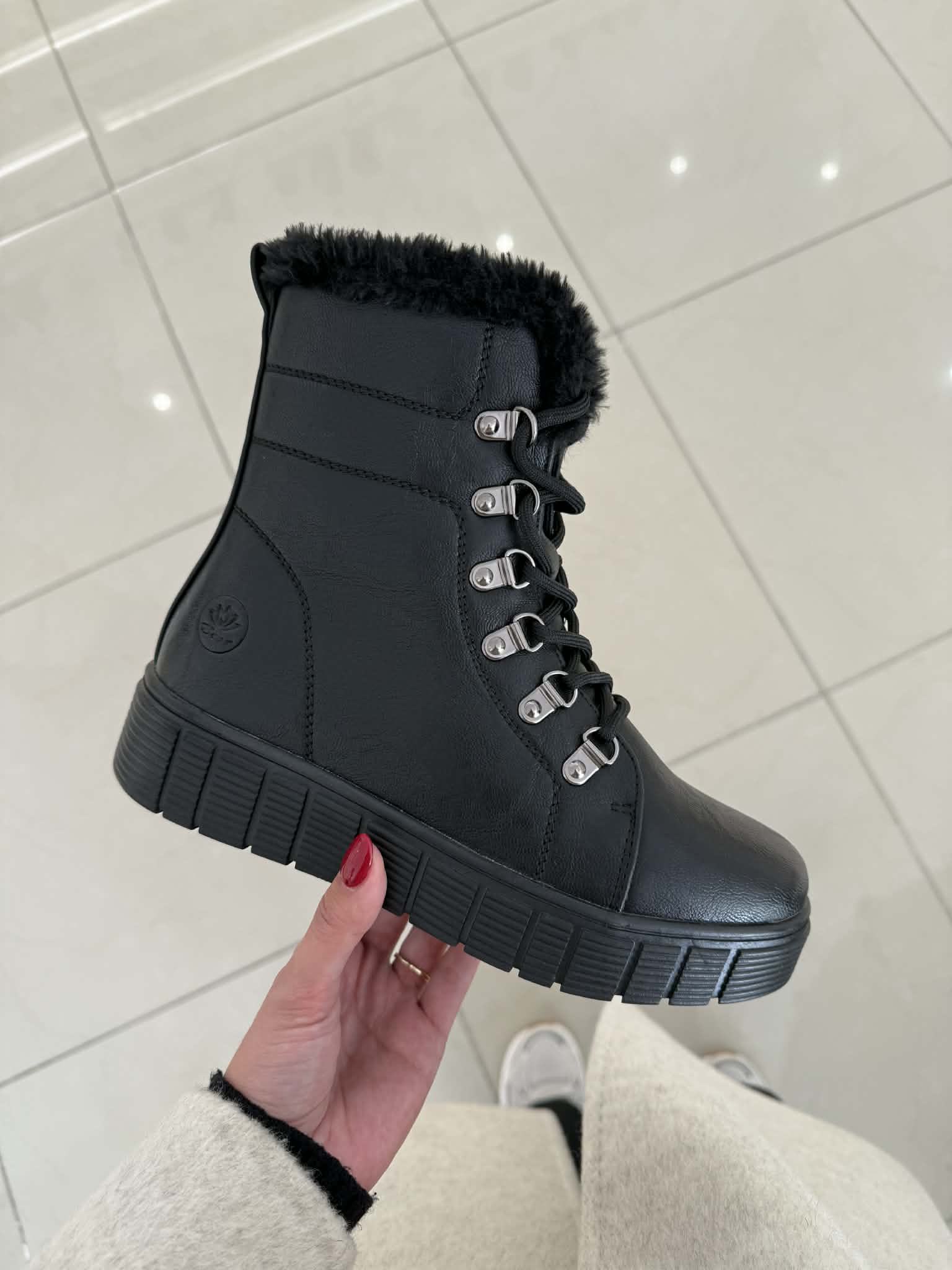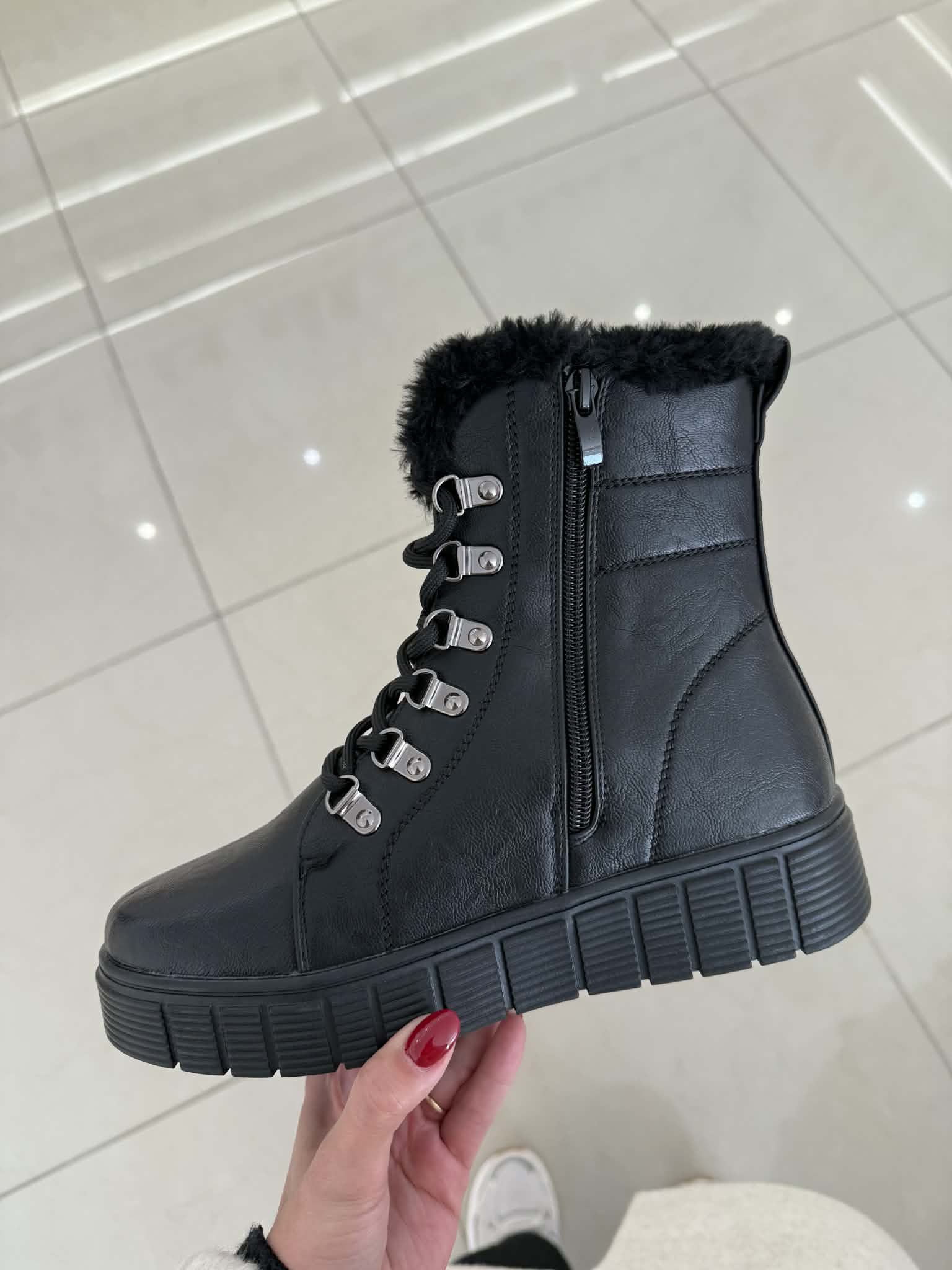 Bota em pele sintética, estilo militar, forrada a pelo. Com fecho e atacador.