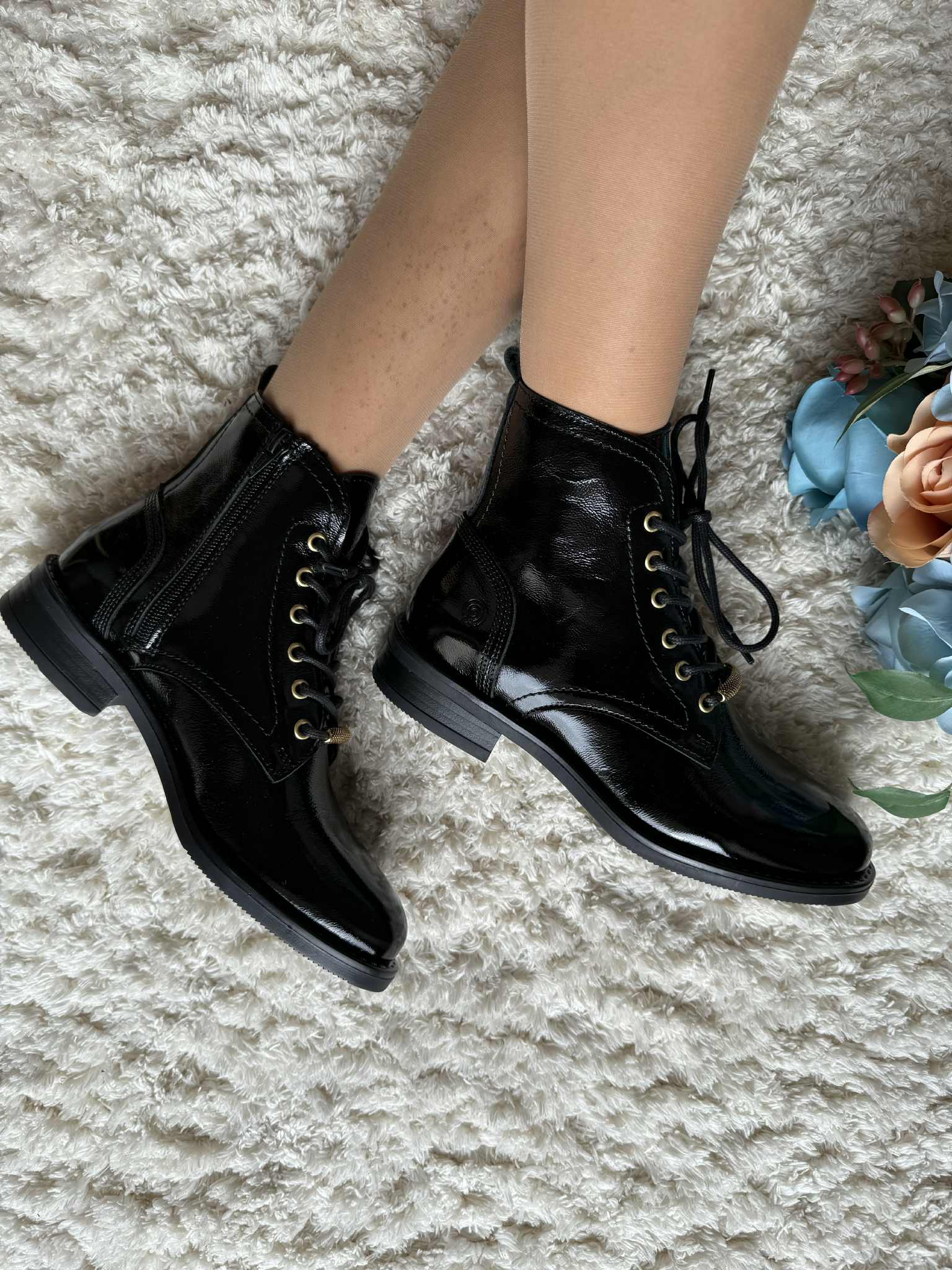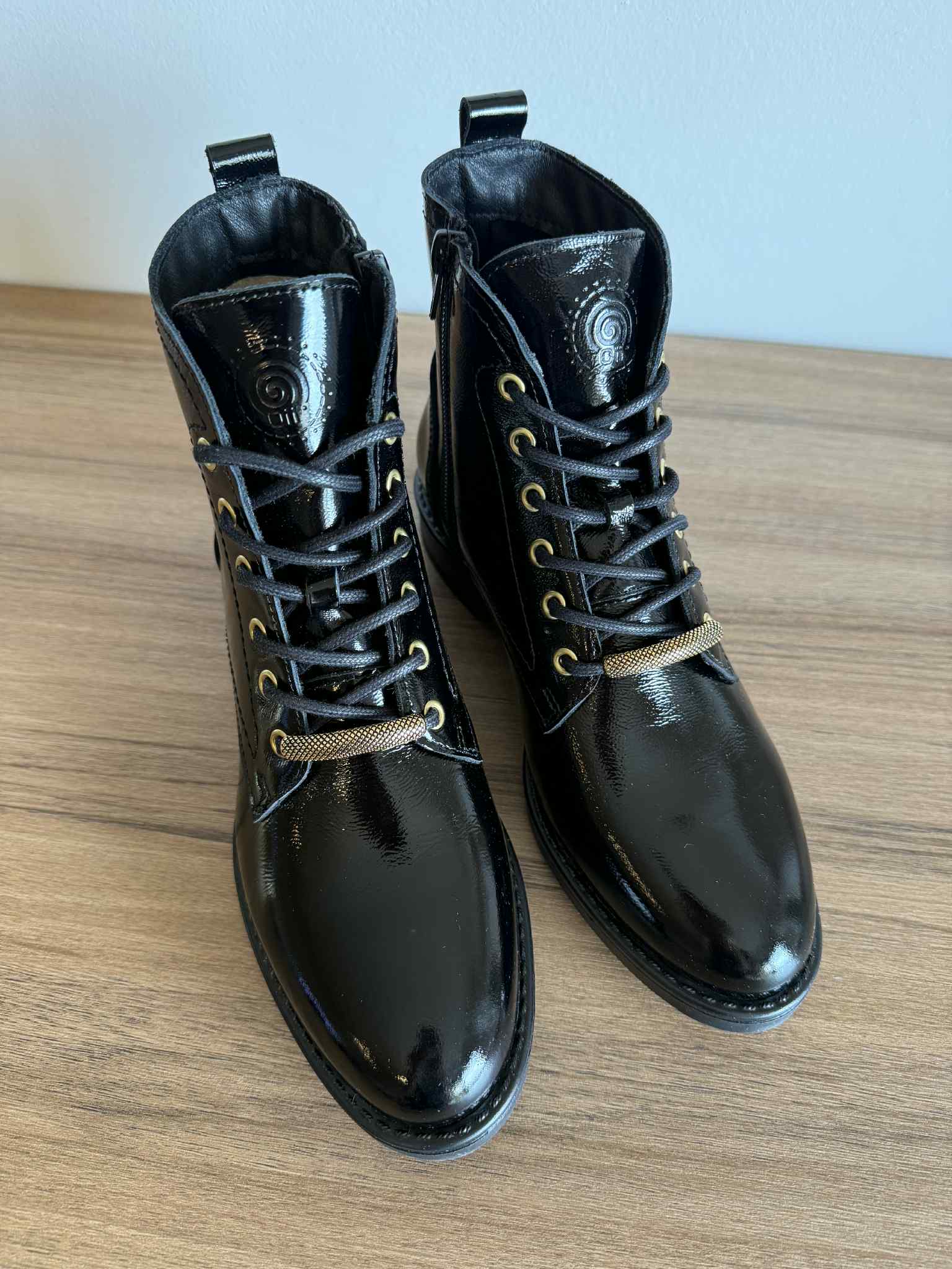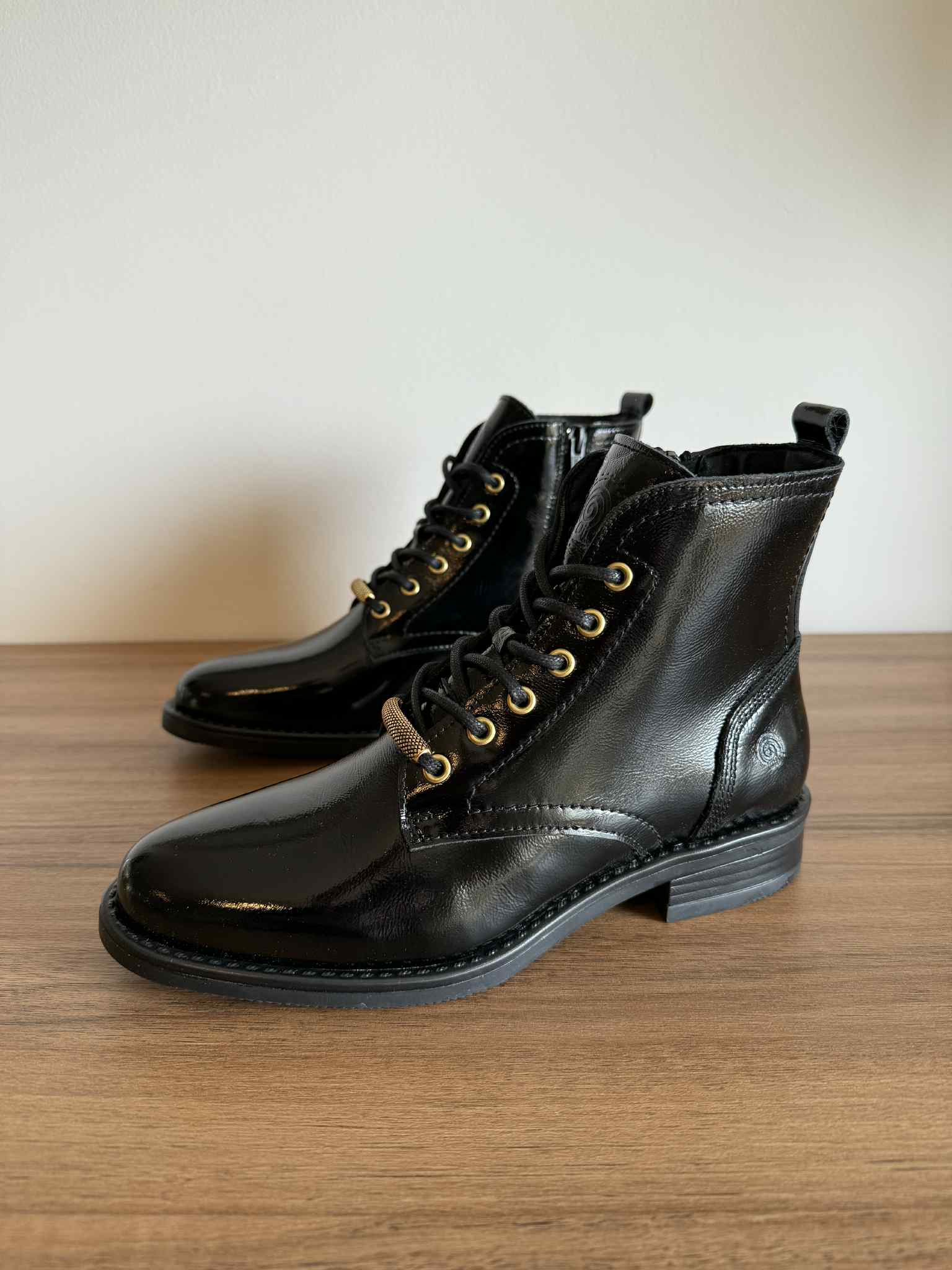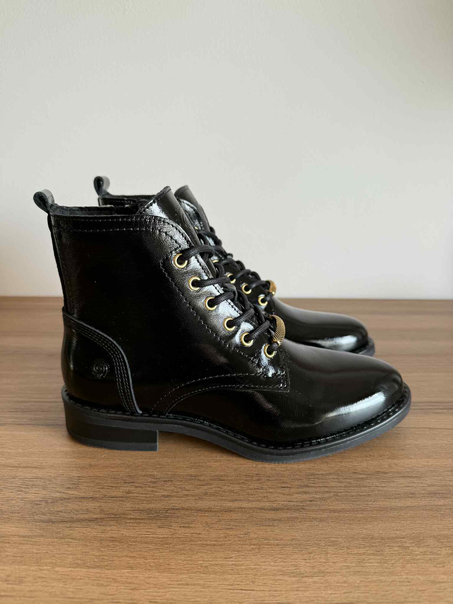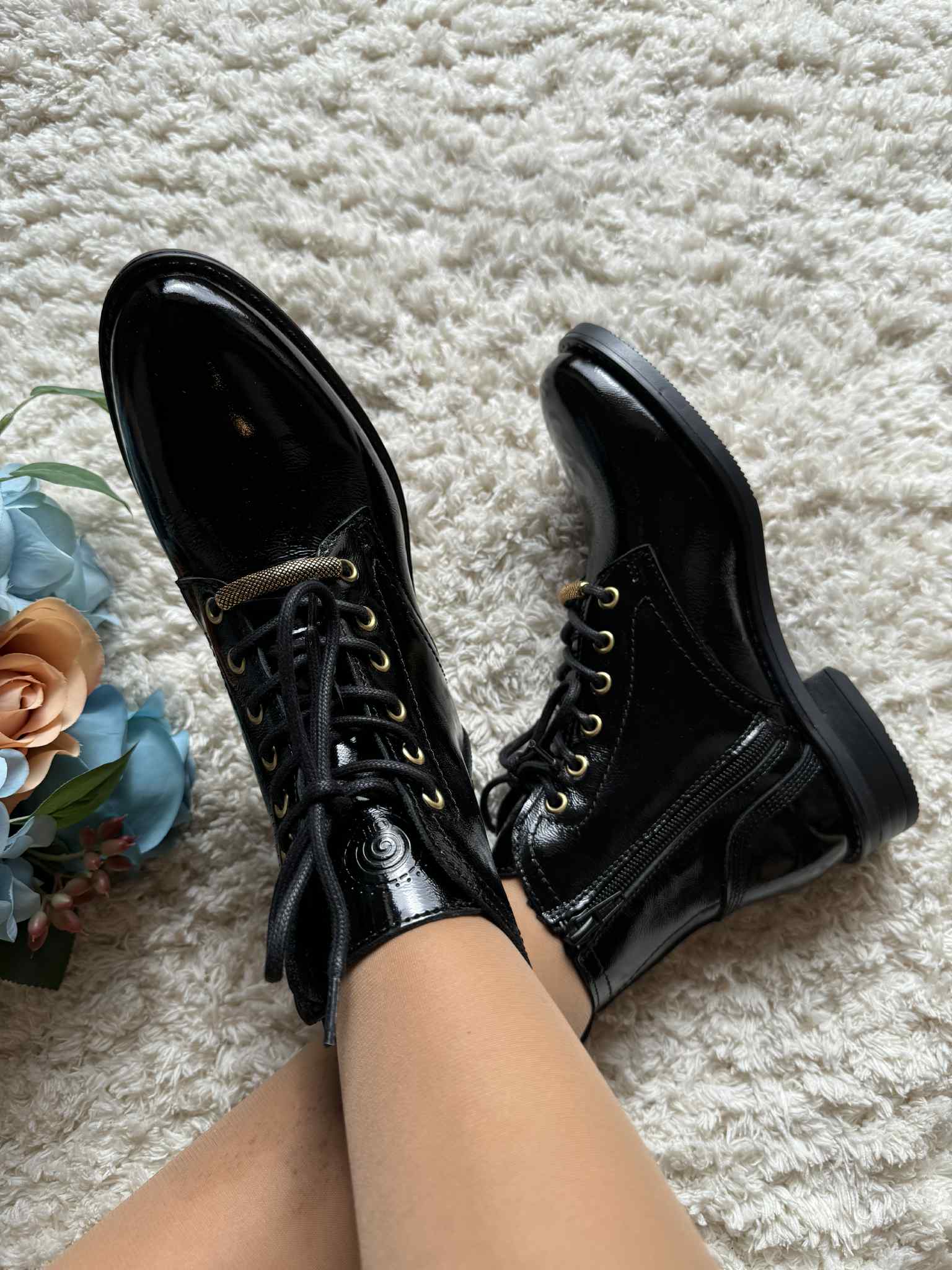 Bota feminina, estilo militar. Da marca Oii. Em pele, fabricadas em Portugal. Com fecho. Aplicação dourada removível.