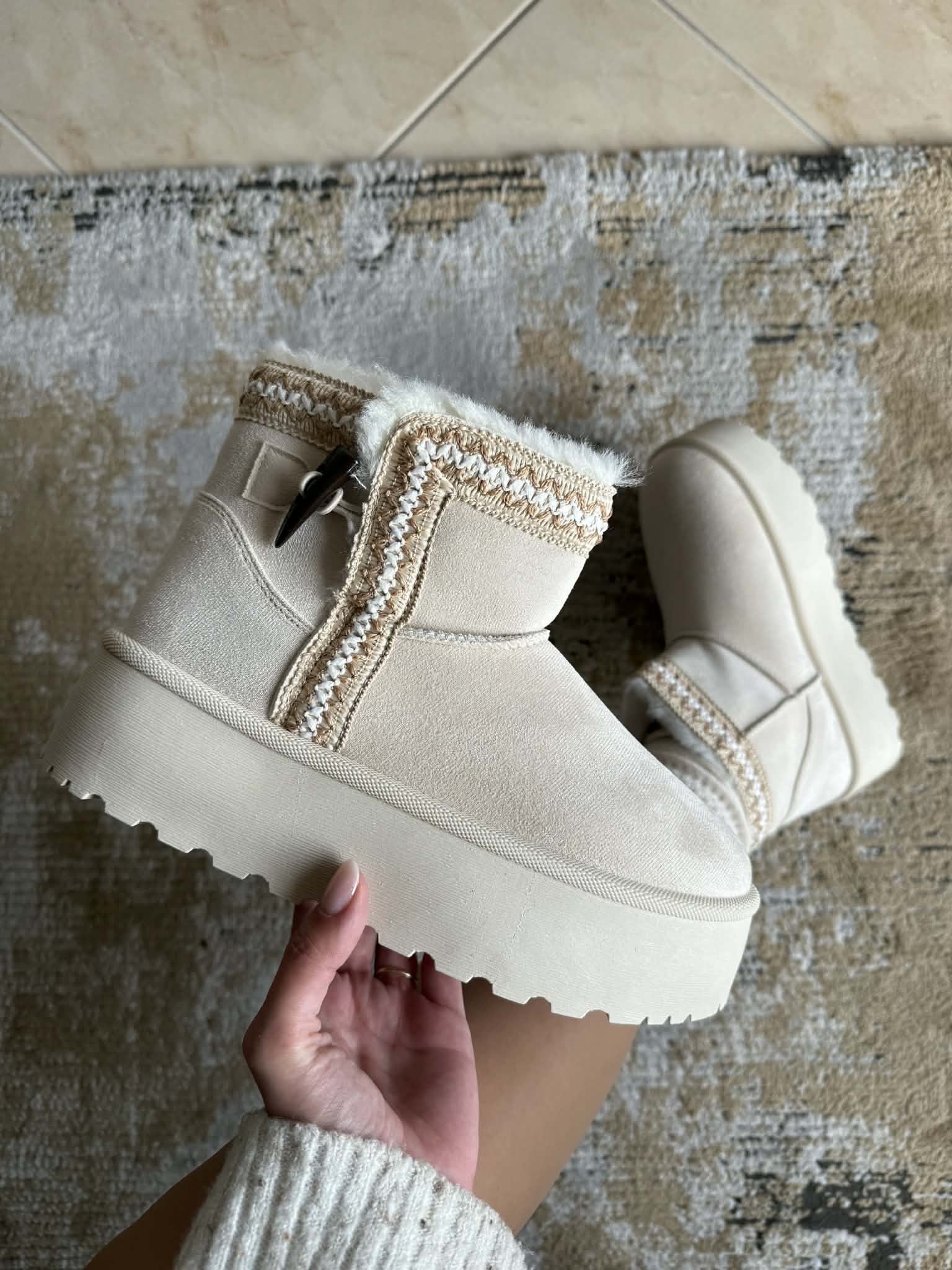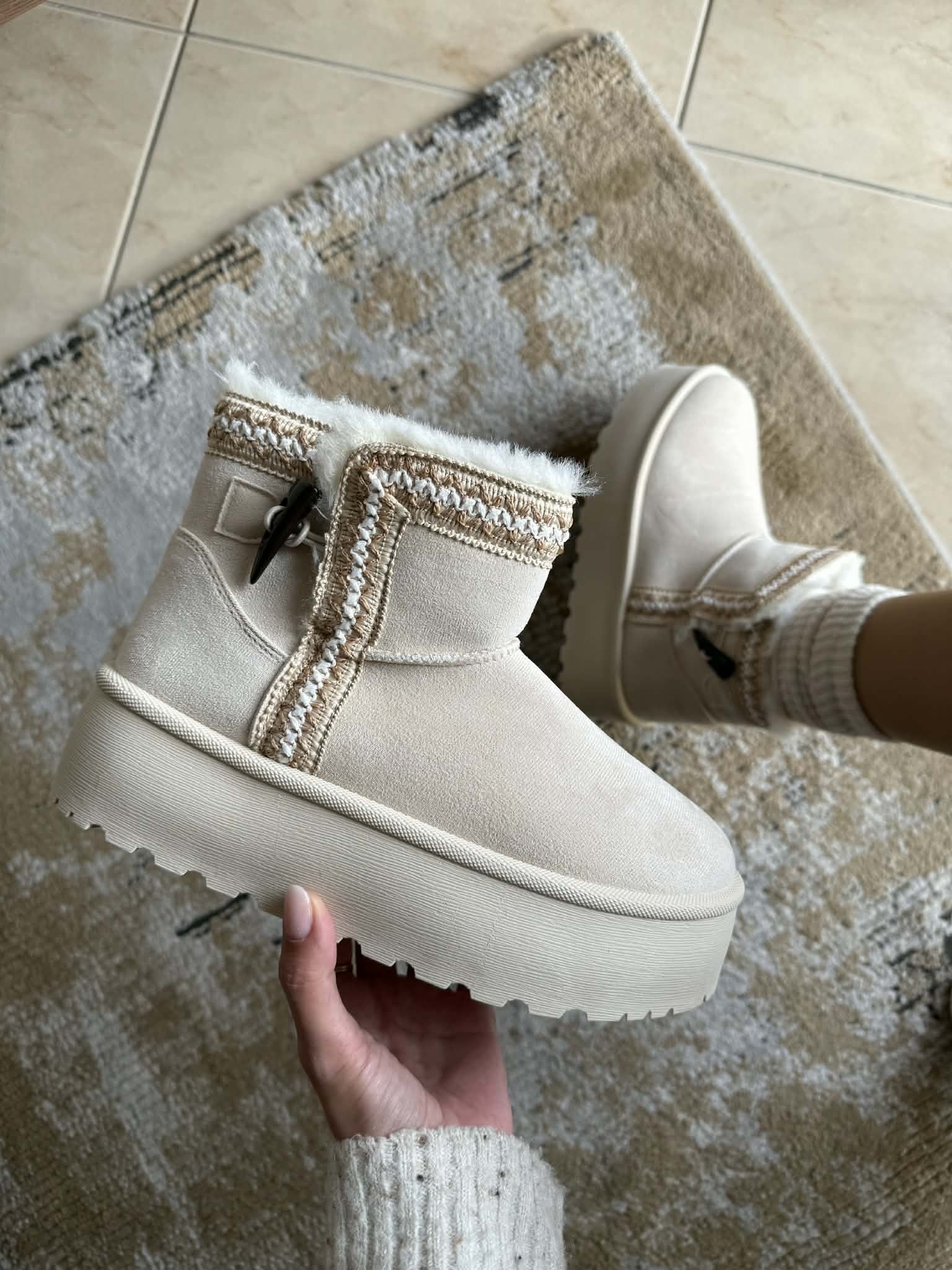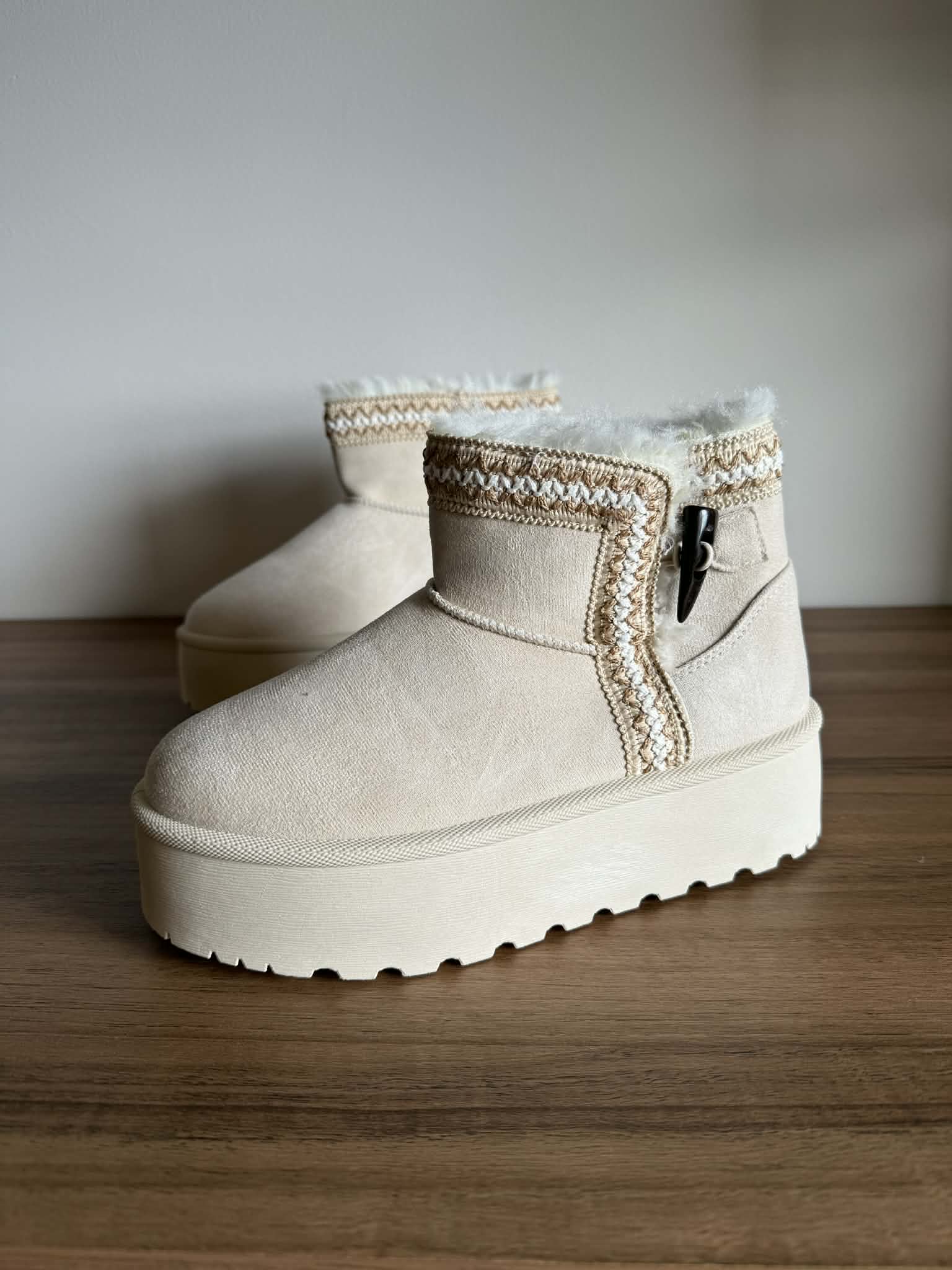 Bota estilo pantufa de exterior. Com sola alta em plataforma. Em camurça sintética. Forradas a pelo no interior.