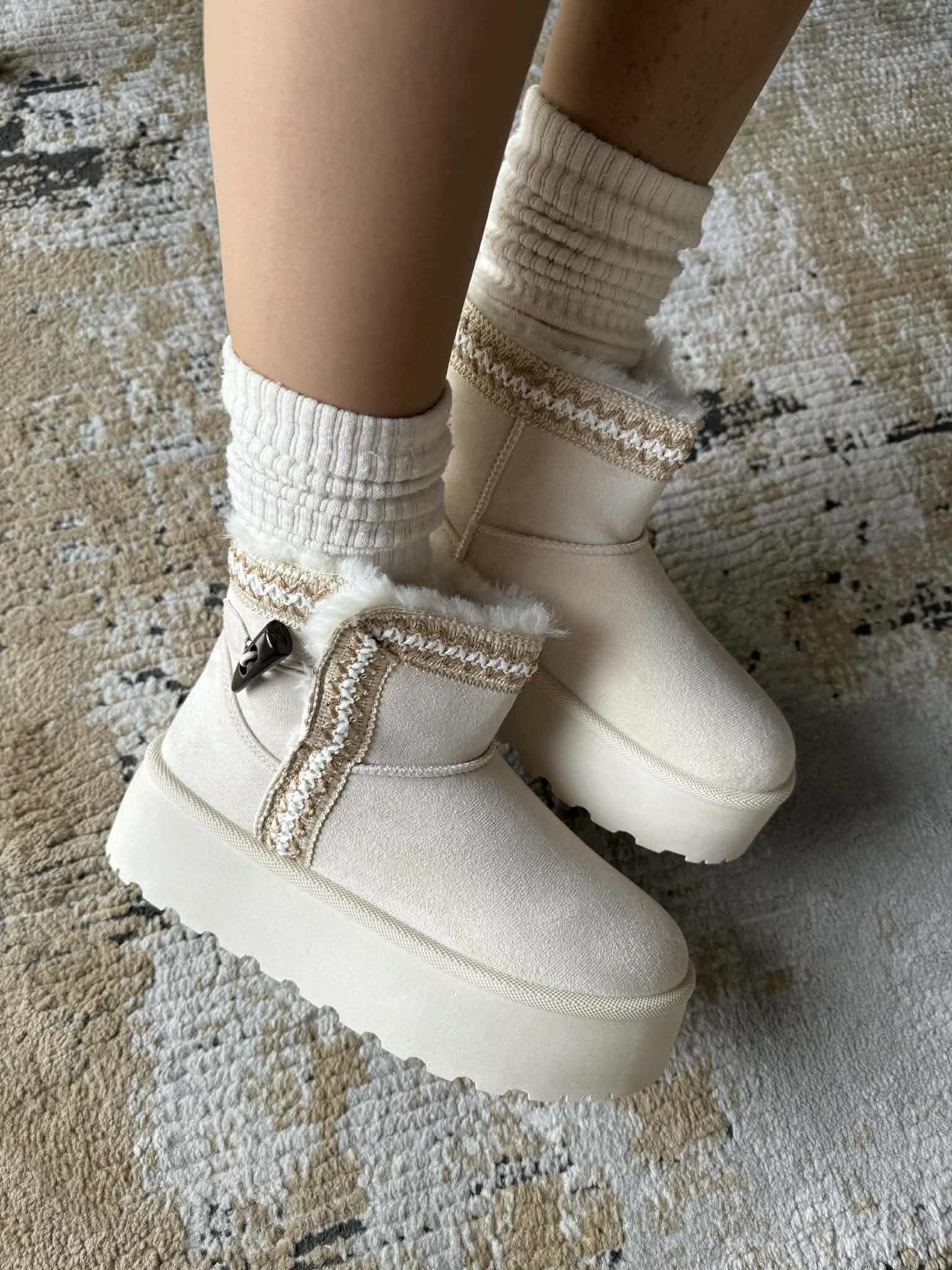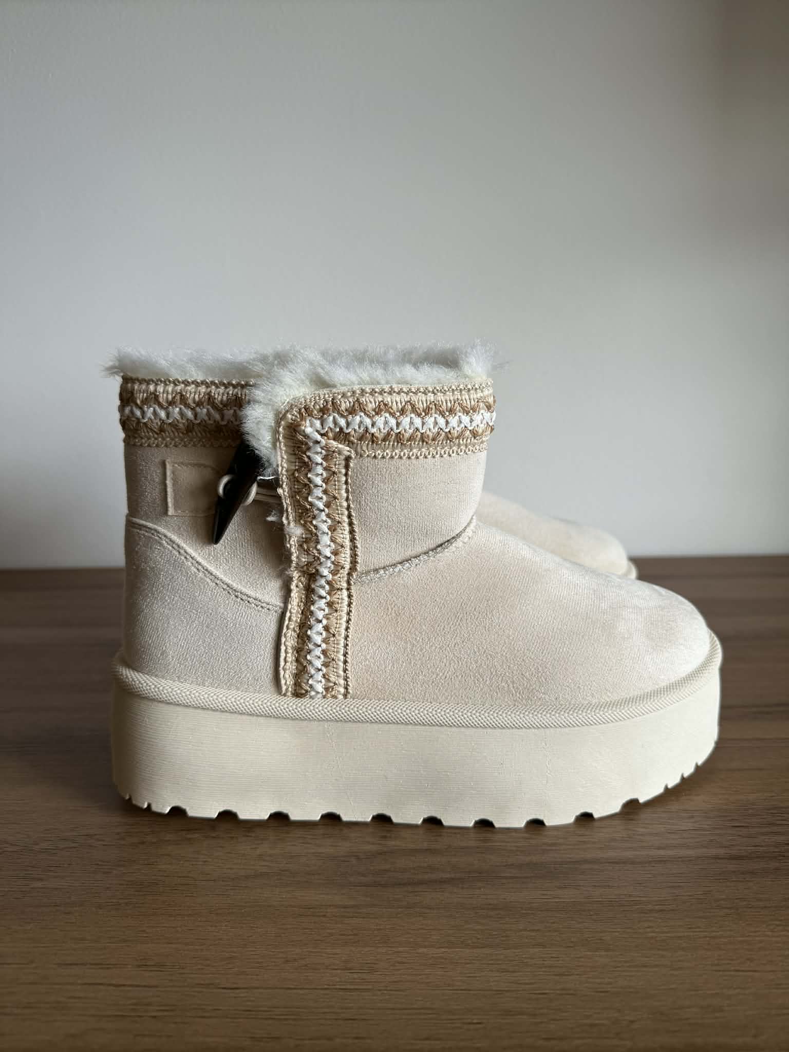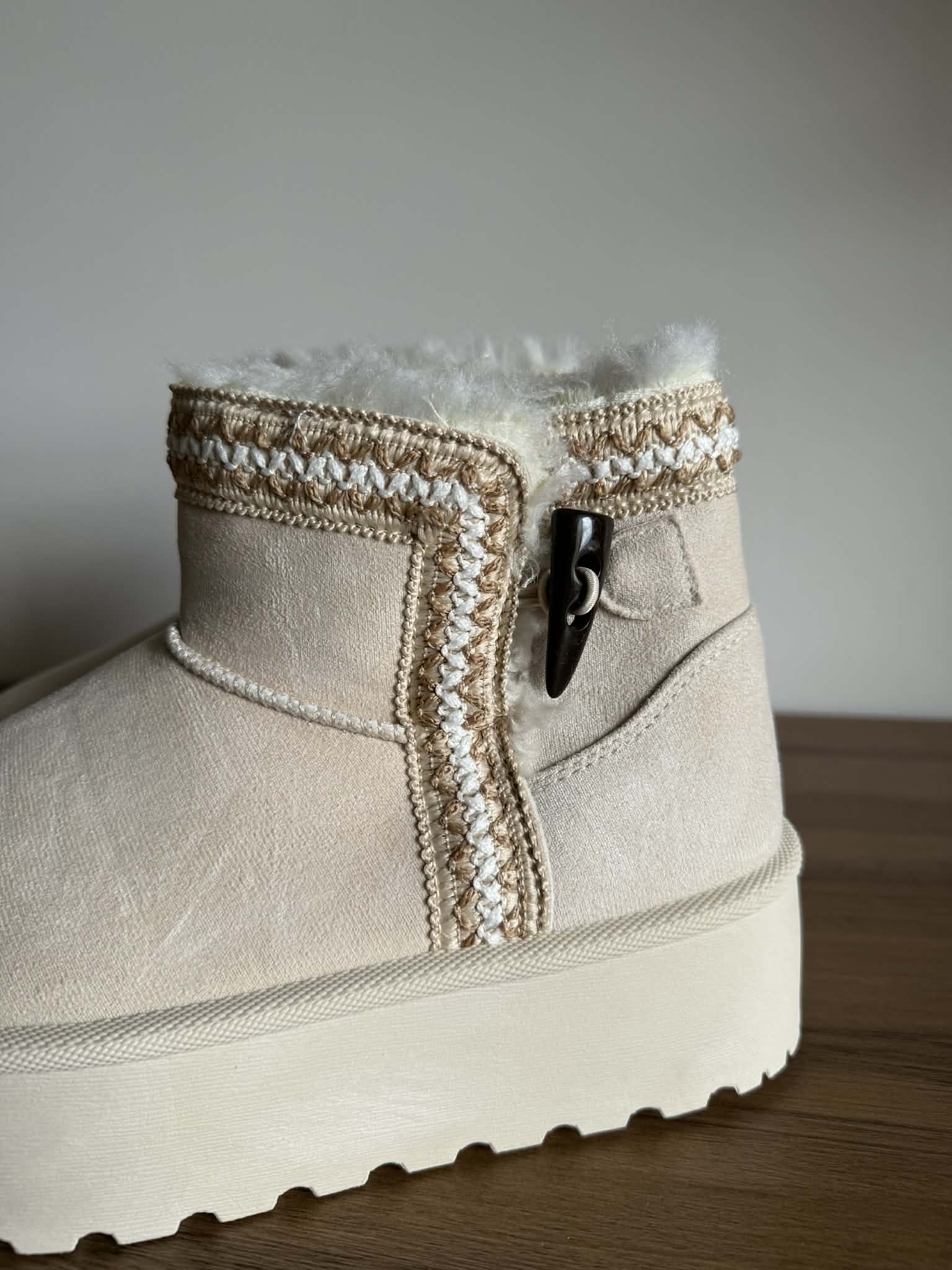 Bota estilo pantufa de exterior. Com sola alta em plataforma. Em camurça sintética. Forradas a pelo no interior.