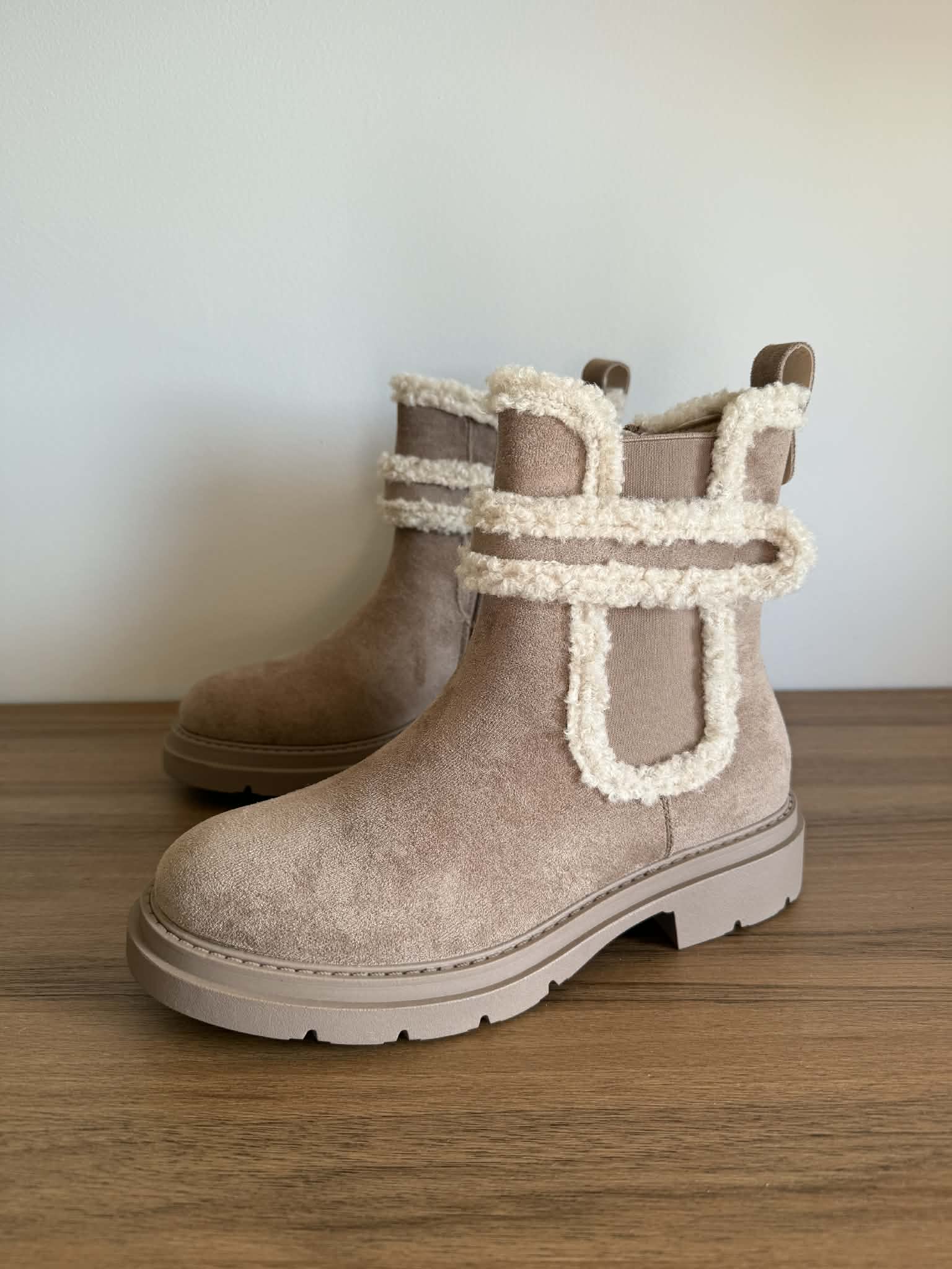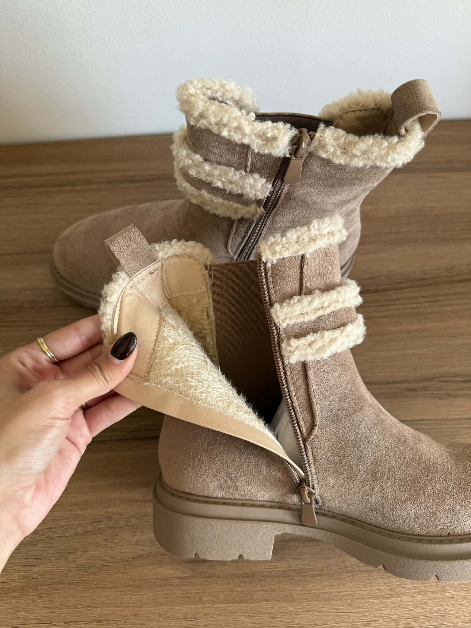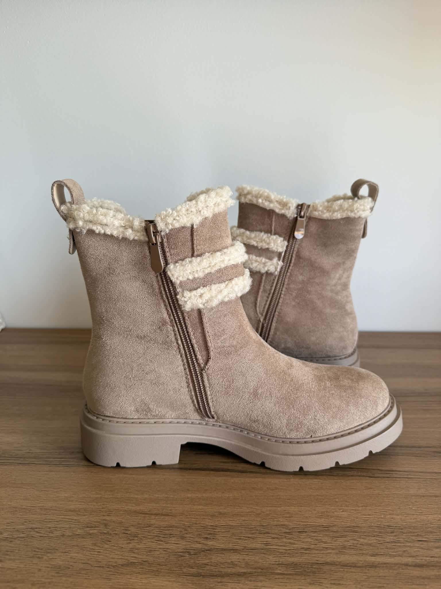 Bota em camurça sintética. Com detalhe de ecopelo. Tem fecho e elástico. Forradas a pelo curto. Em taupe.
