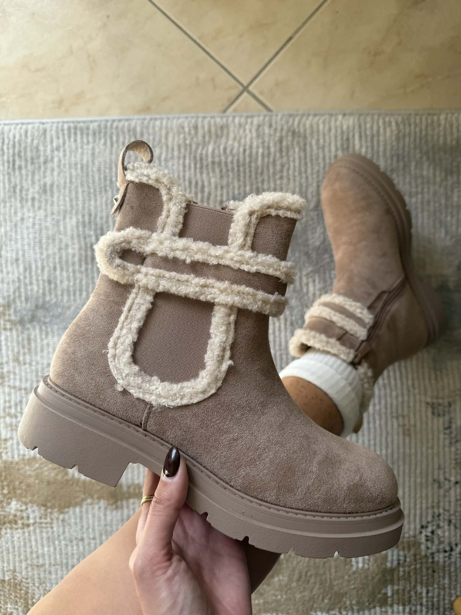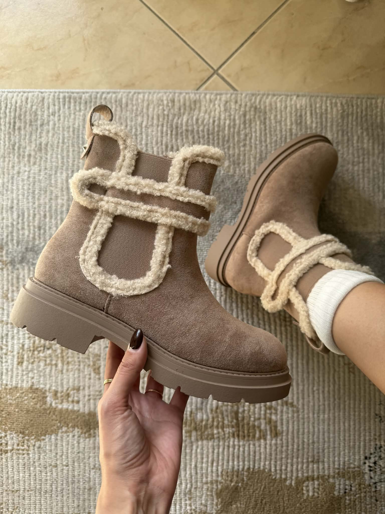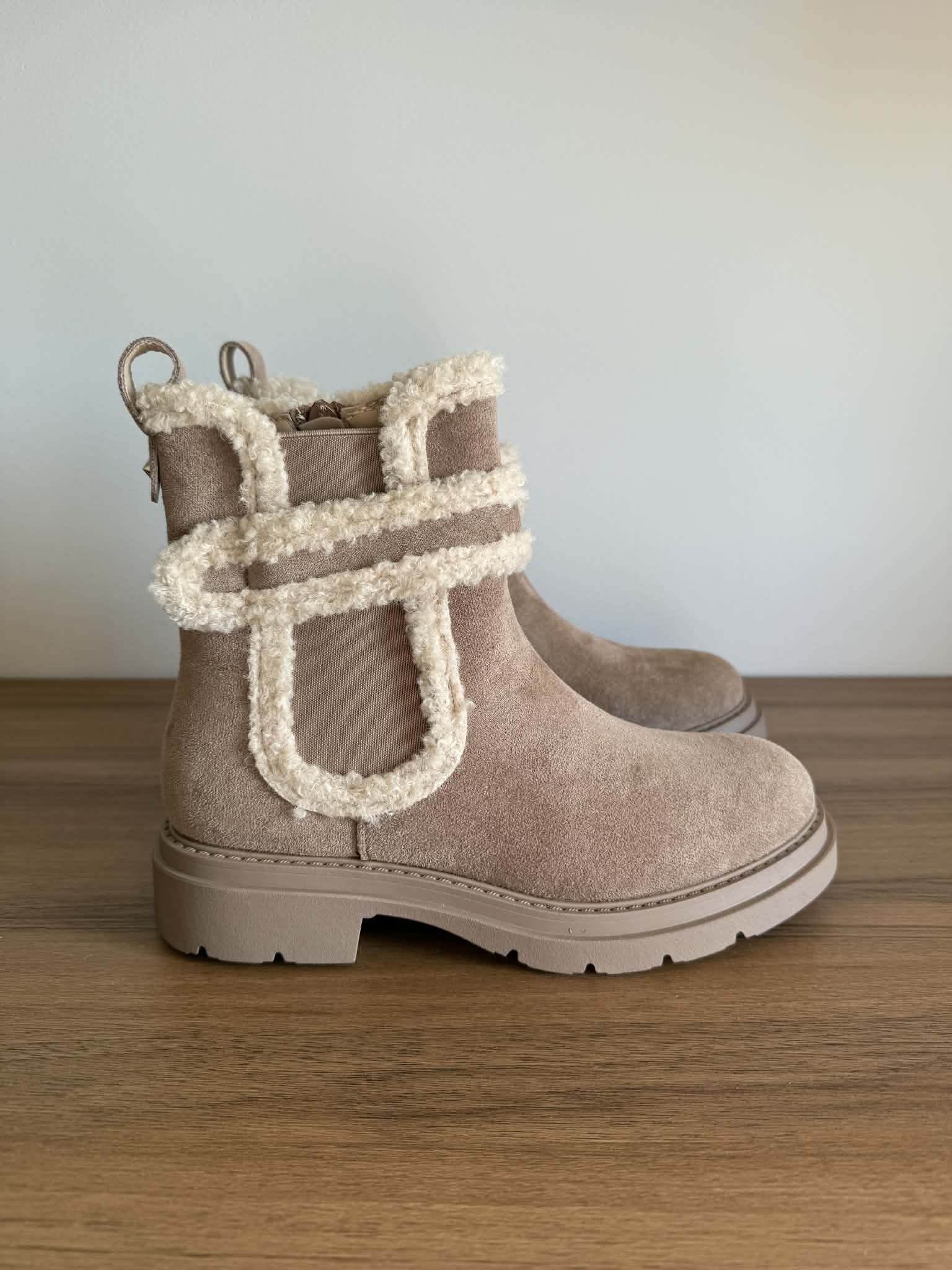 Bota em camurça sintética. Com detalhe de ecopelo. Tem fecho e elástico. Forradas a pelo curto. Em taupe.