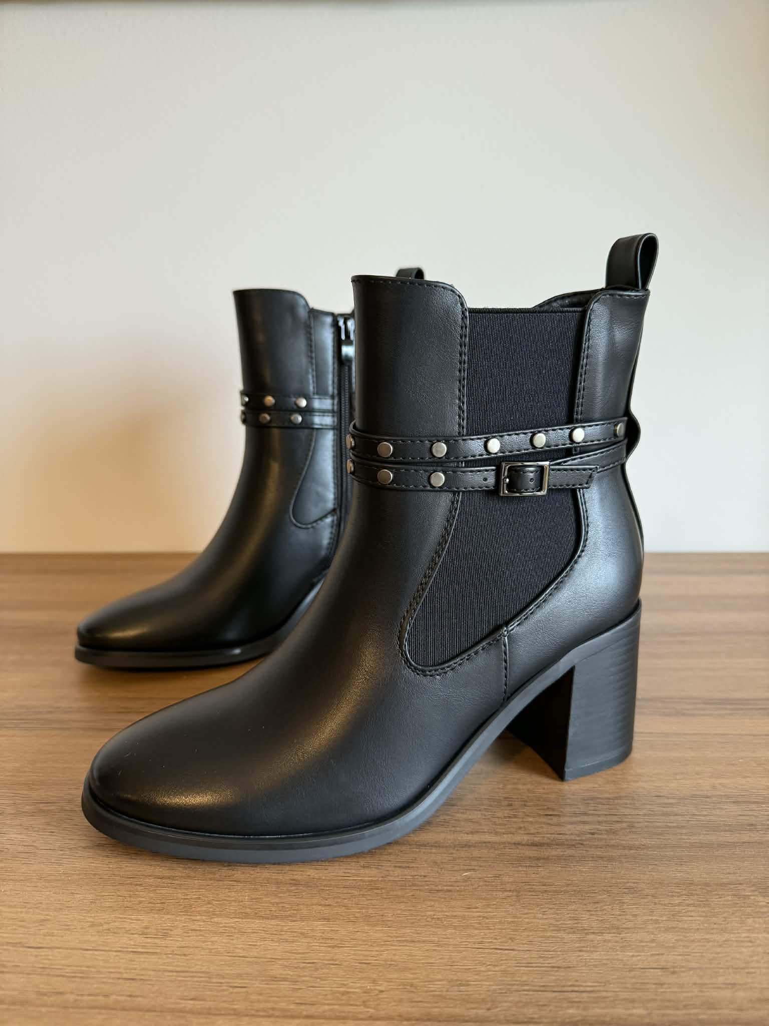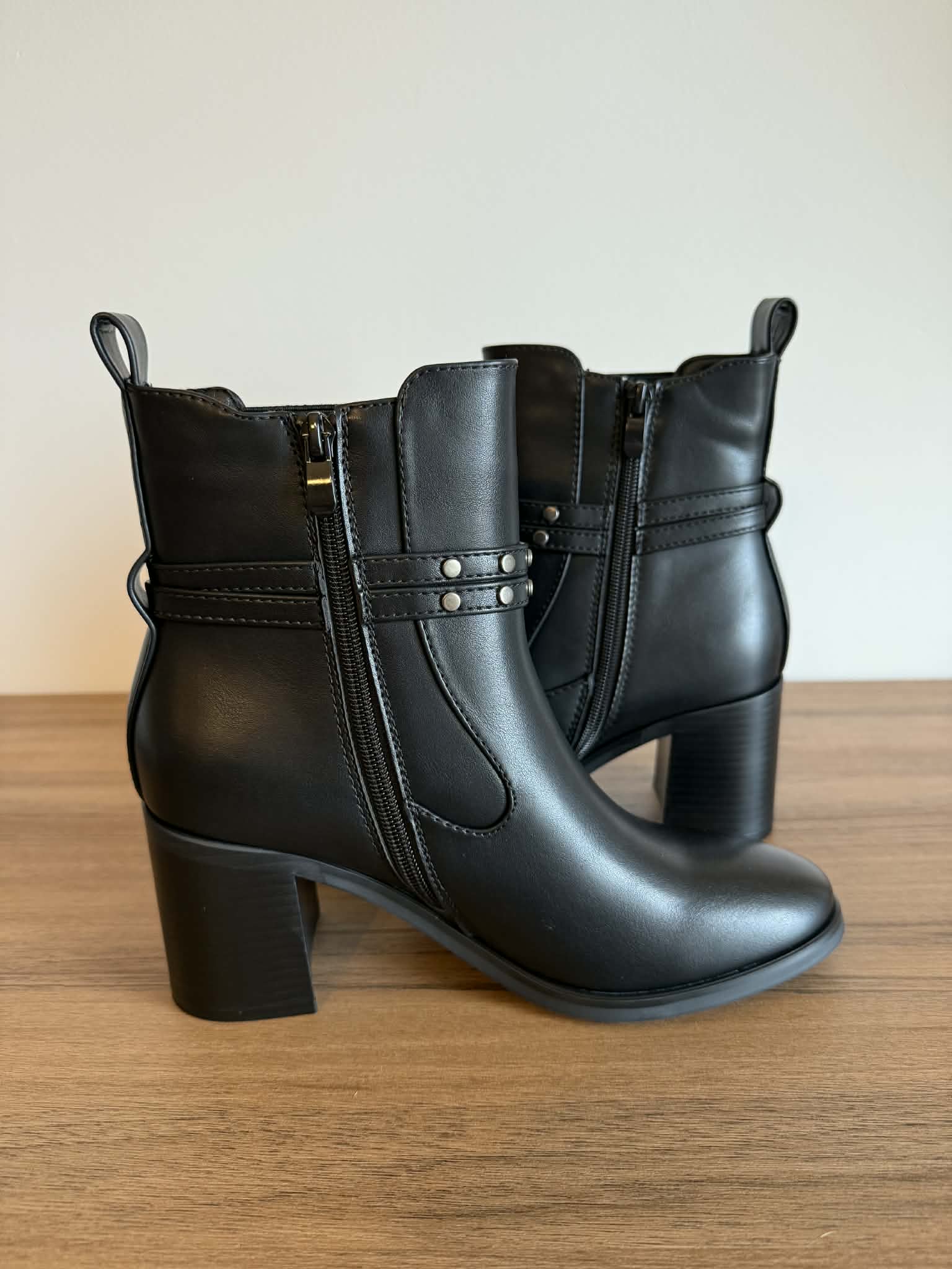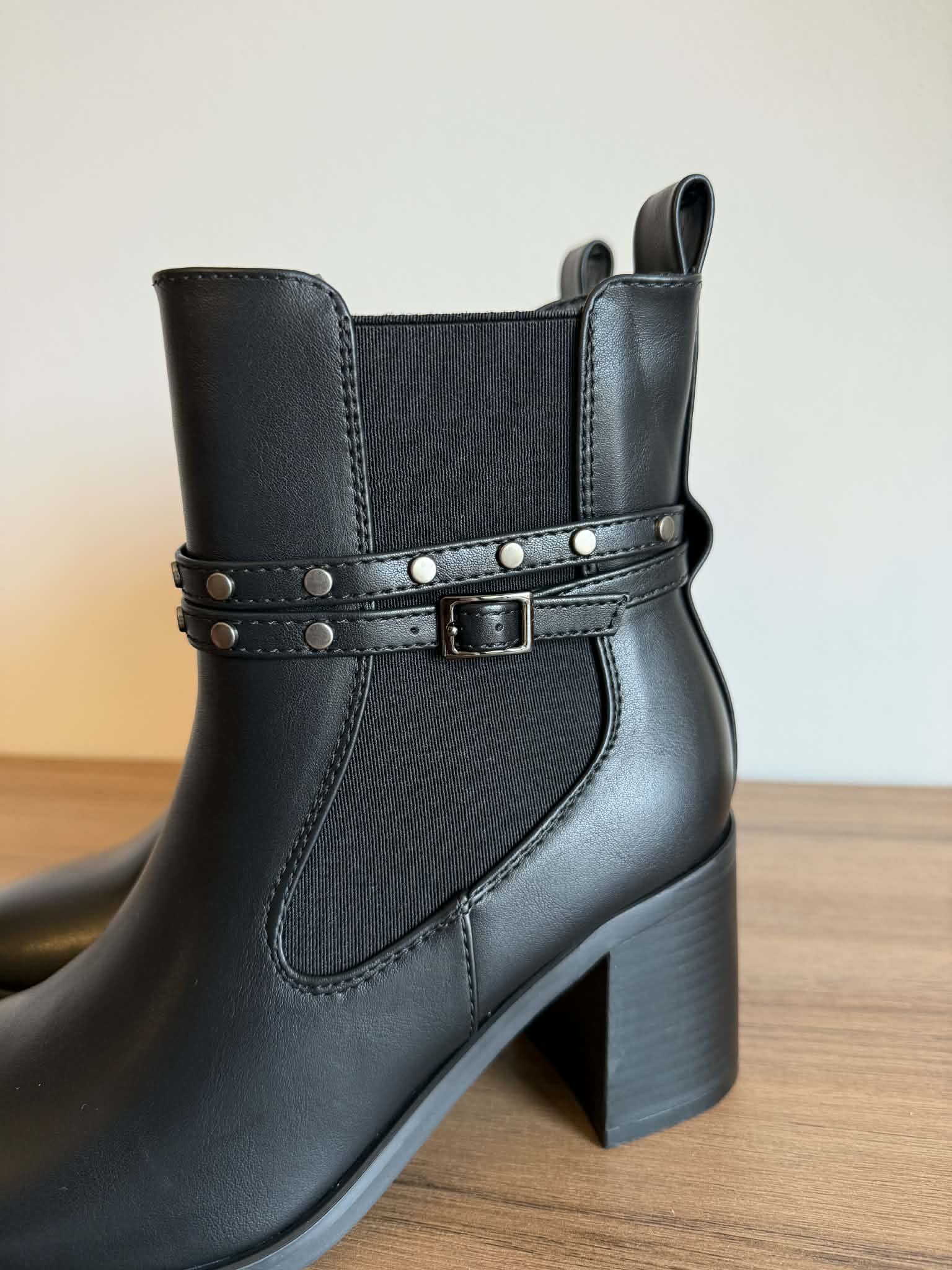 Esta bota preta combina elegância e conforto num design moderno e versátil. Confeccionada em pele sintética suave, apresenta um tacão de 7 cm que oferece altura ideal para o dia a dia sem comprometer a estabilidade. O fecho lateral permite um calçar fácil e rápido, enquanto o elástico lateral assegura um ajuste confortável ao longo da perna. Detalhada com pequenas tachas e uma fivela decorativa, é a escolha perfeita para completar looks casuais ou mais sofisticados com um toque de estilo.