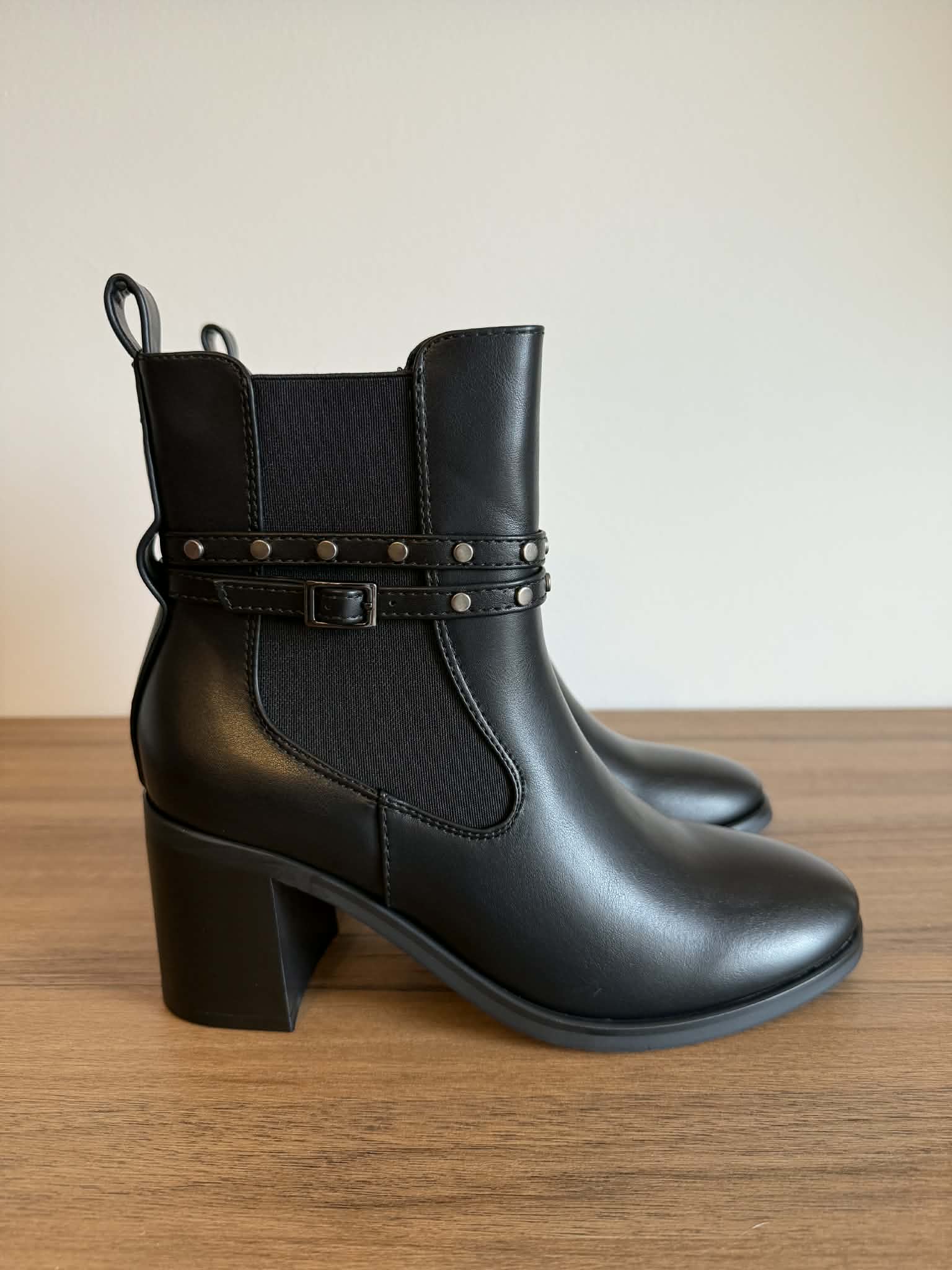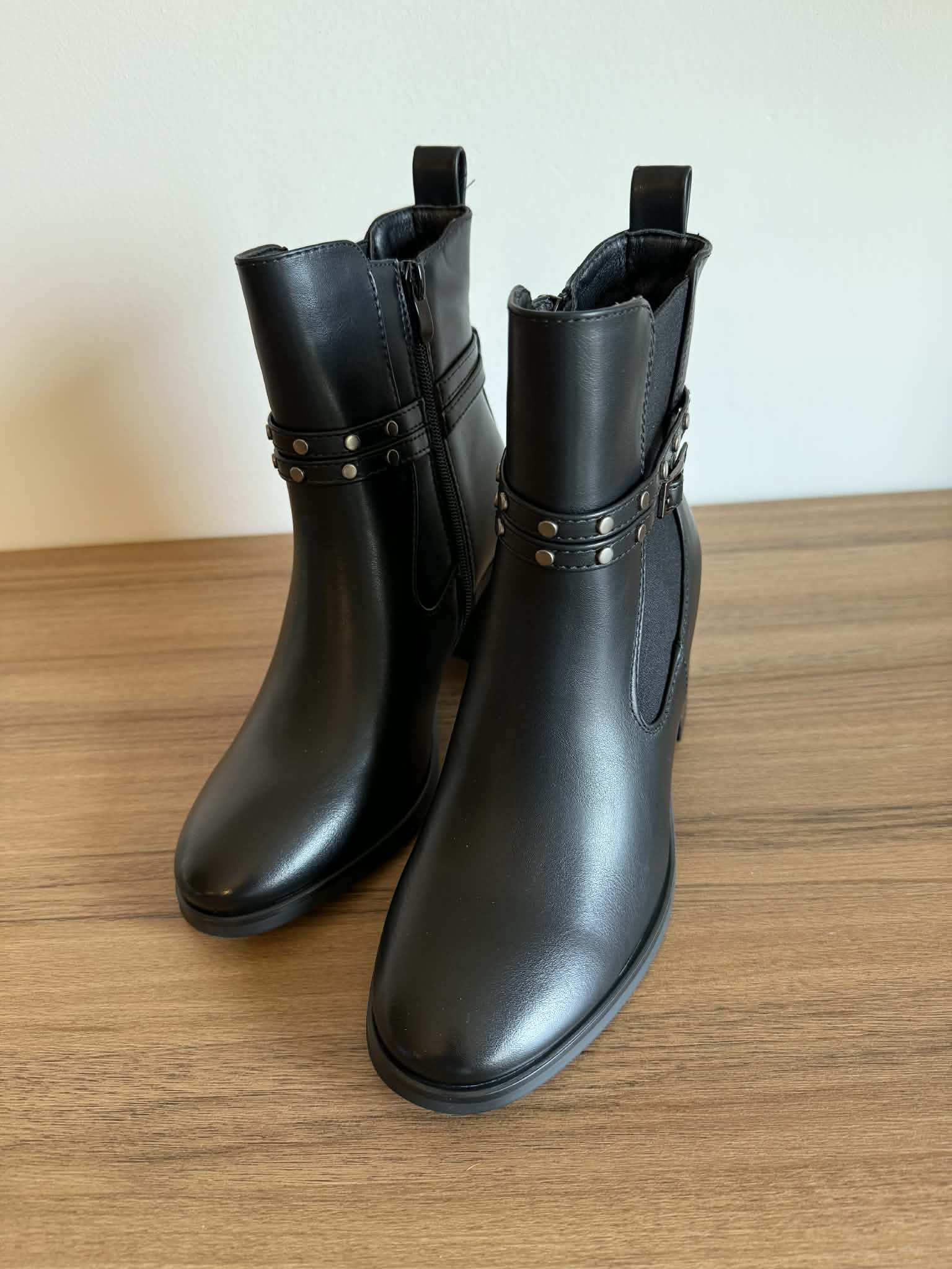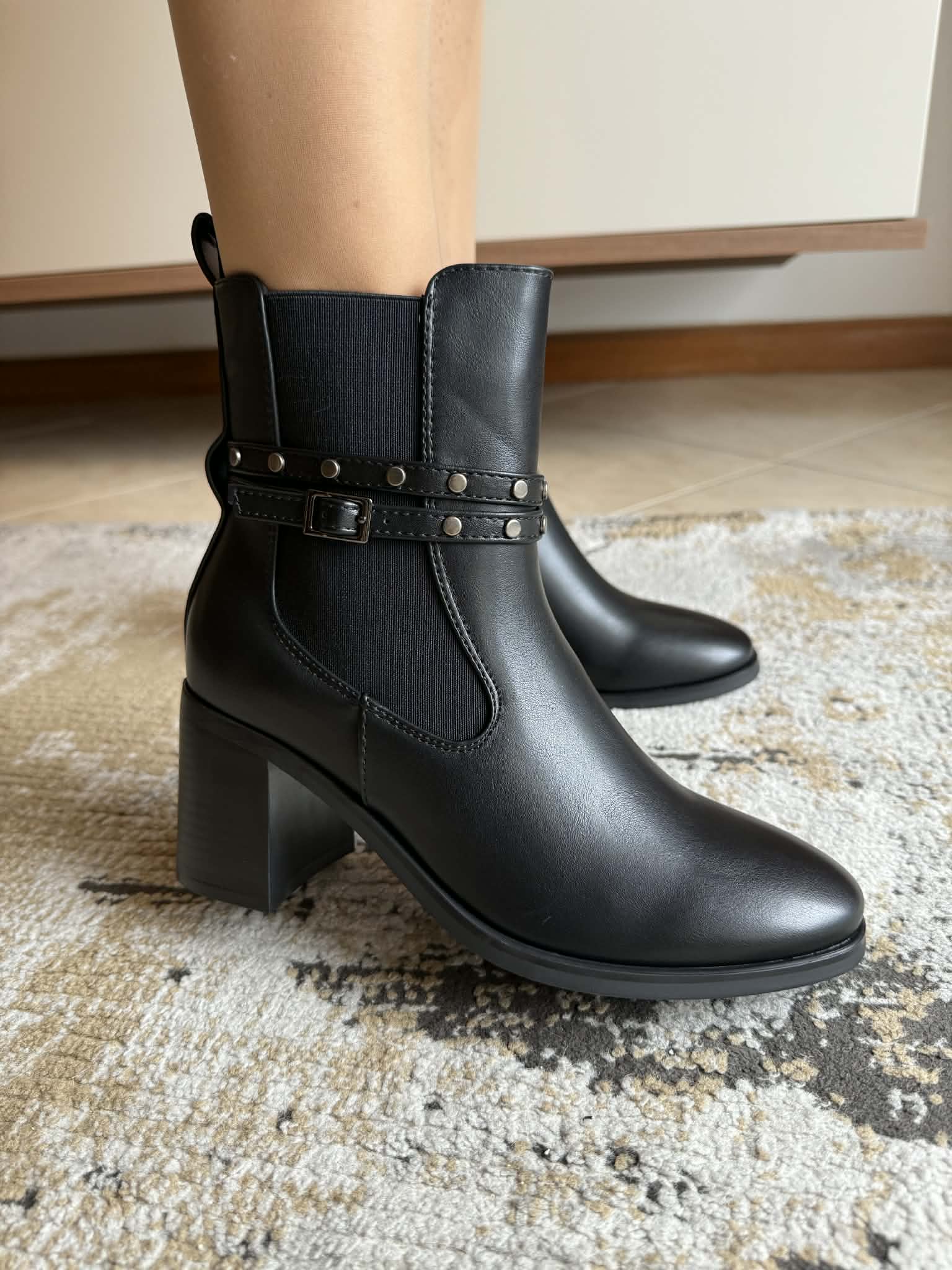 Esta bota preta combina elegância e conforto num design moderno e versátil. Confeccionada em pele sintética suave, apresenta um tacão de 7 cm que oferece altura ideal para o dia a dia sem comprometer a estabilidade. O fecho lateral permite um calçar fácil e rápido, enquanto o elástico lateral assegura um ajuste confortável ao longo da perna. Detalhada com pequenas tachas e uma fivela decorativa, é a escolha perfeita para completar looks casuais ou mais sofisticados com um toque de estilo.