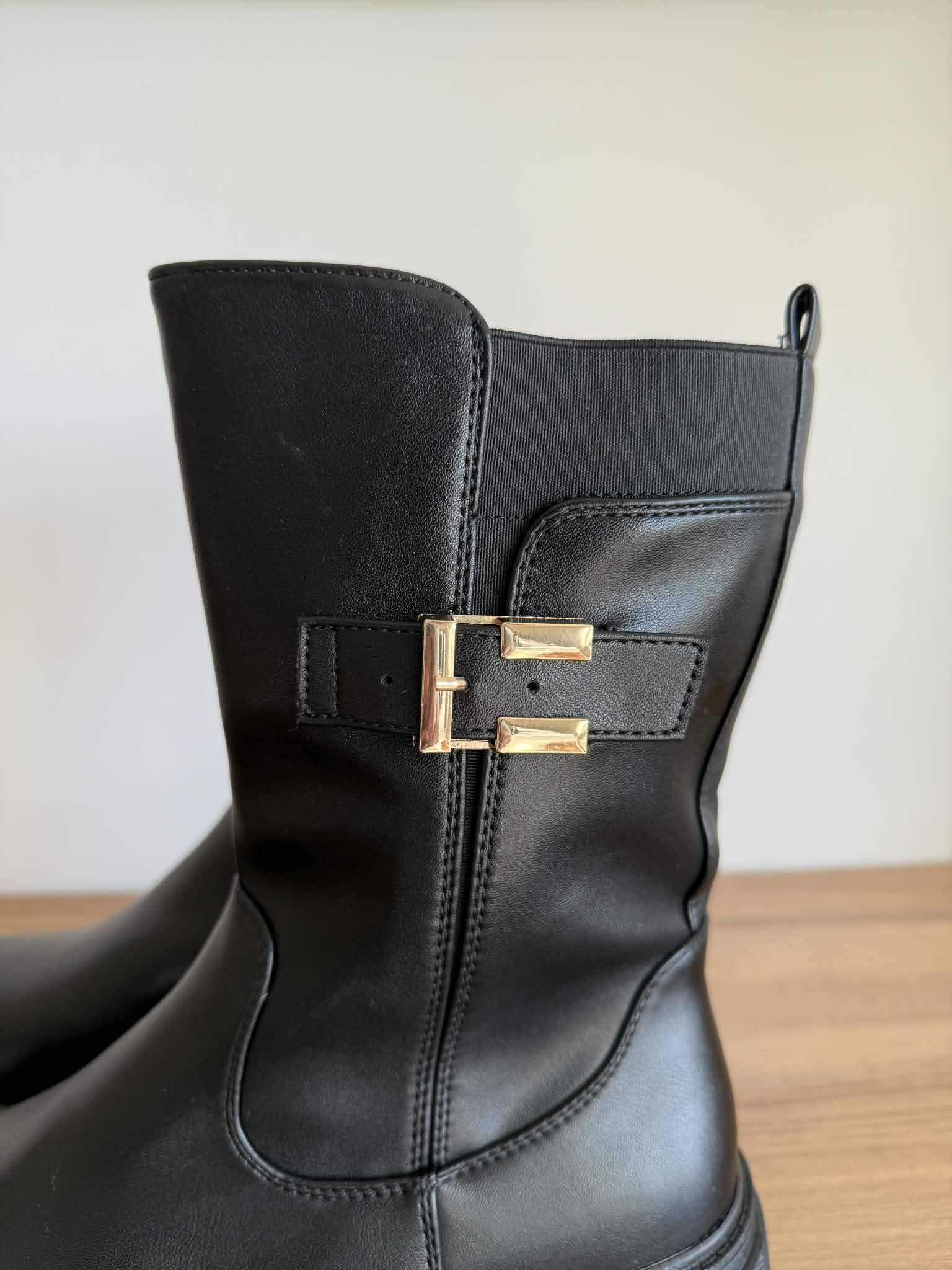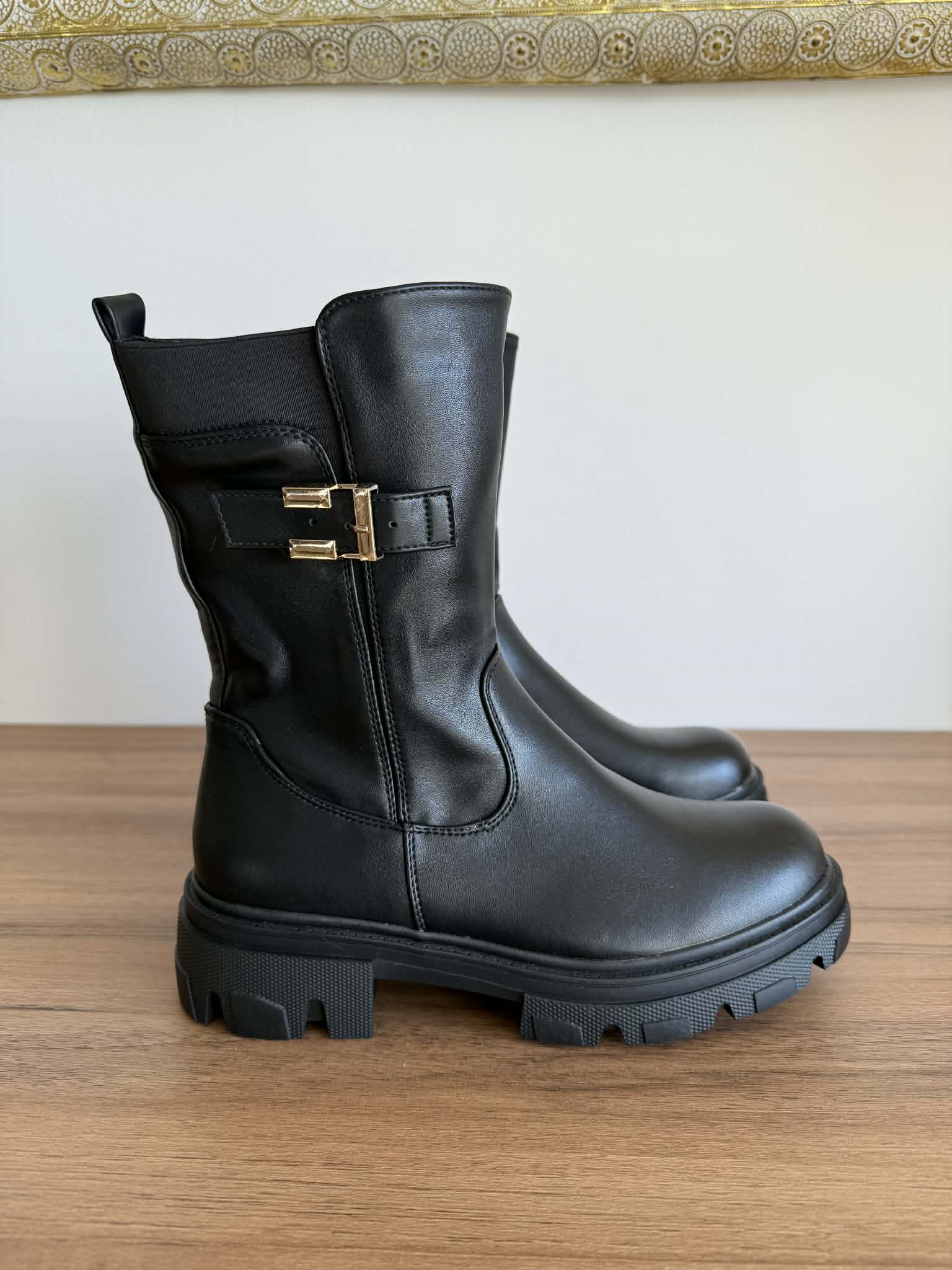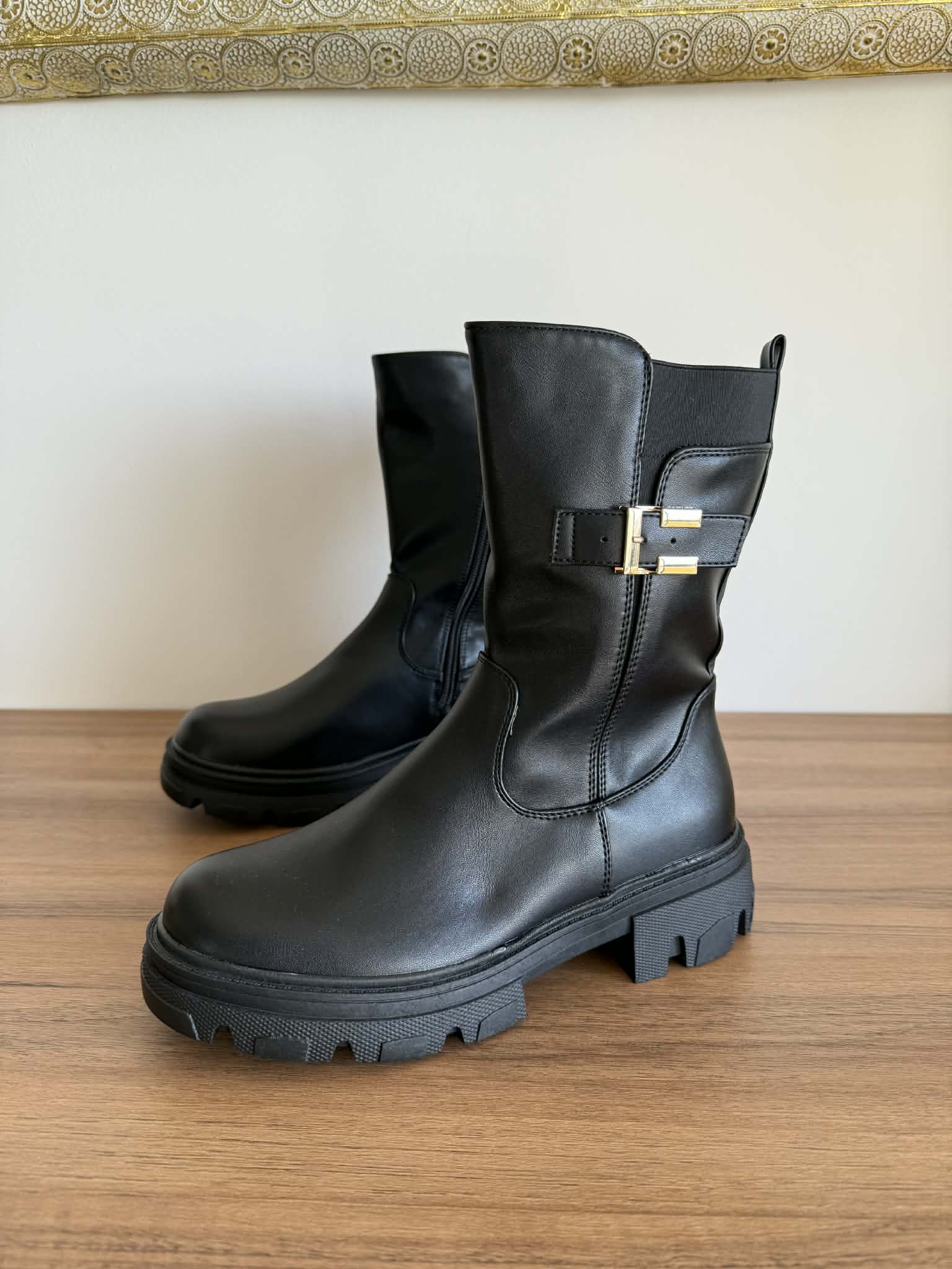 Bota preta de cano médio, em pele sintética. Com fecho e elástico. Forradas a pelo tipo polar. Com sola bulky/grossa. Detalhe de fivela.