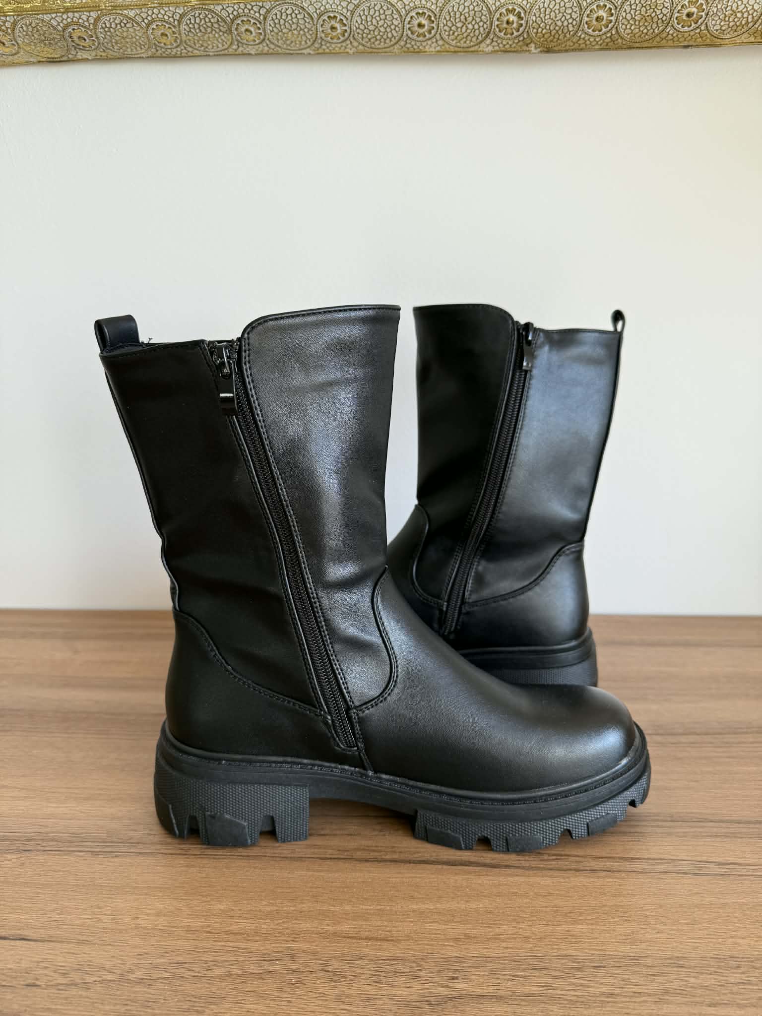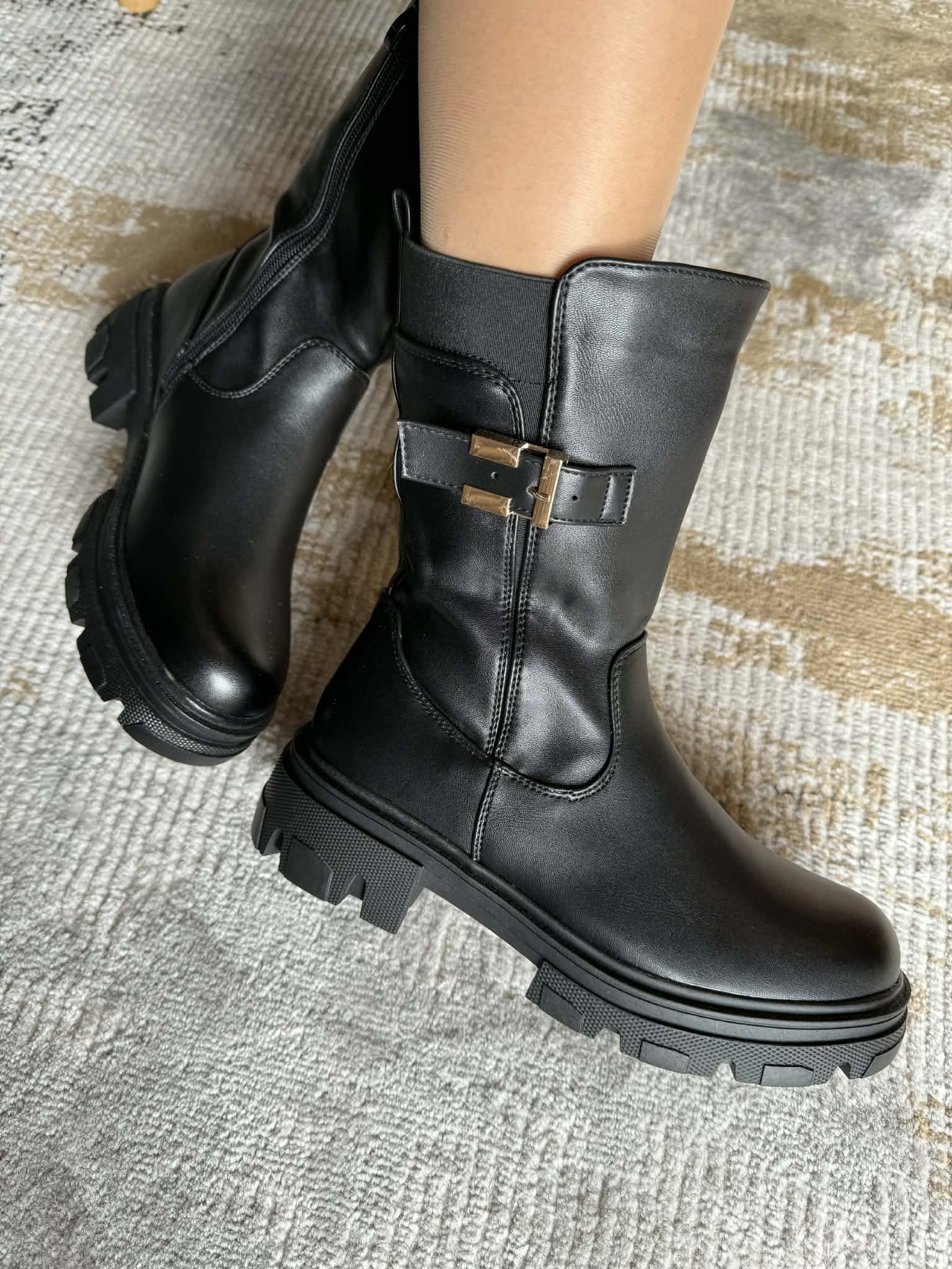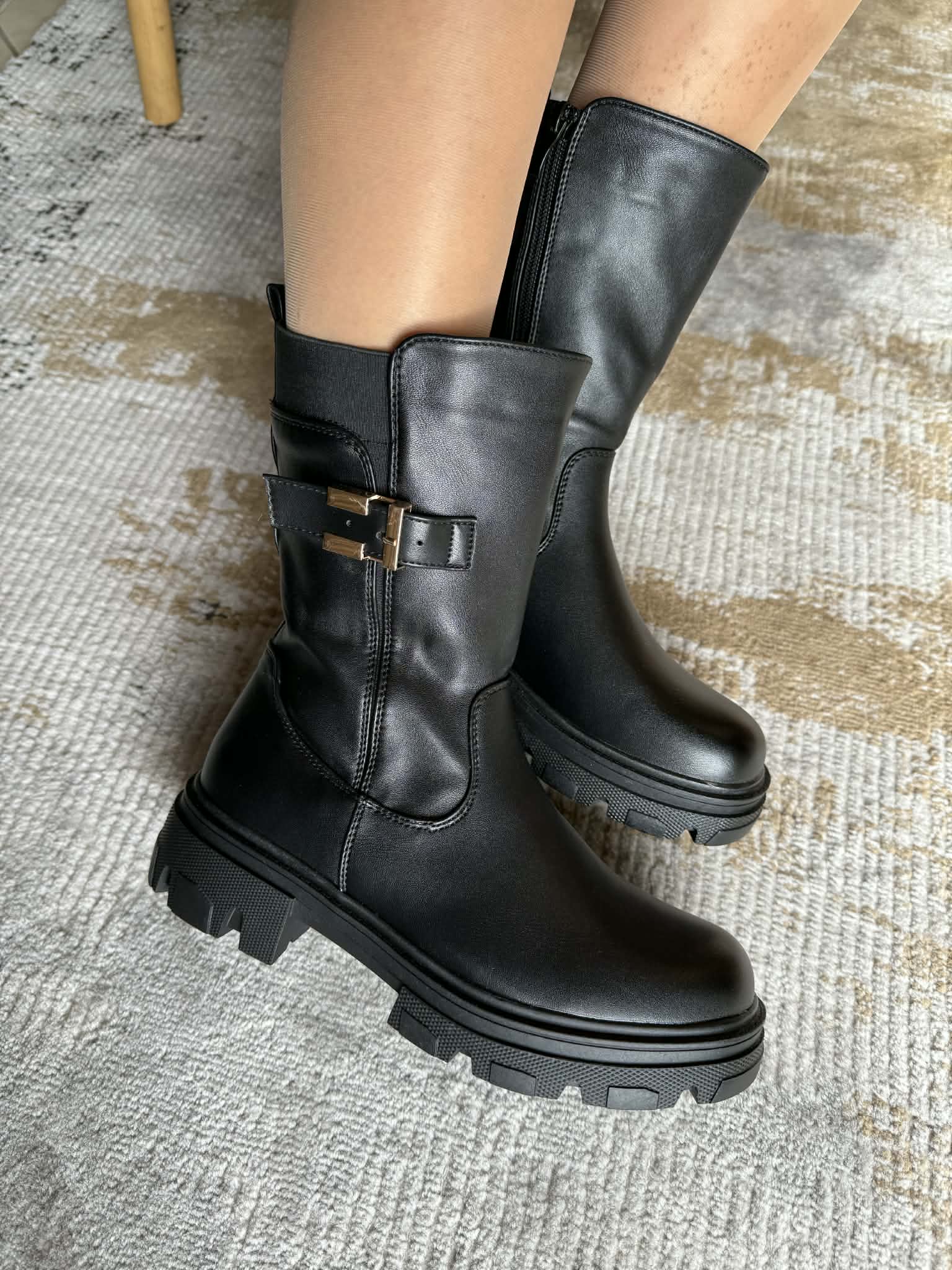 Bota preta de cano médio, em pele sintética. Com fecho e elástico. Forradas a pelo tipo polar. Com sola bulky/grossa. Detalhe de fivela.