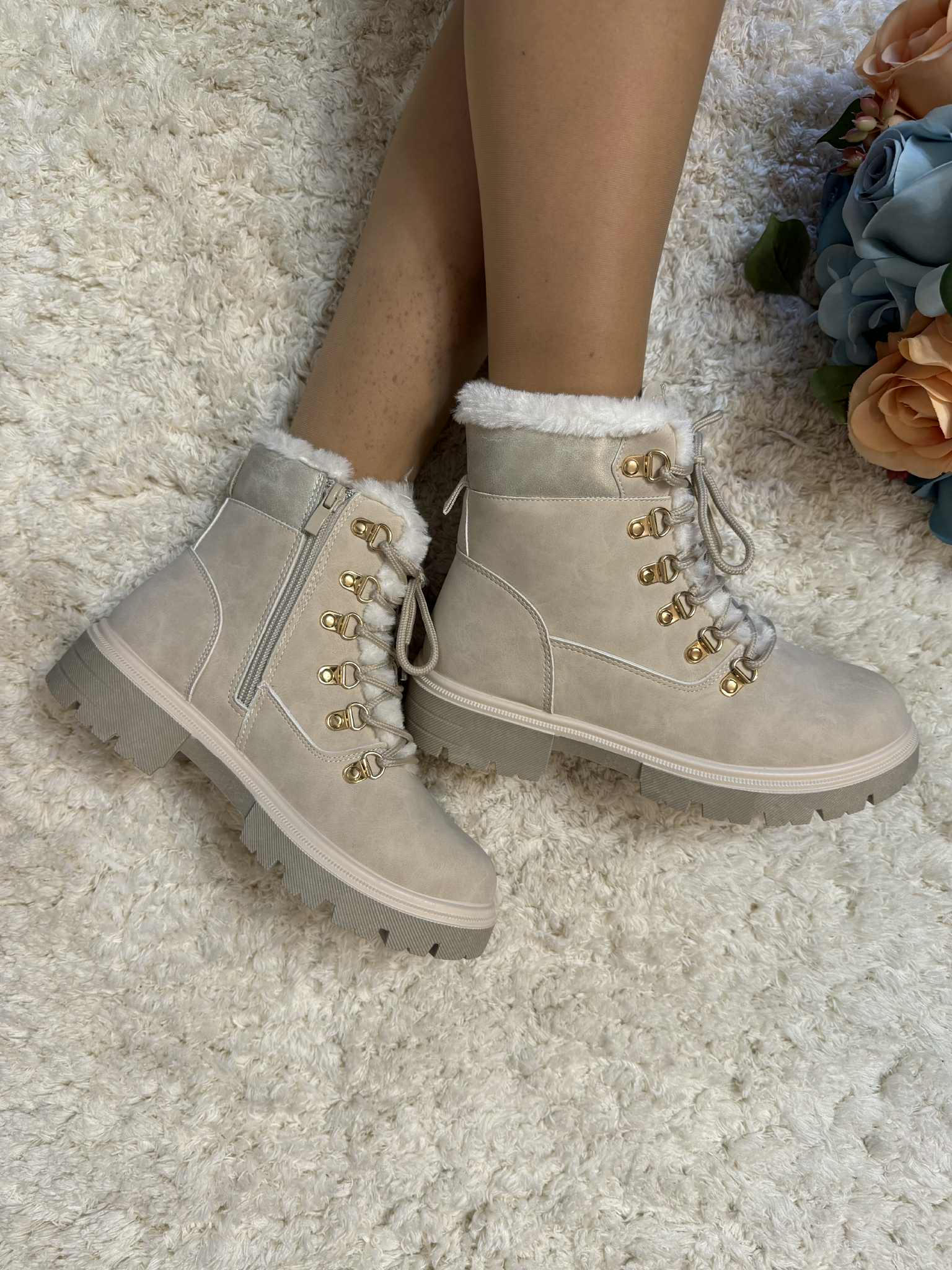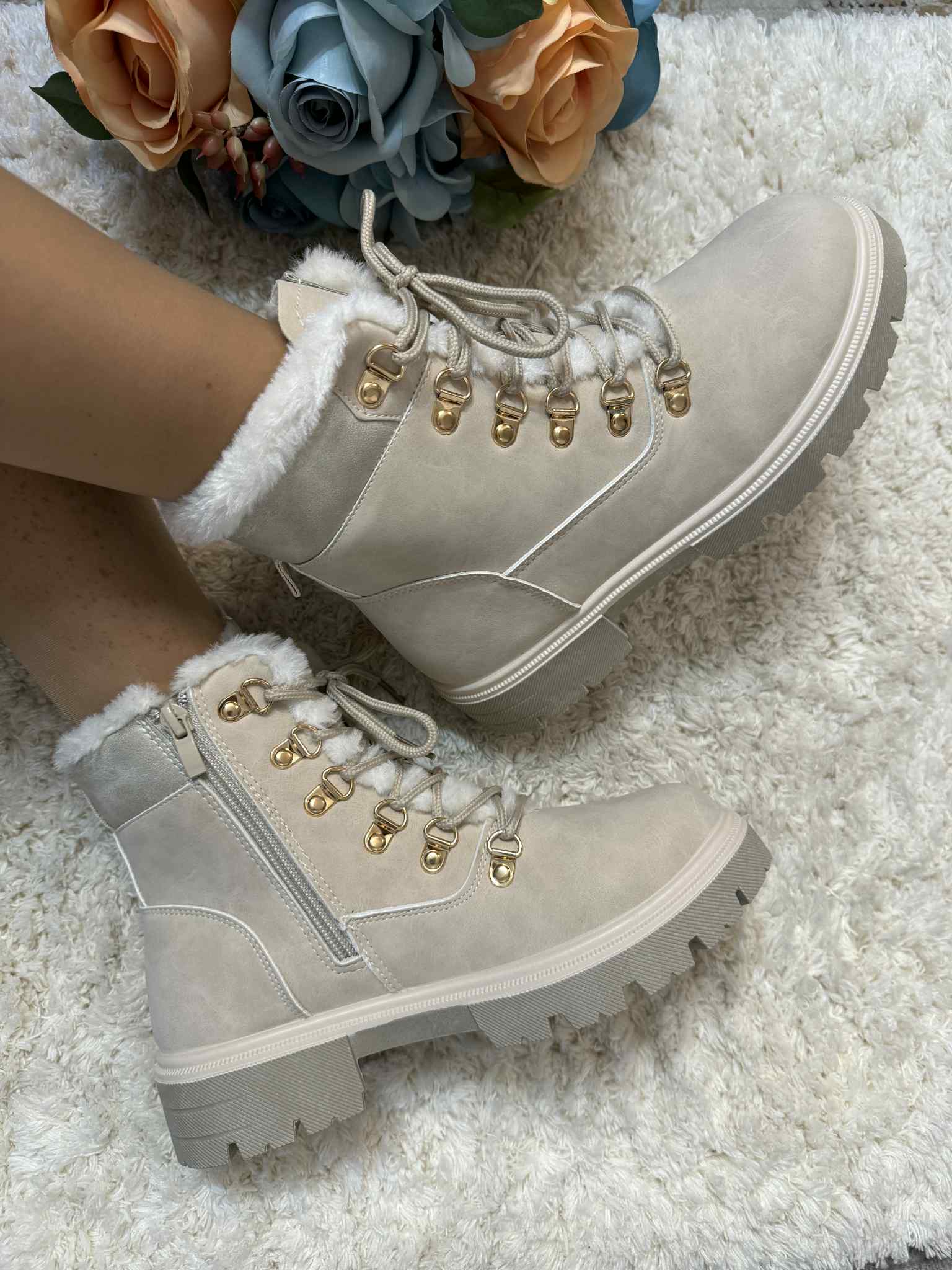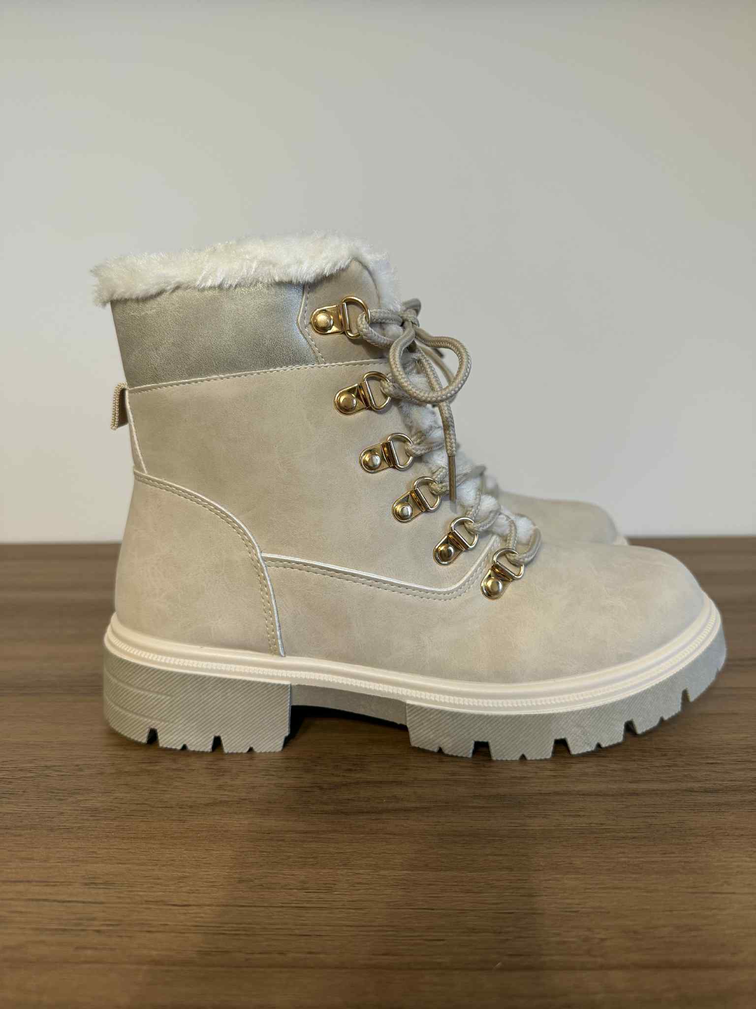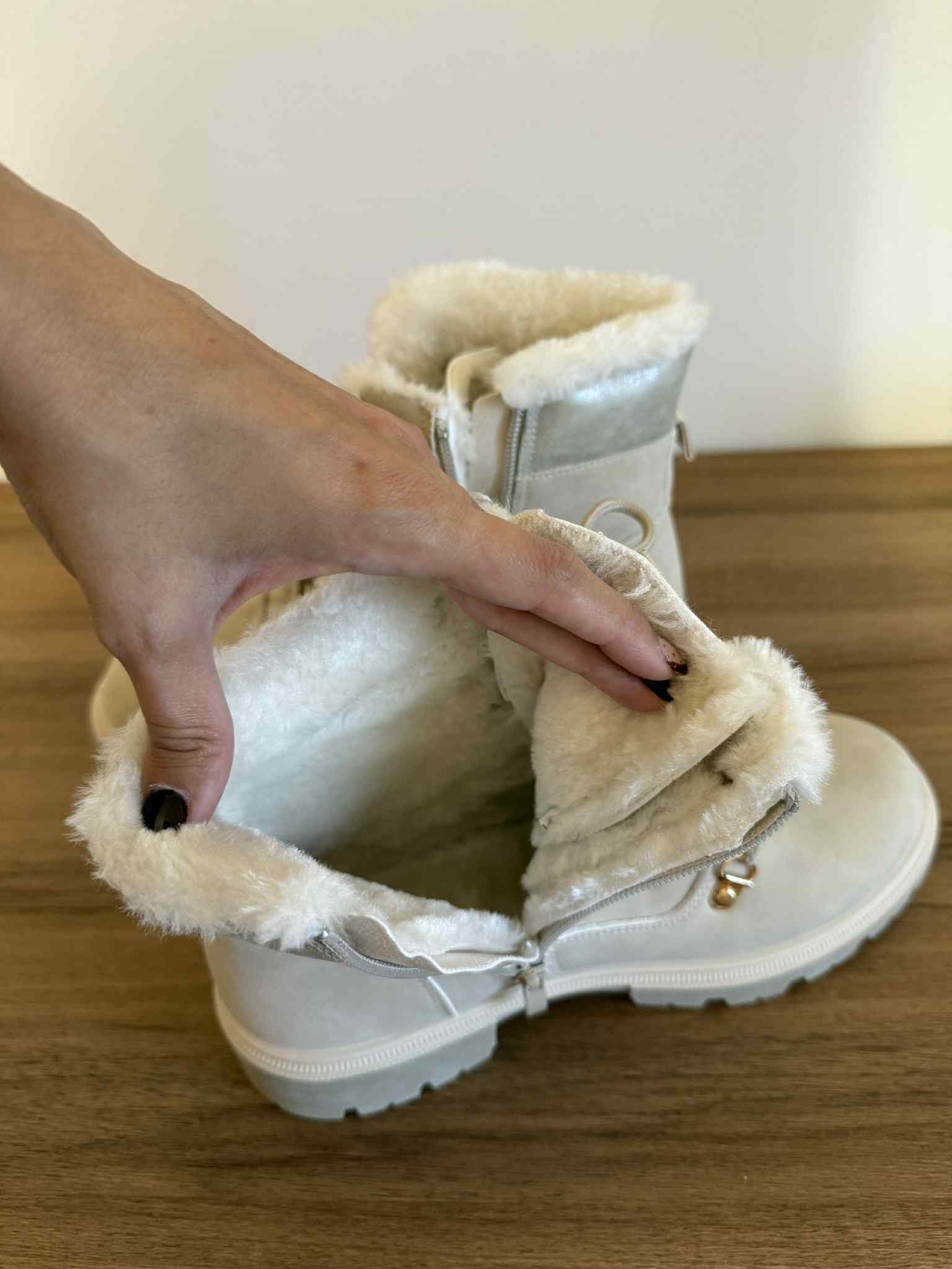 Bota forrada a pelo, com fecho e atacador. Em pele sintética.