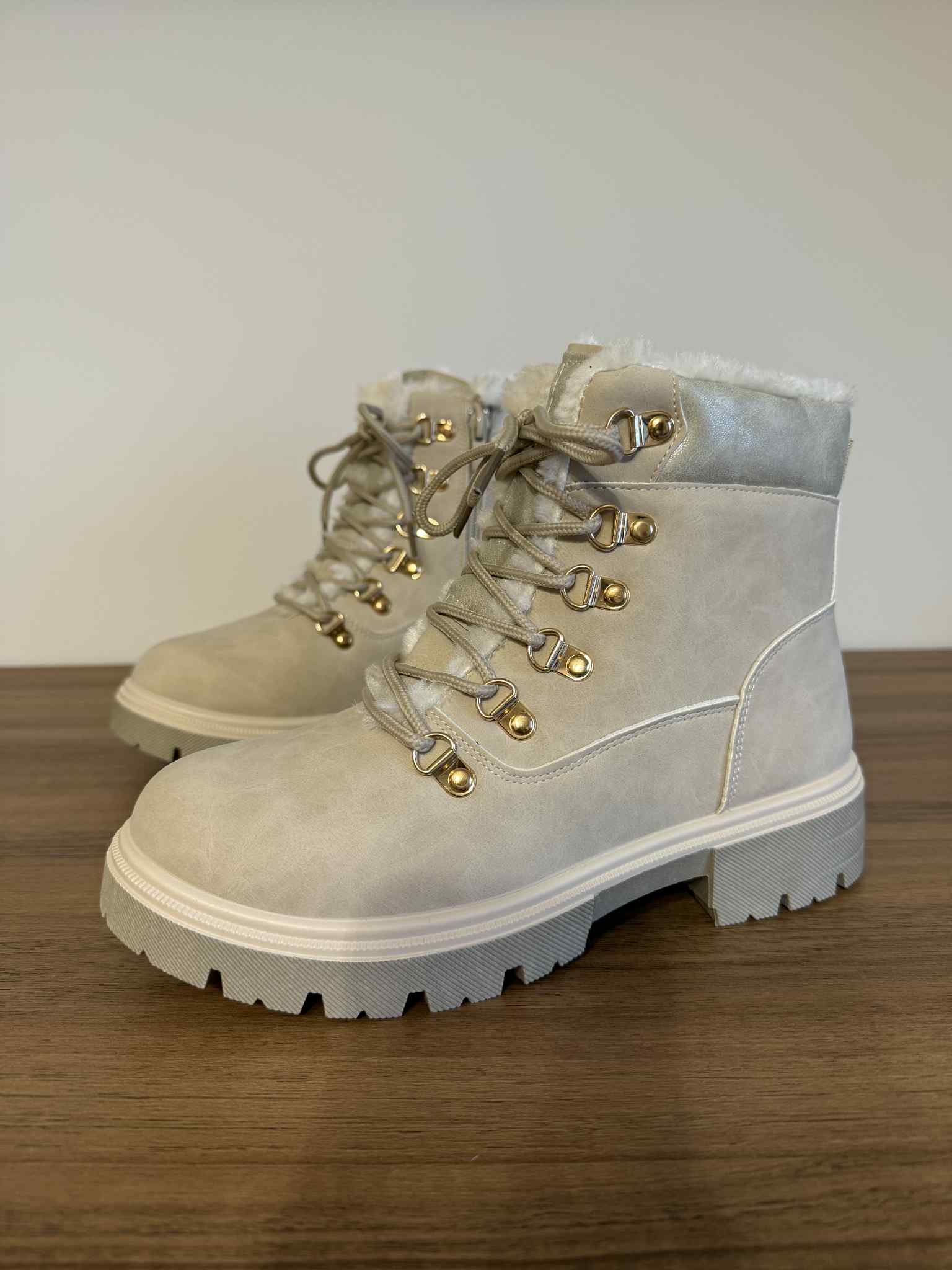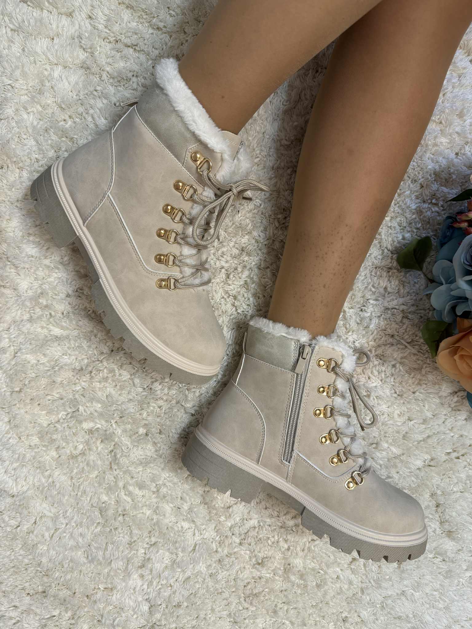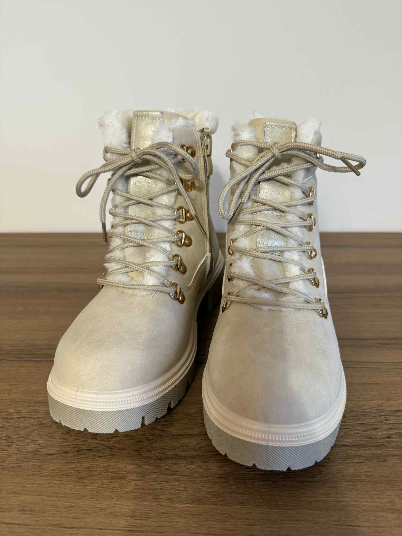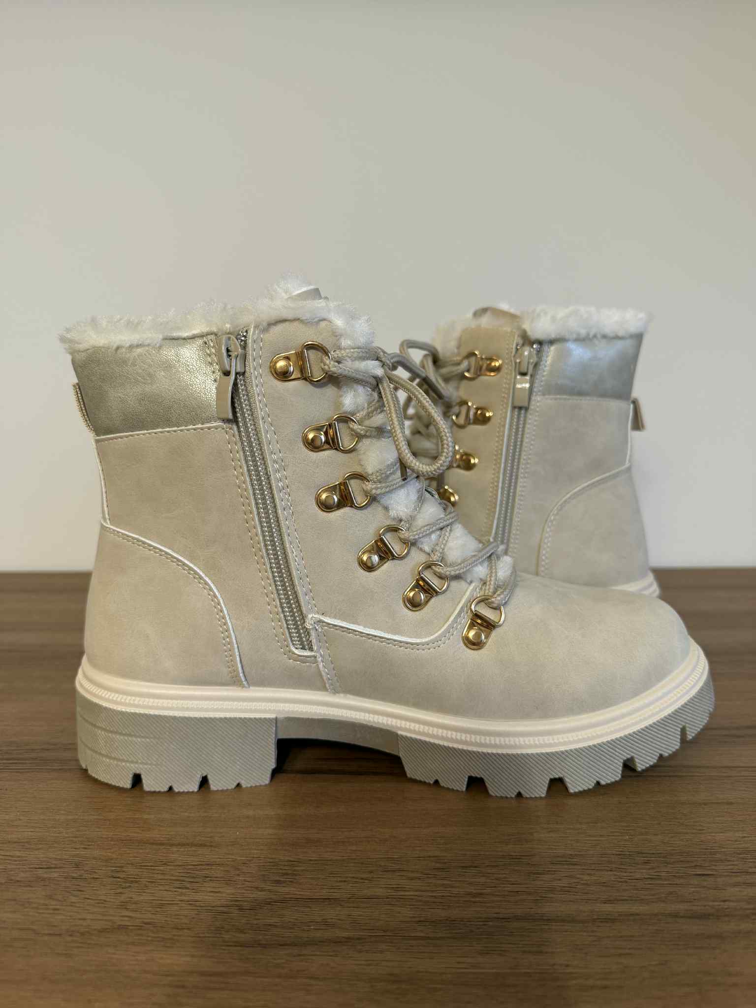 Bota forrada a pelo, com fecho e atacador. Em pele sintética.