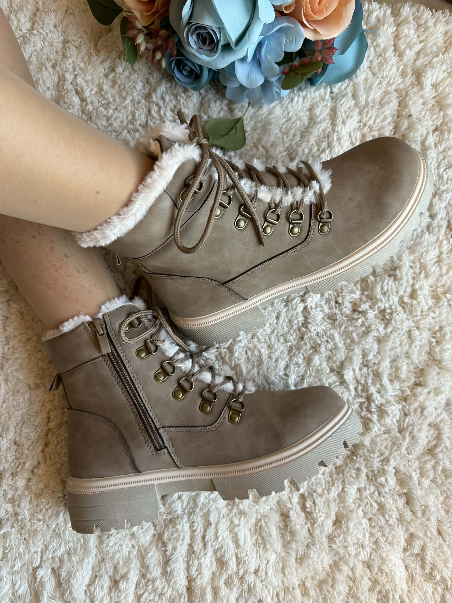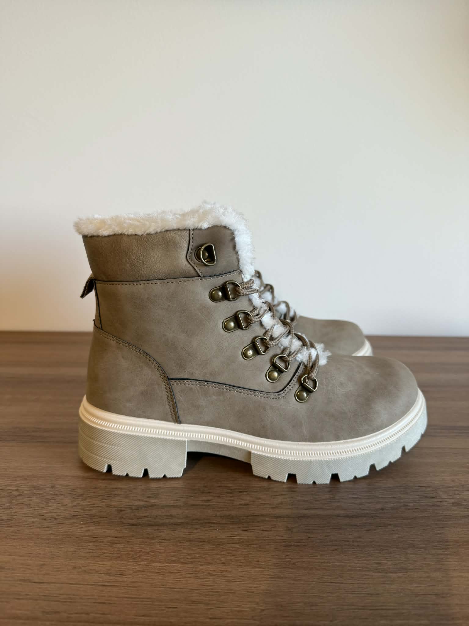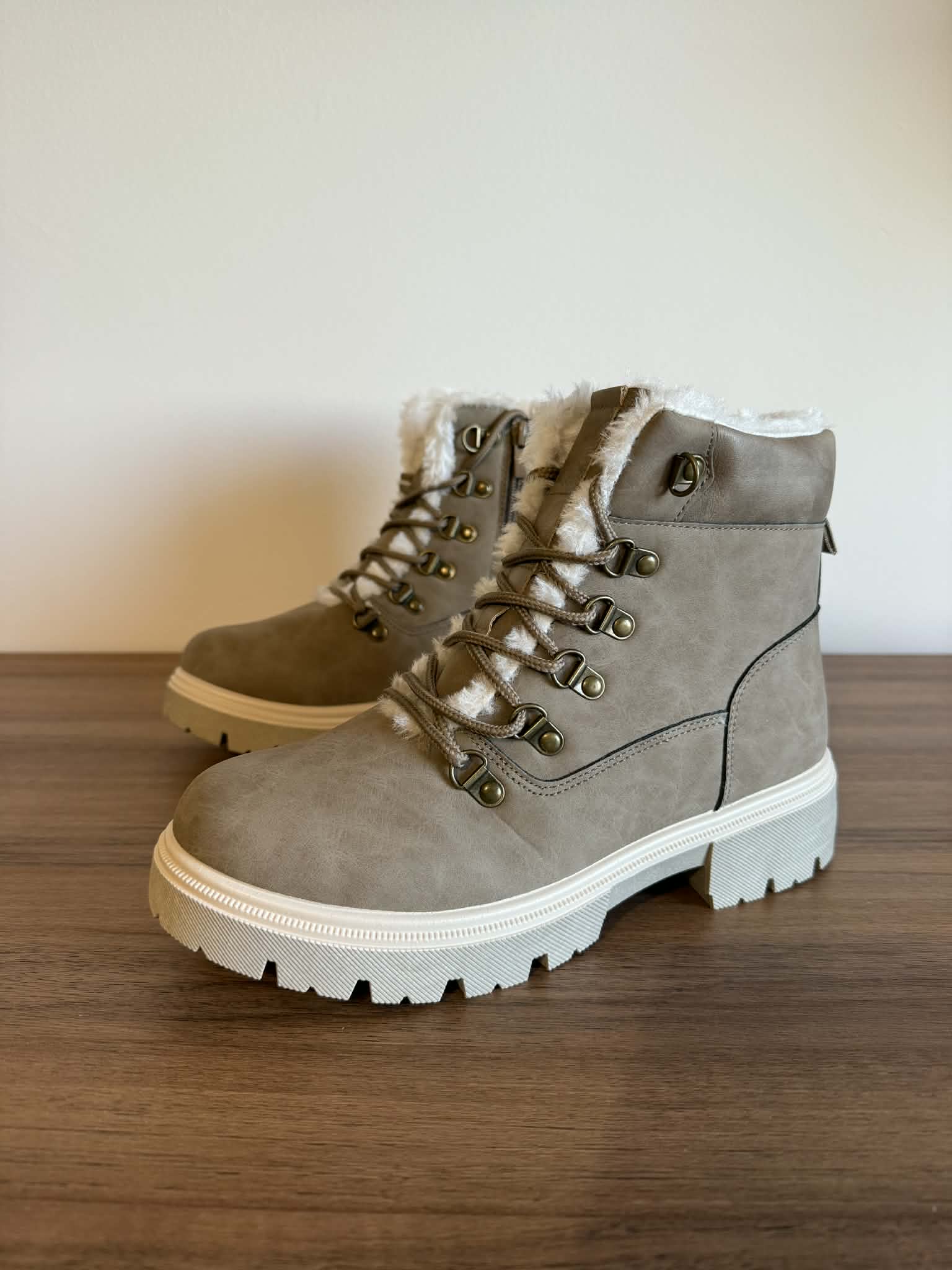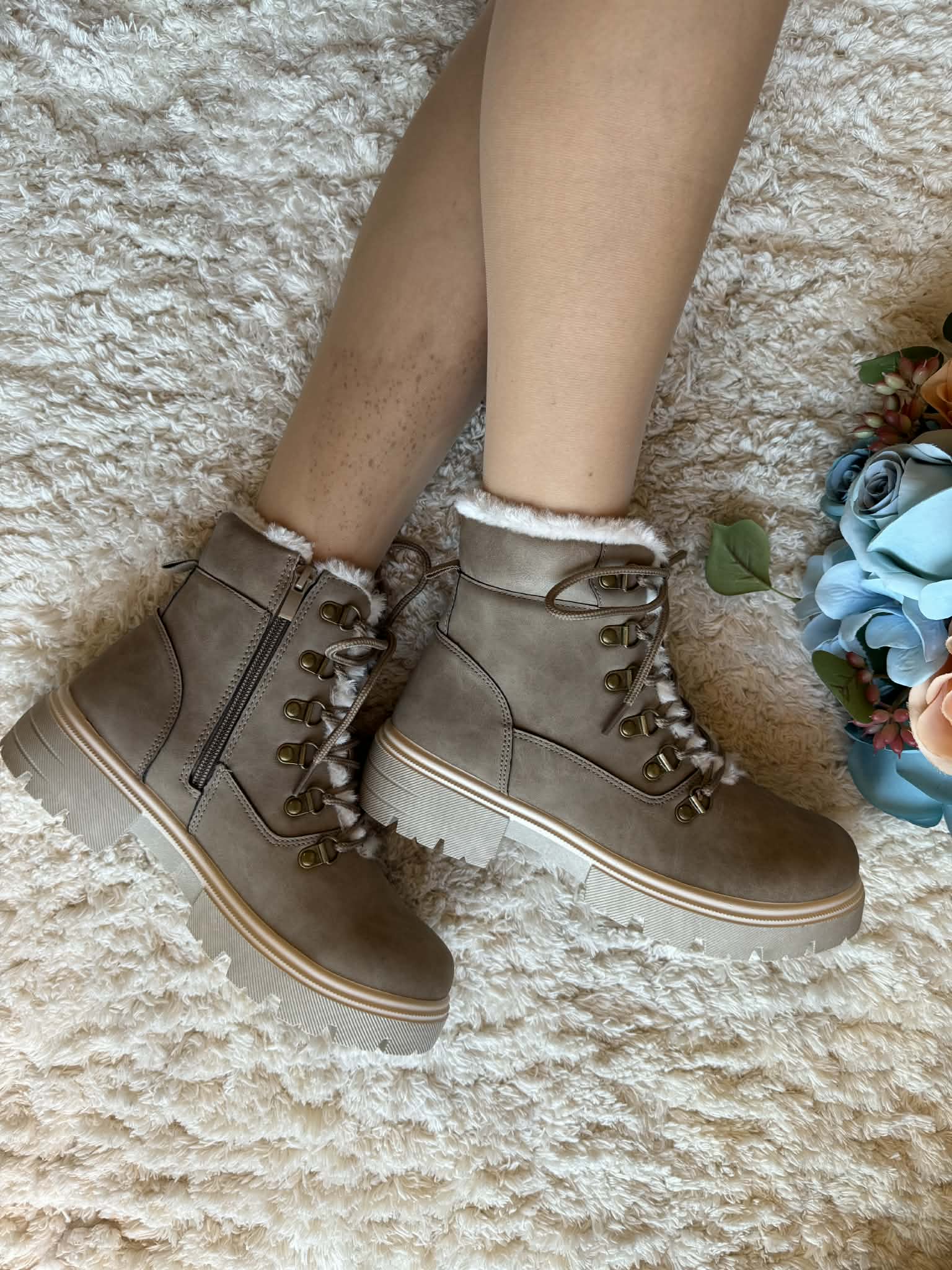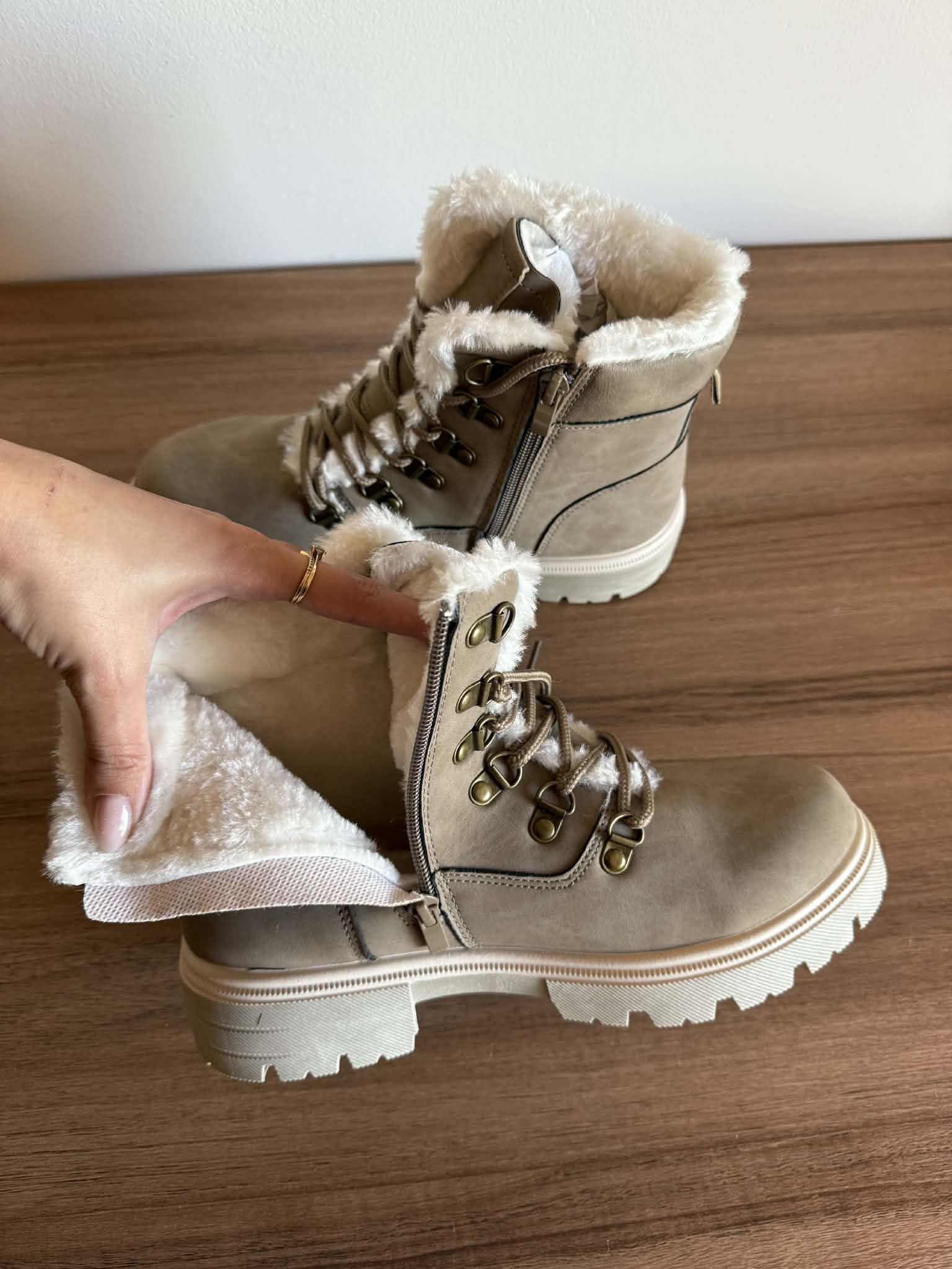 Bota forrada a pelo, com fecho e atacador. Em pele sintética.