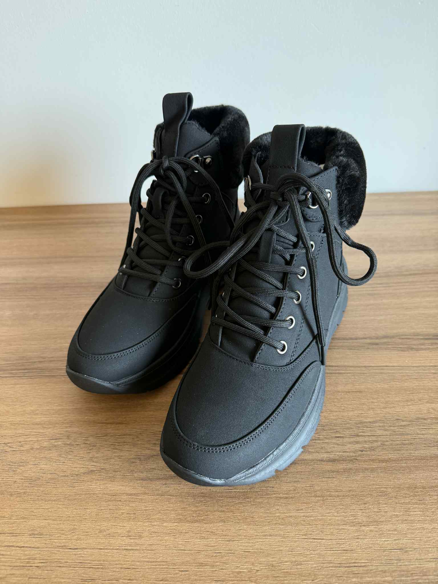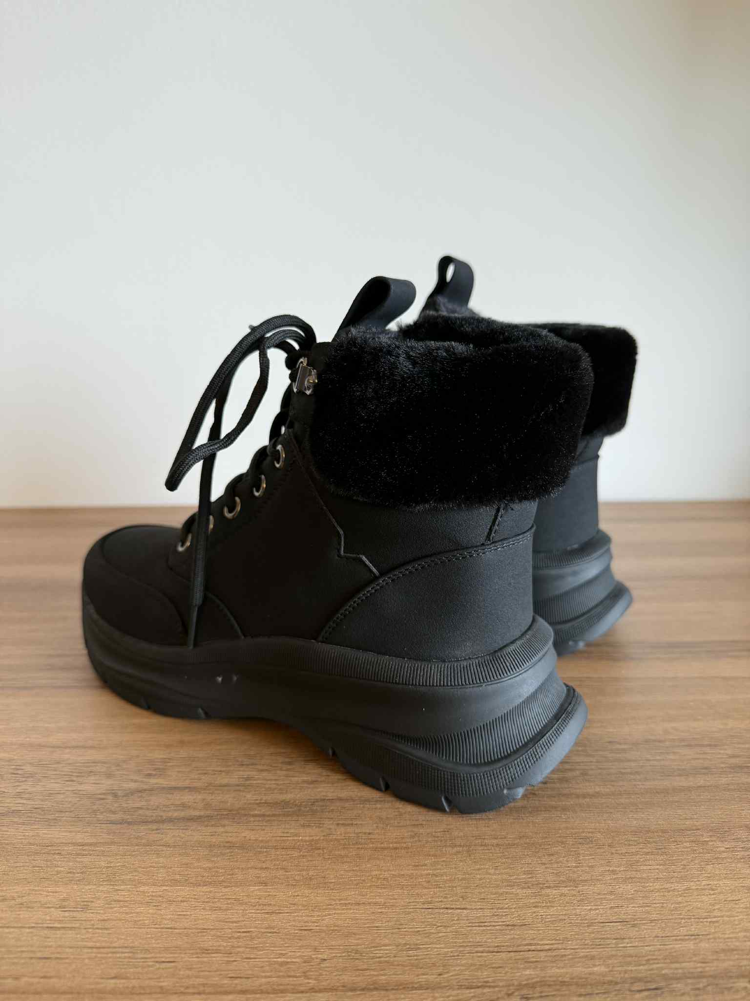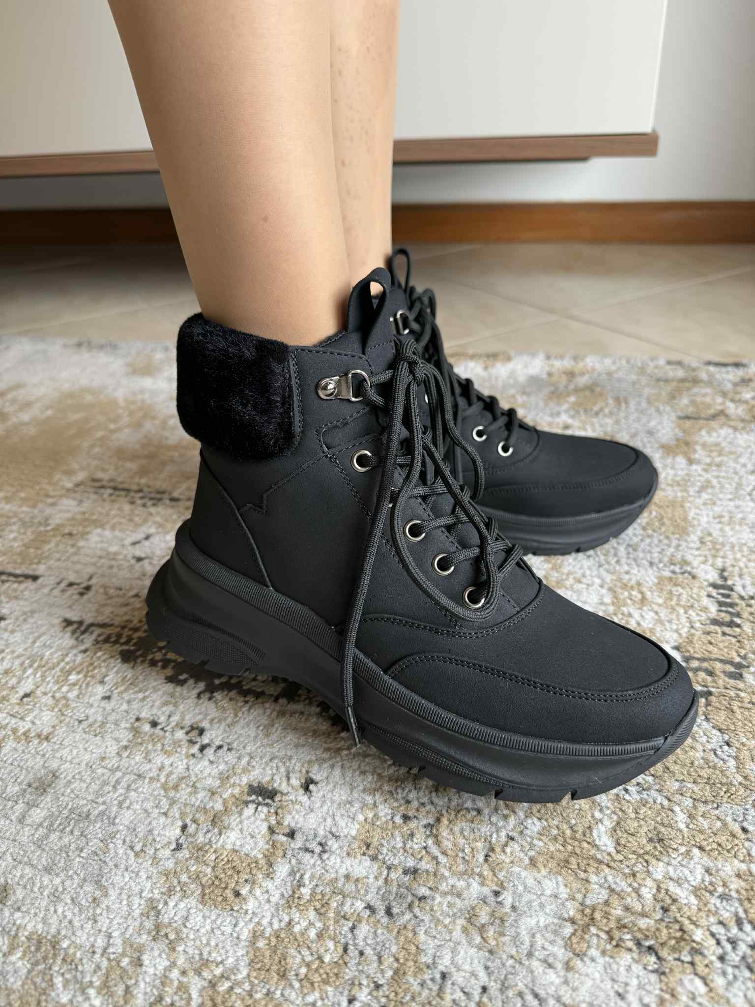 Bota feminina desportiva, com atacadores. Em pele sintética. Com detalhe de pelinho.