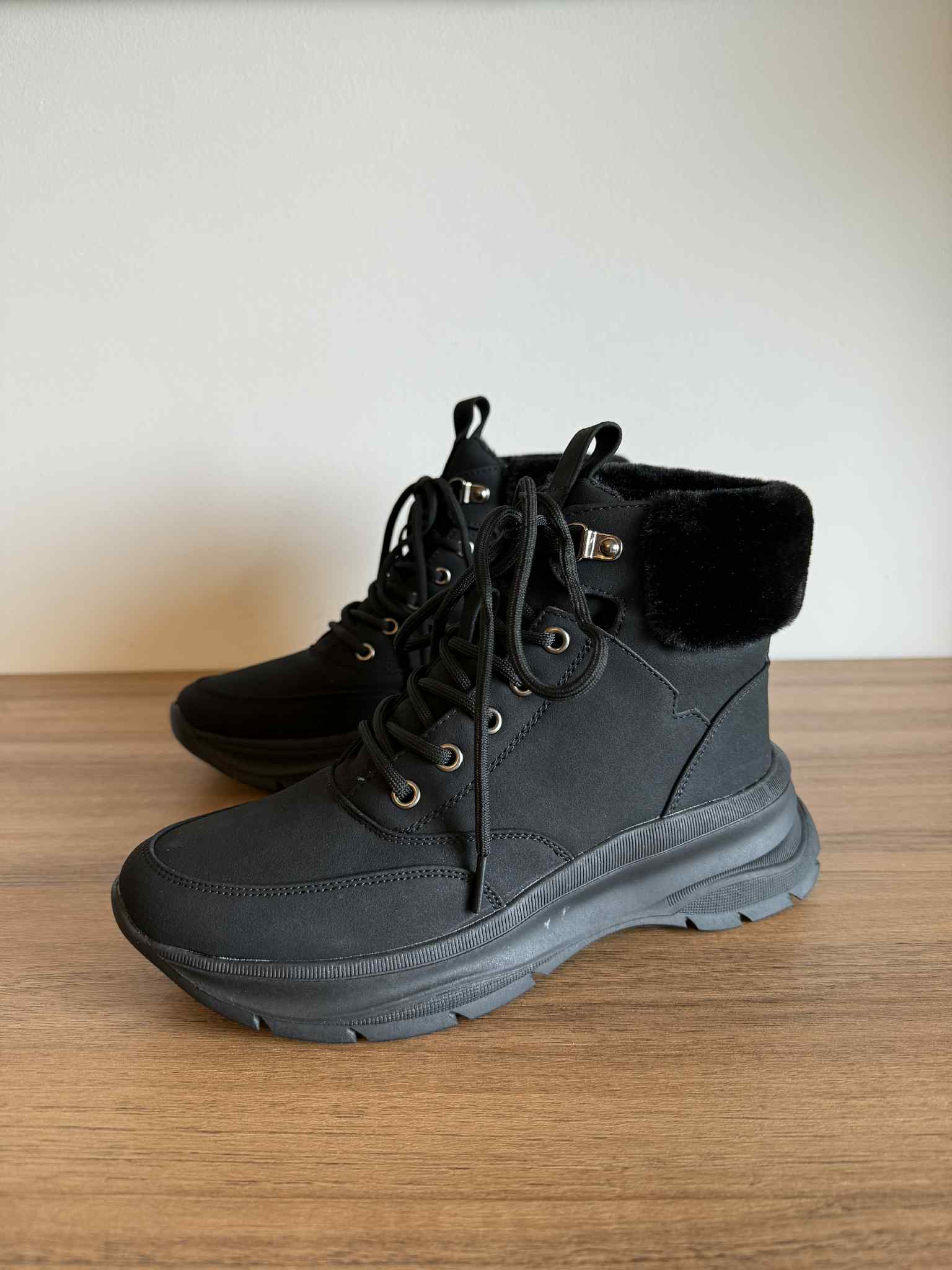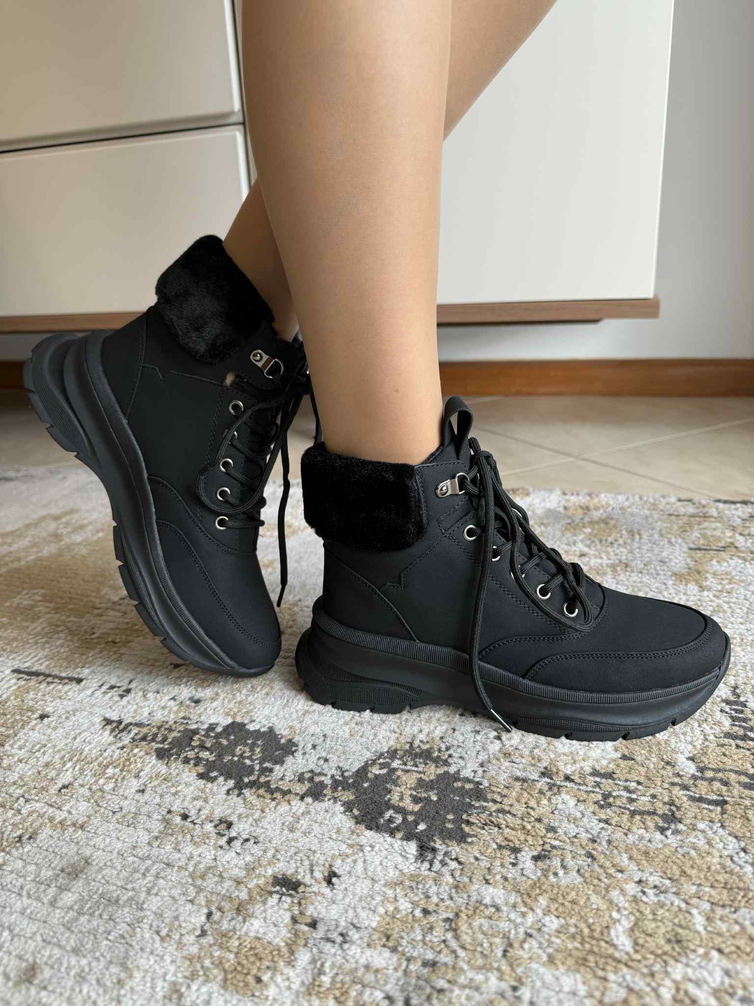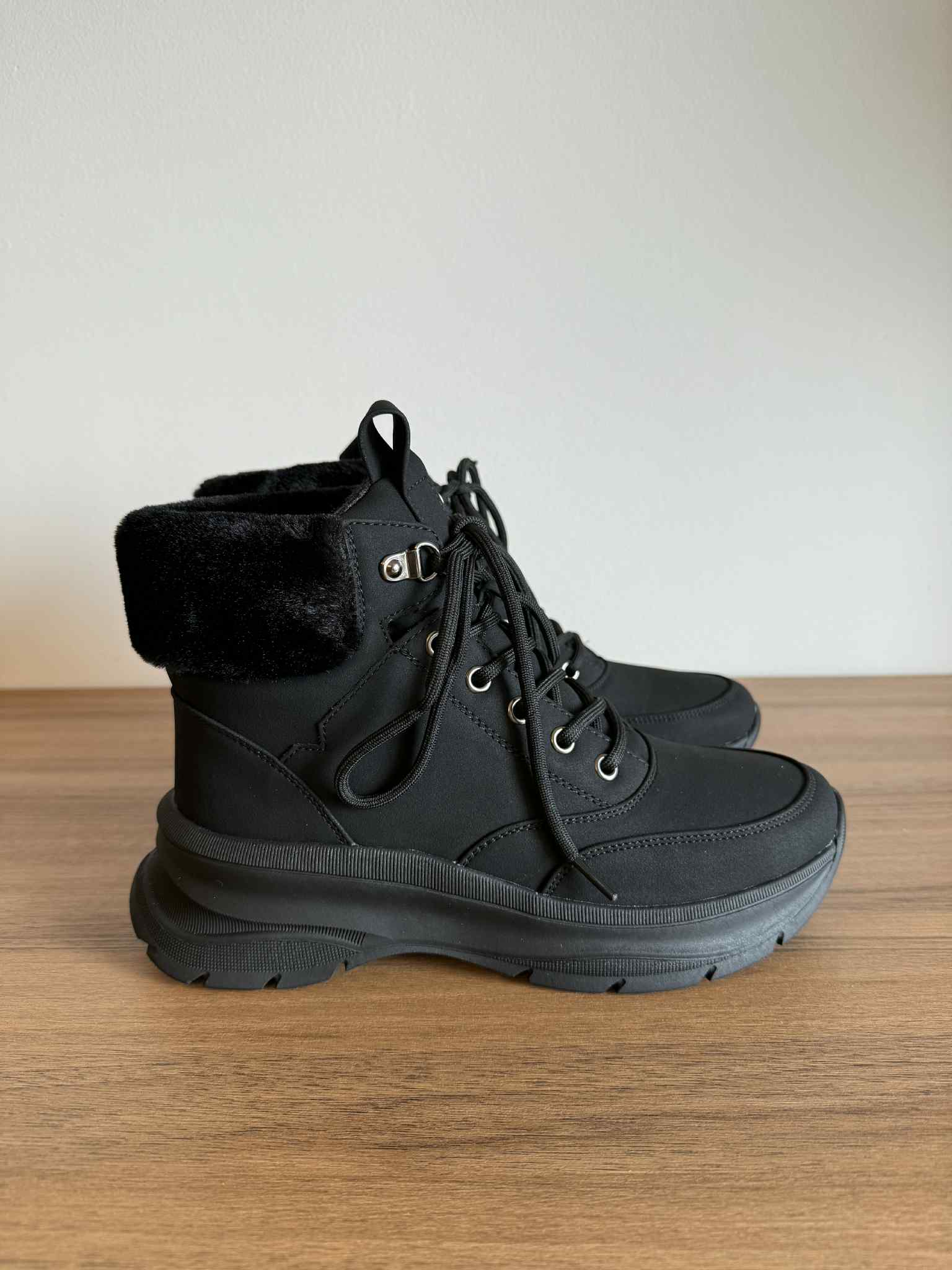 Bota feminina desportiva, com atacadores. Em pele sintética. Com detalhe de pelinho.