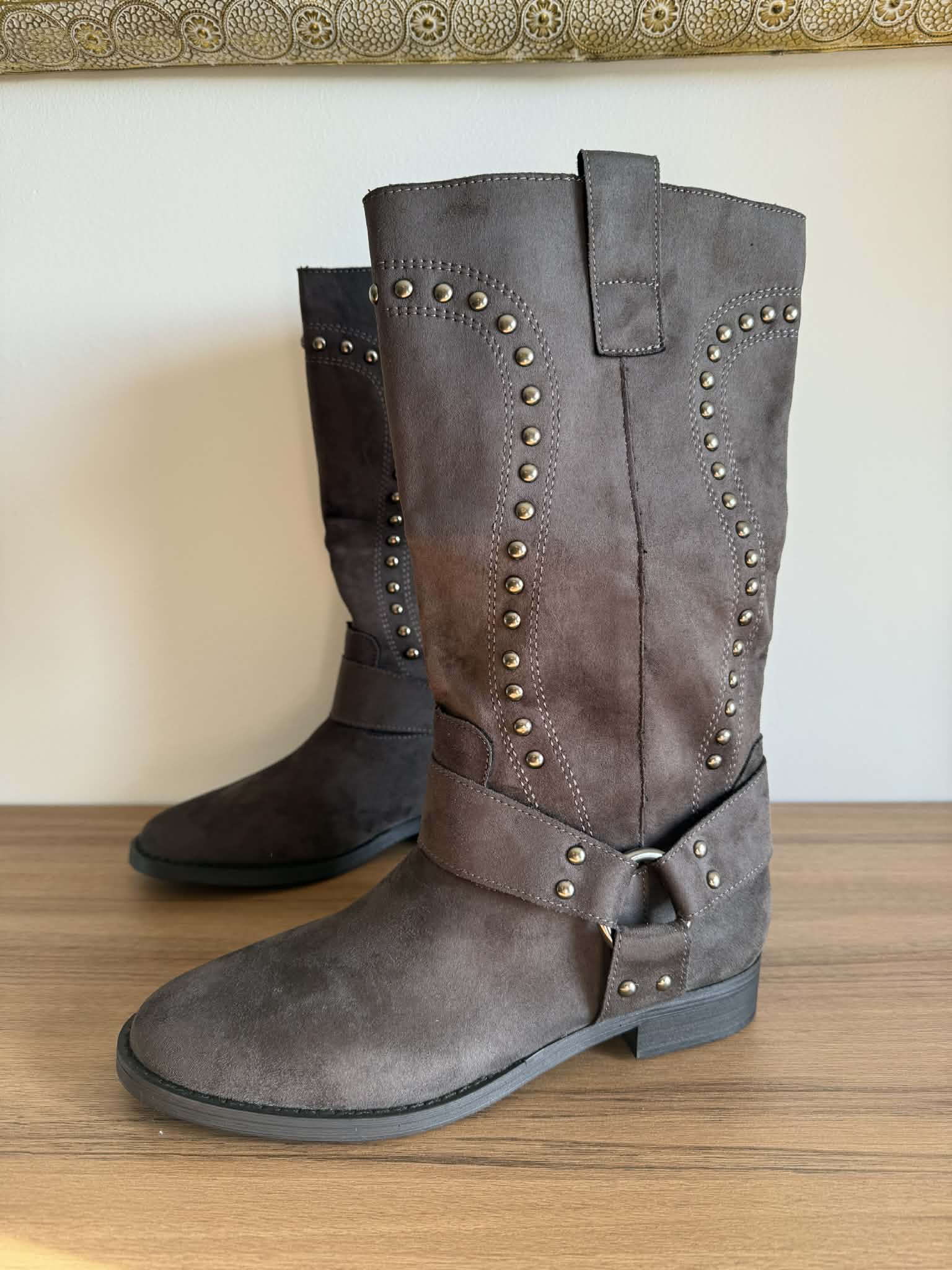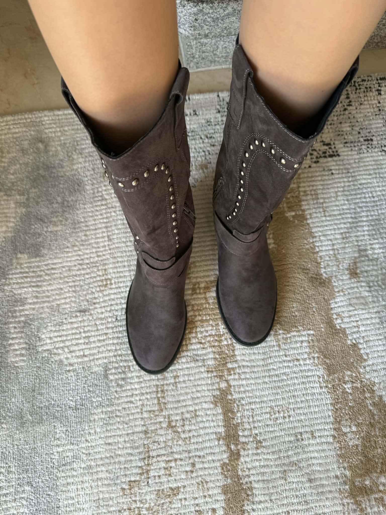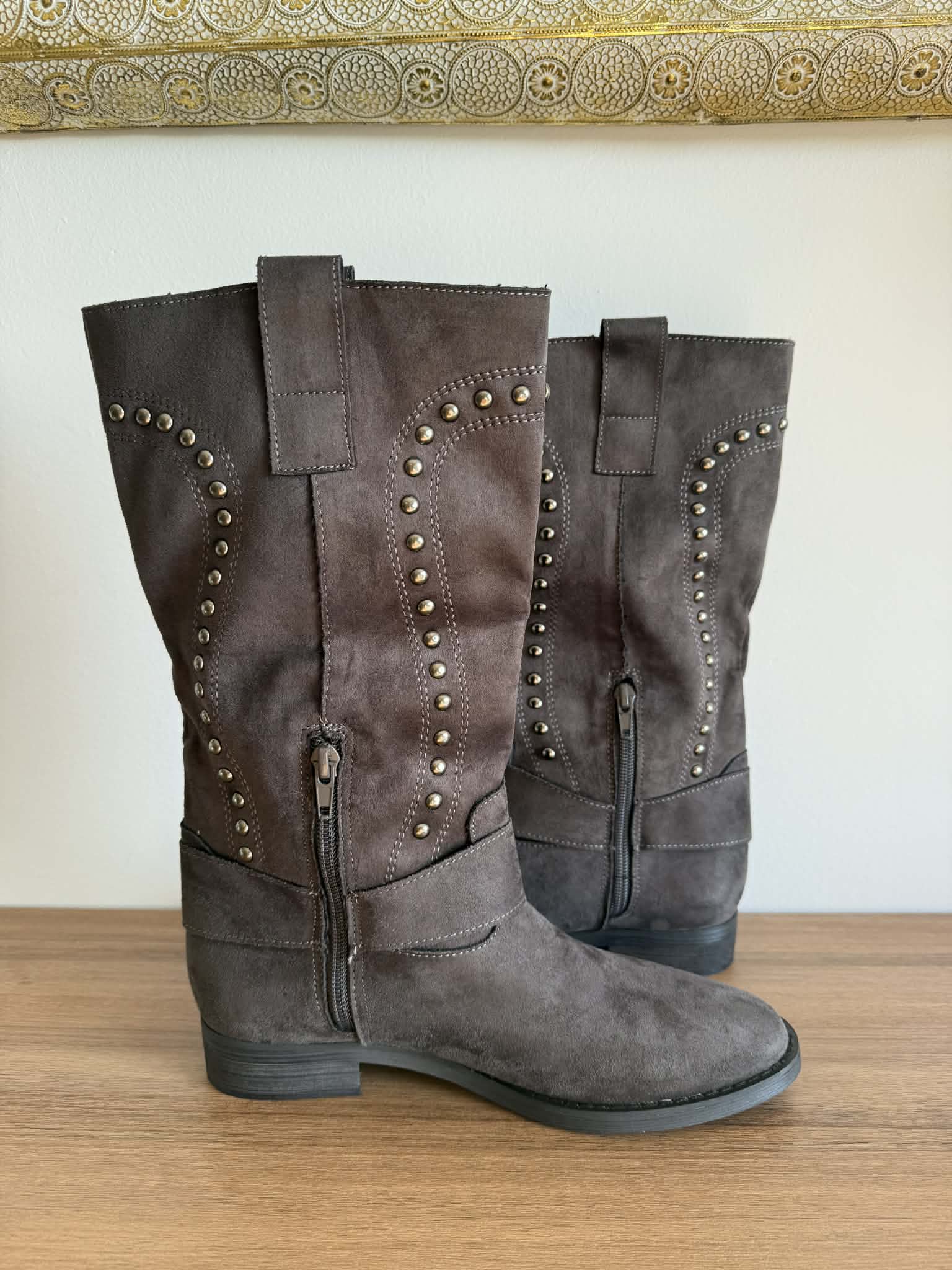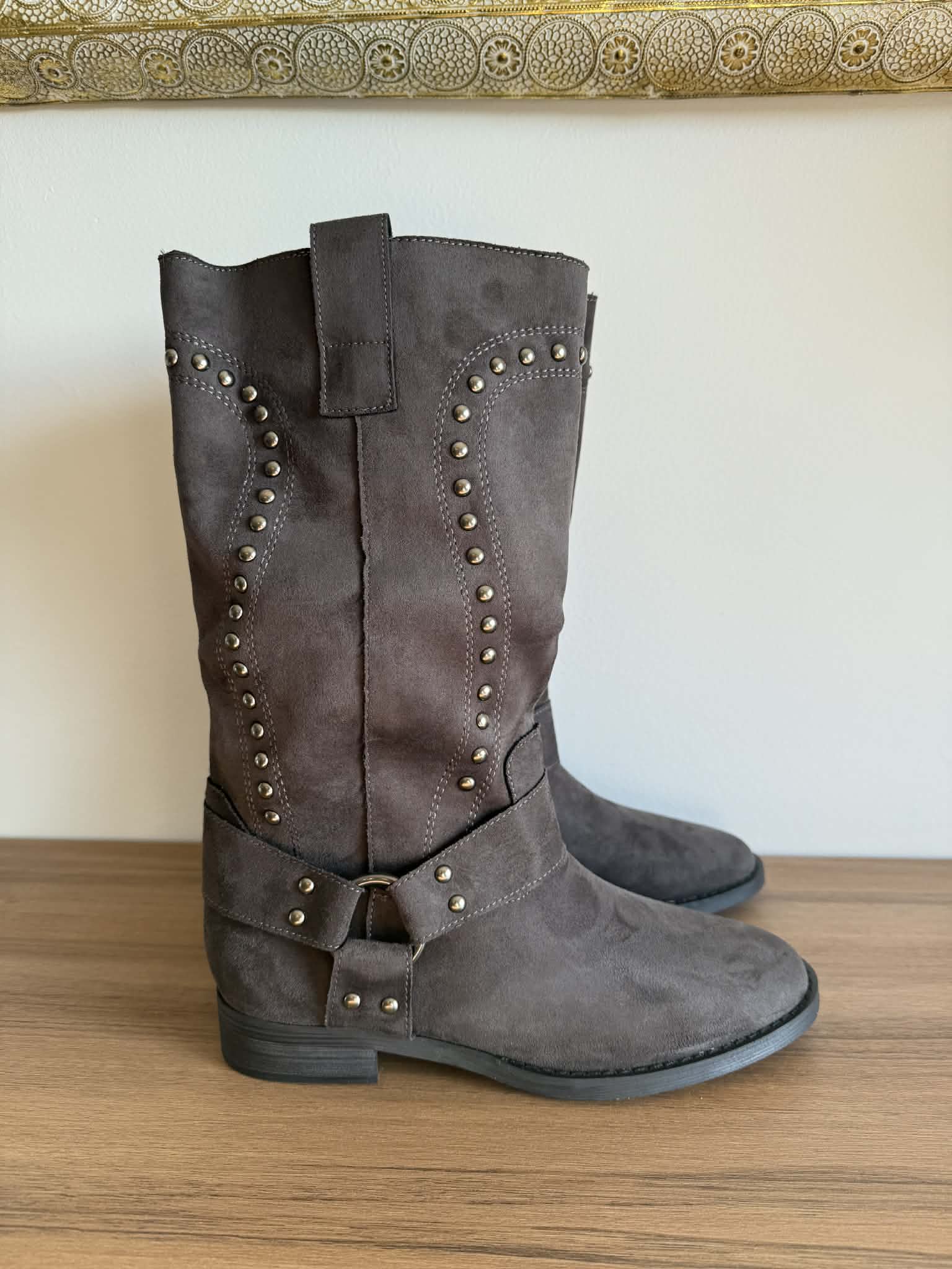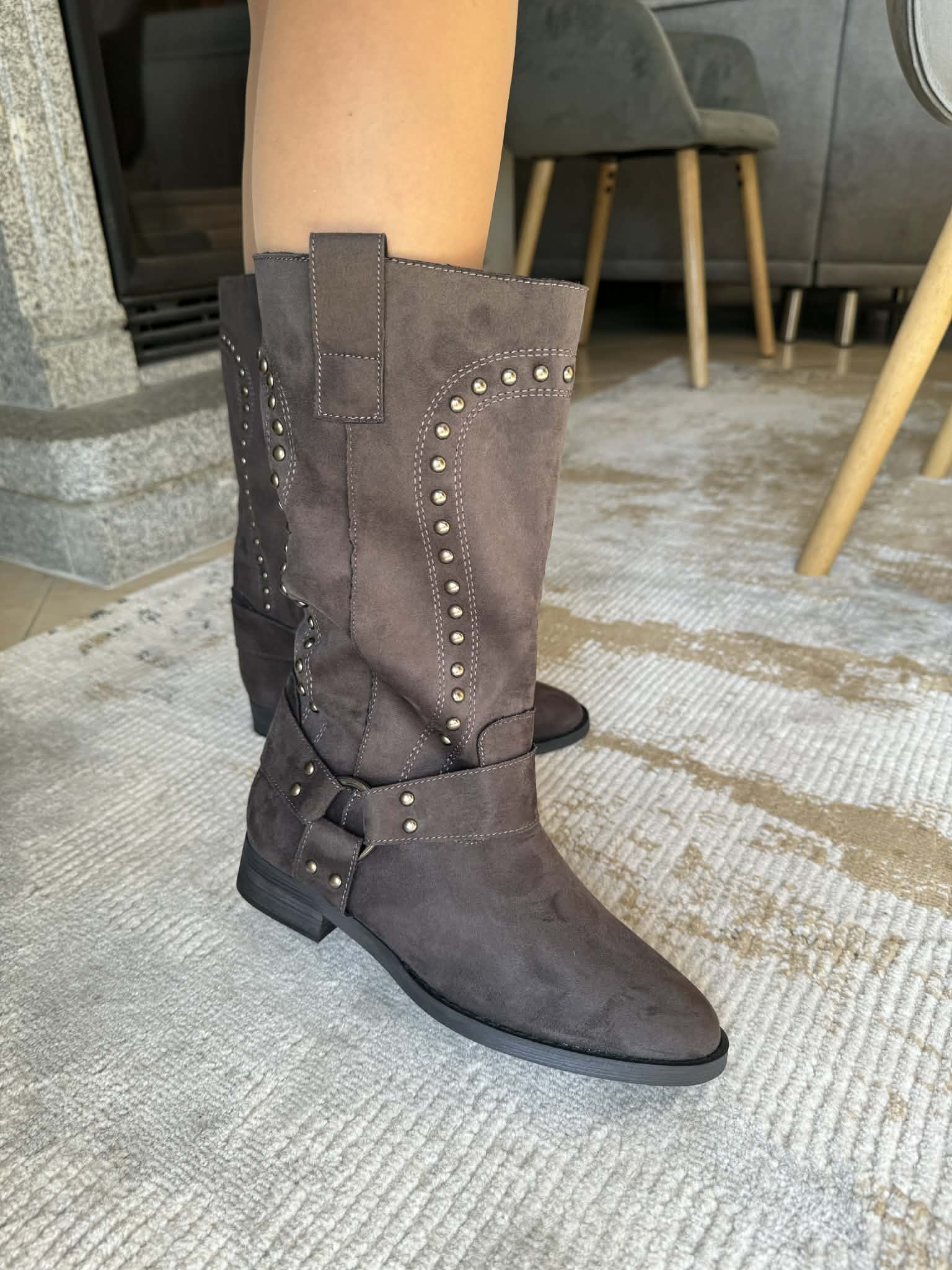 Bota de cano alto, estilo biker, da marca Corina. Em camurça sintética fléxivel e macia. Com tachas decorativas. Tem fecho. Interior em tecido muito macio. Sola rasa.