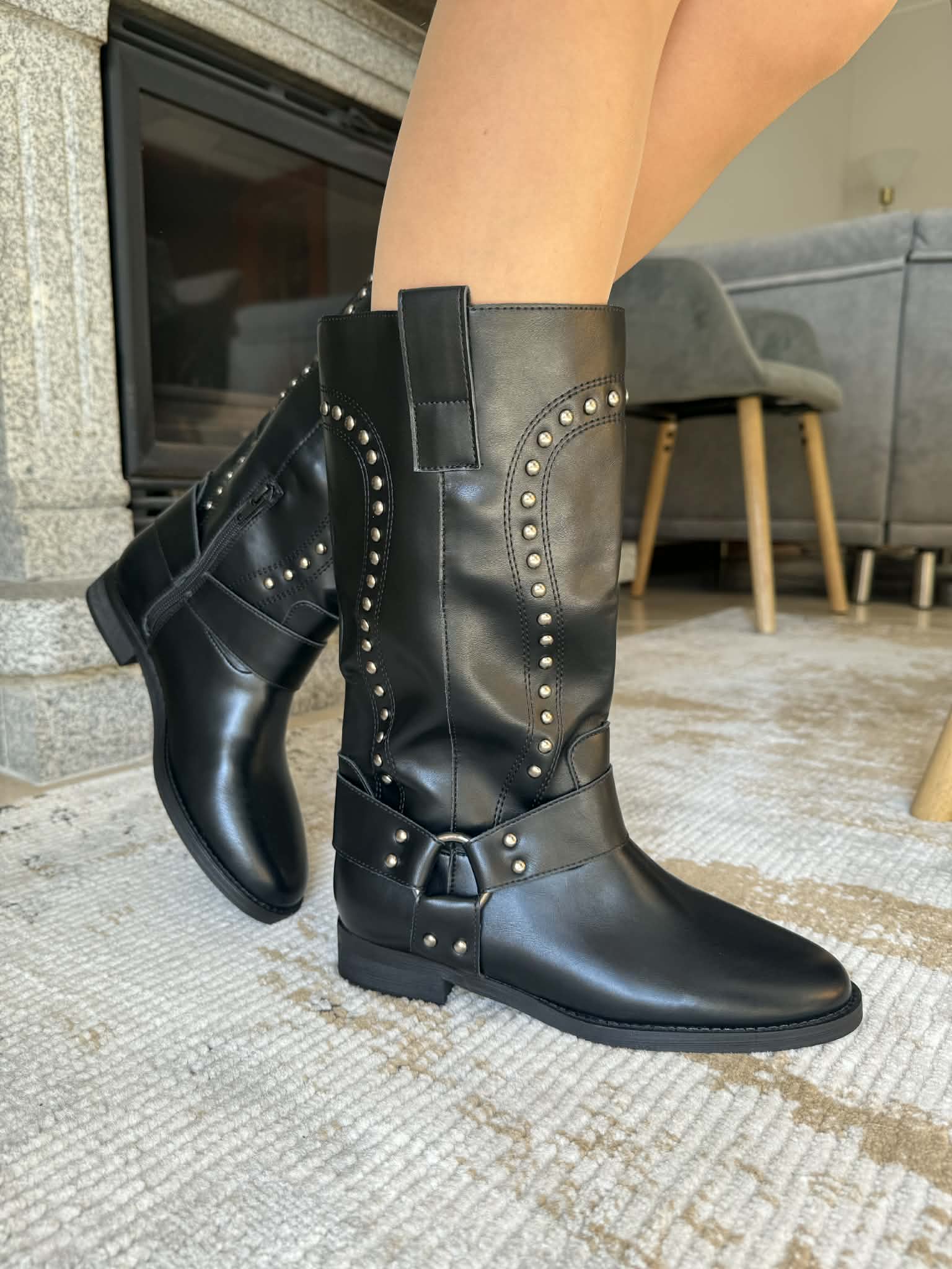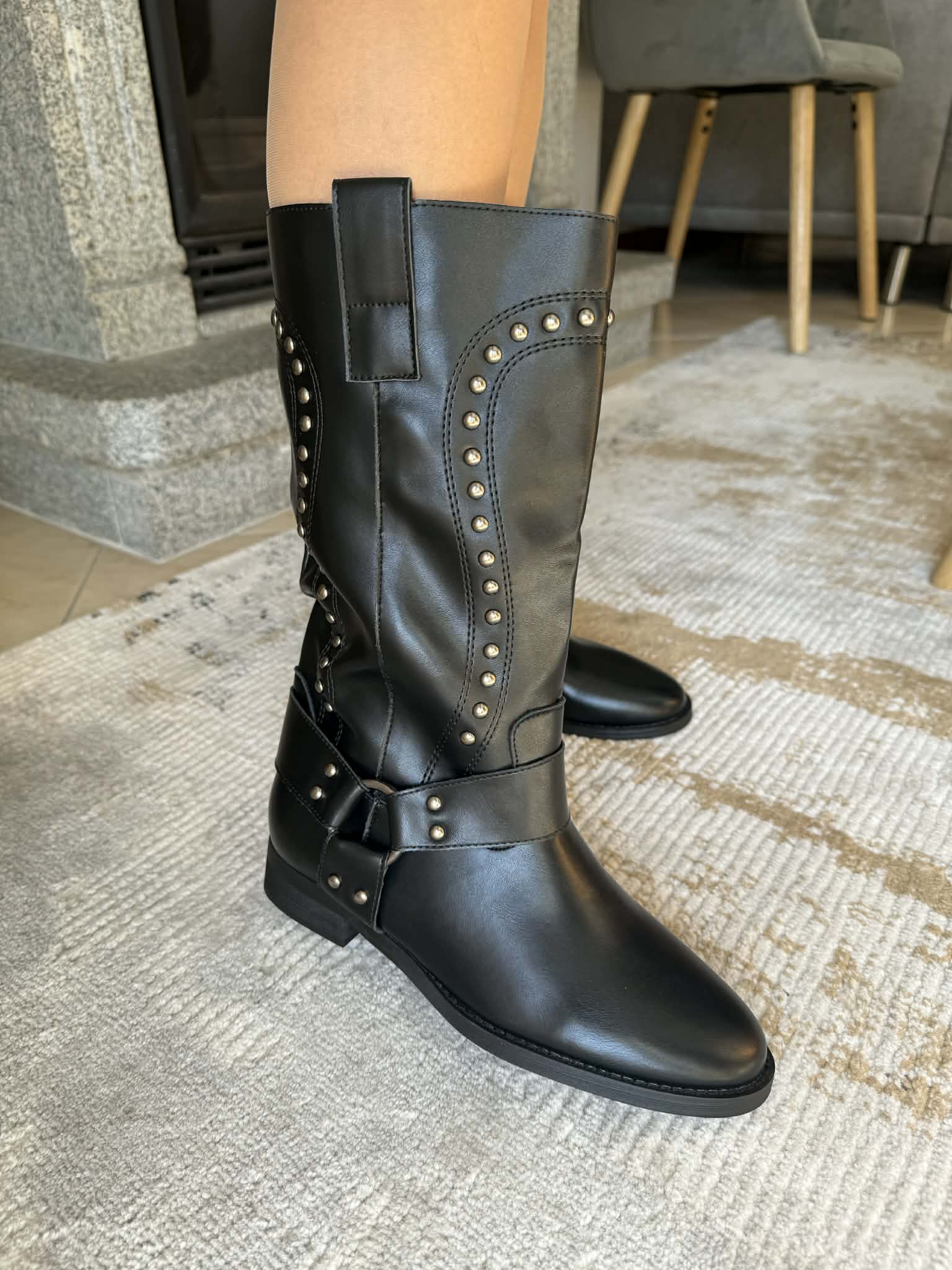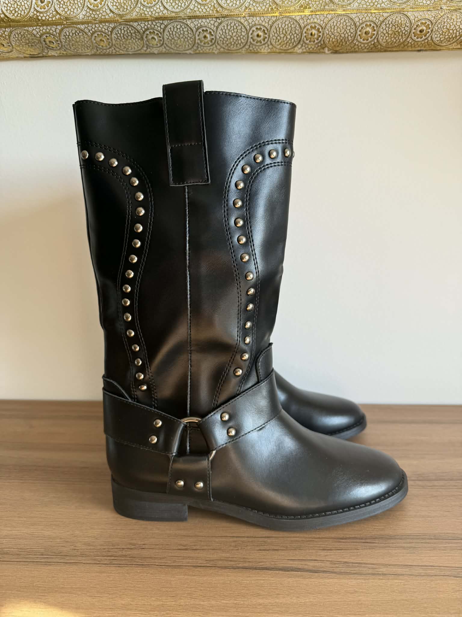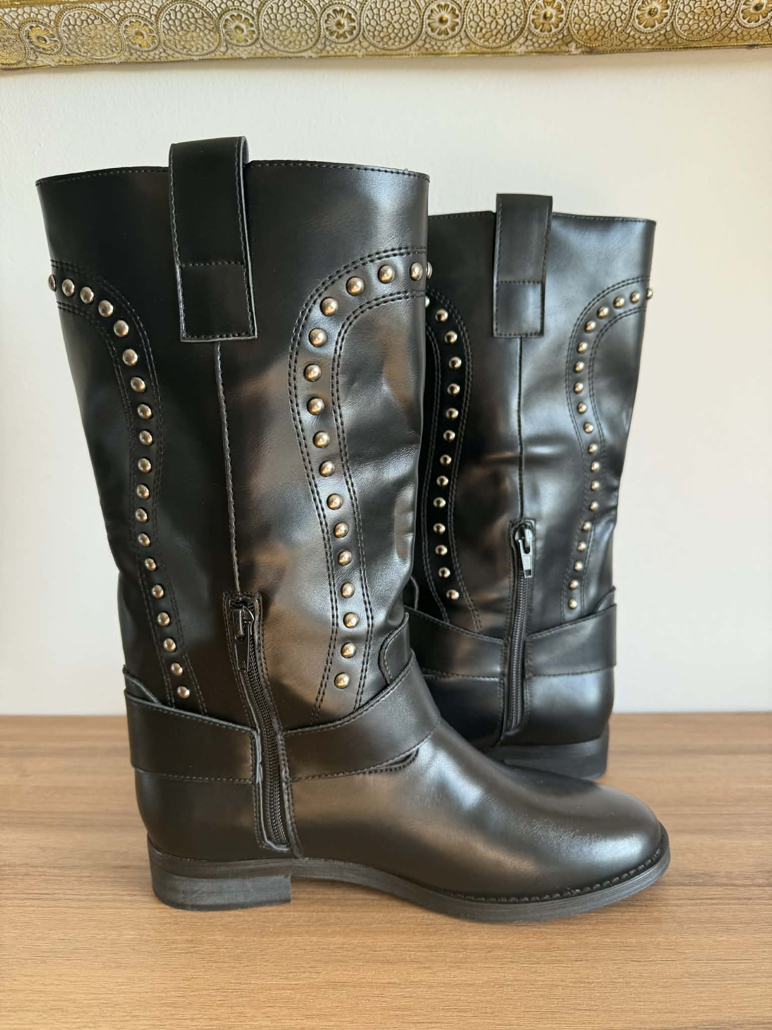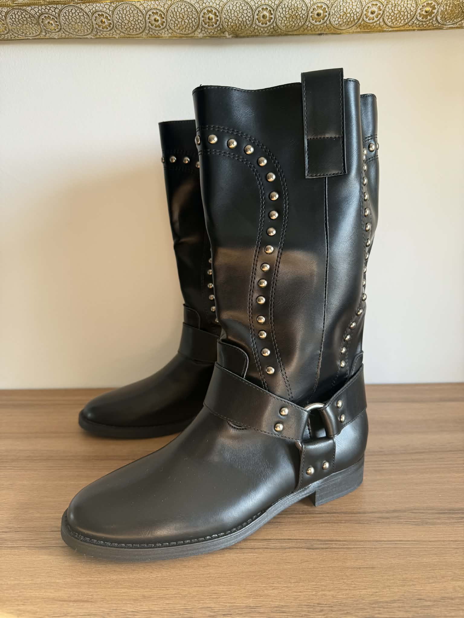 Bota de cano alto, estilo biker, da marca Corina. Em pele sintética fléxivel e macia. Com tachas decorativas. Tem fecho. Interior em tecido muito macio. Sola rasa.