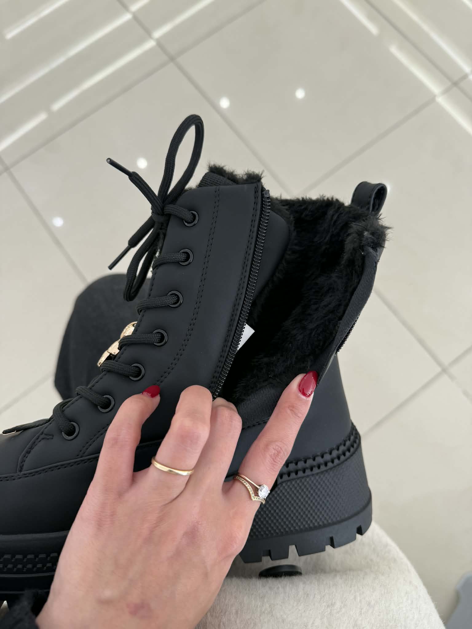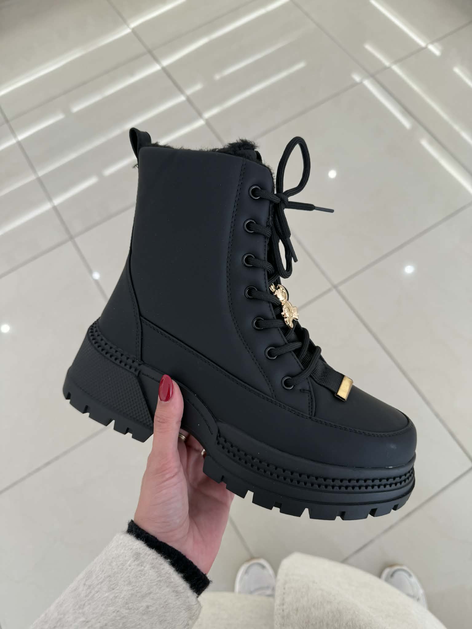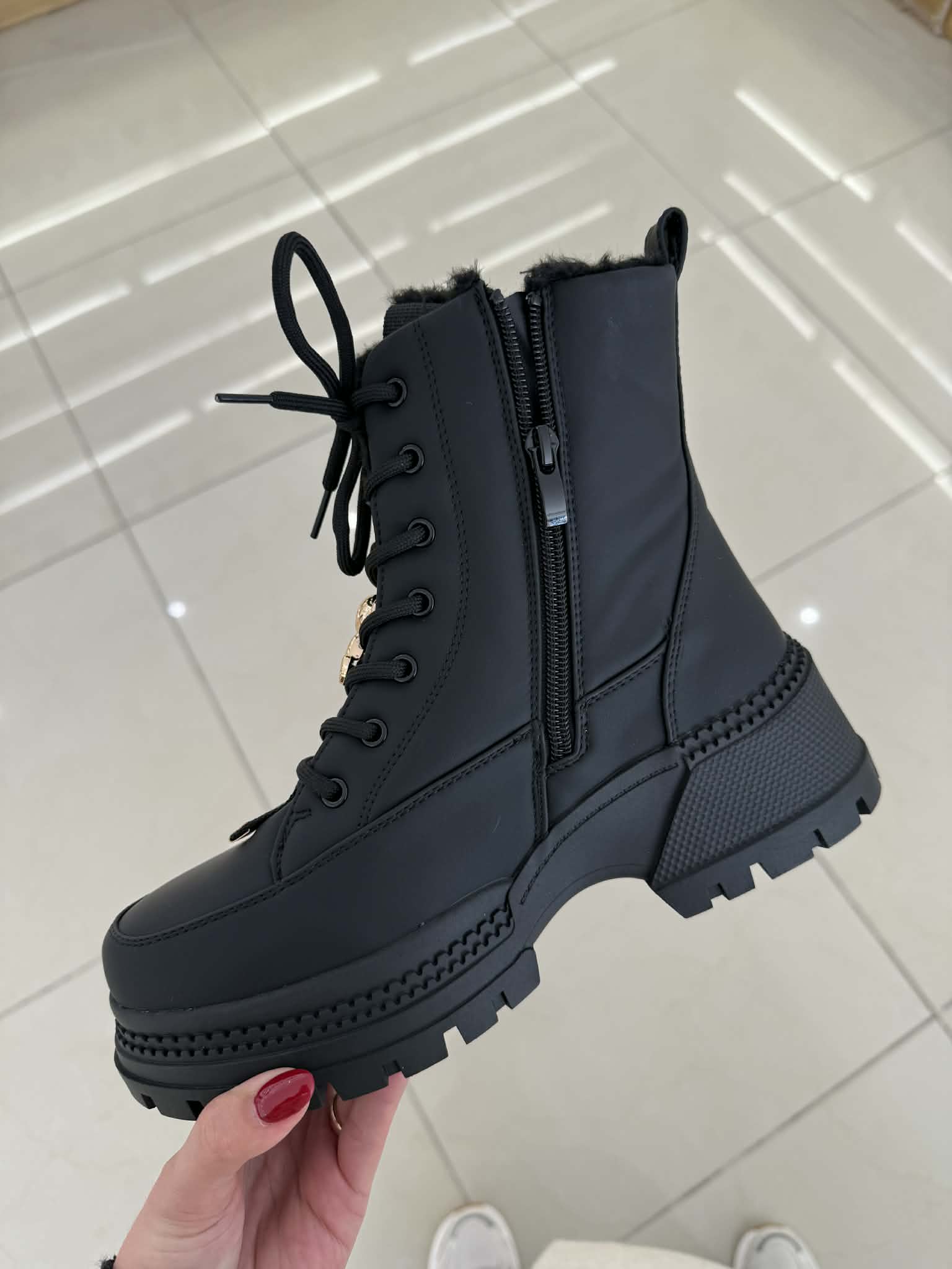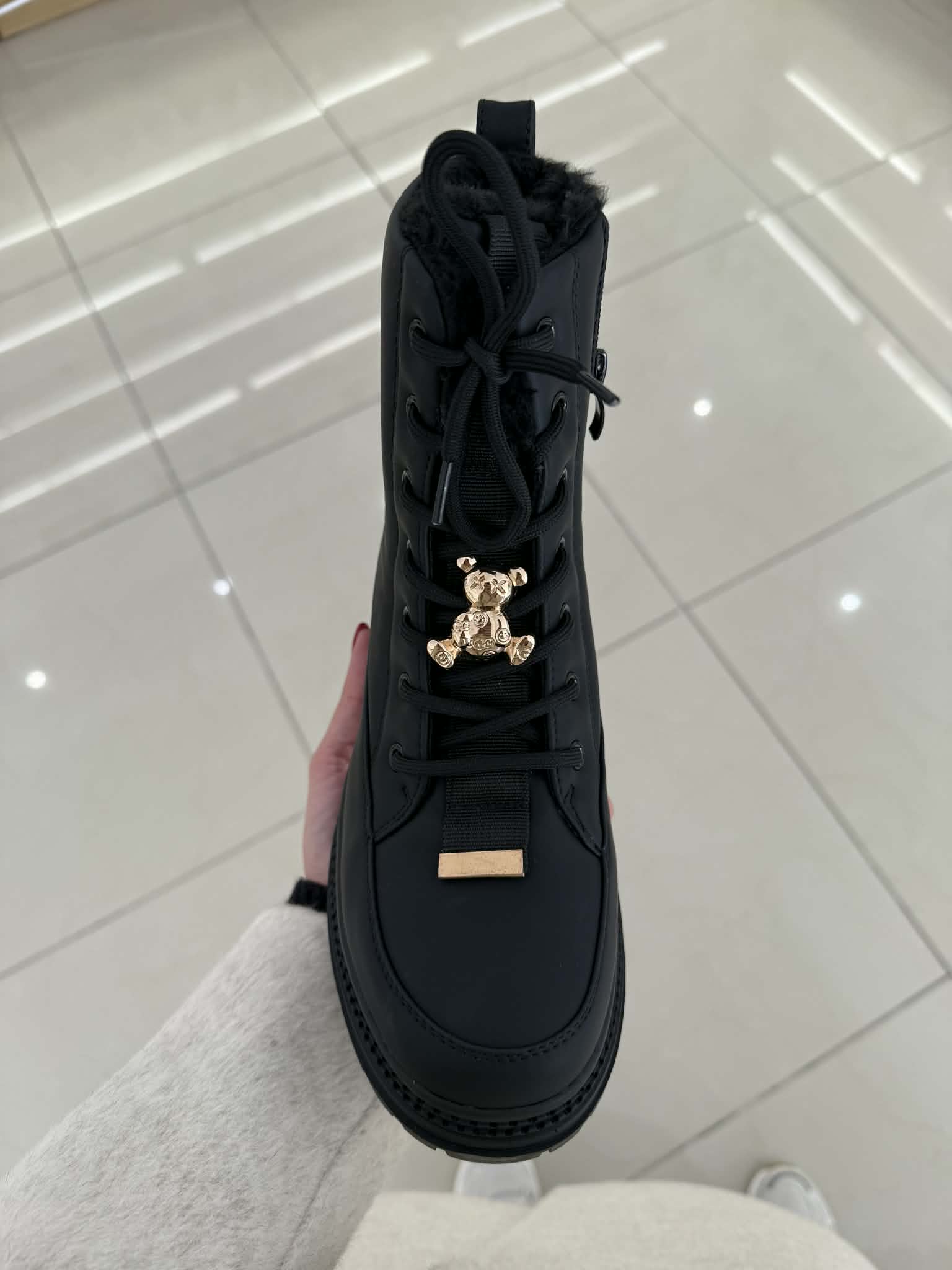 Bota em pele sintética, estilo militar, forrada a pelo. Com fecho e atacador. Detalhe de ursinho decorativo.