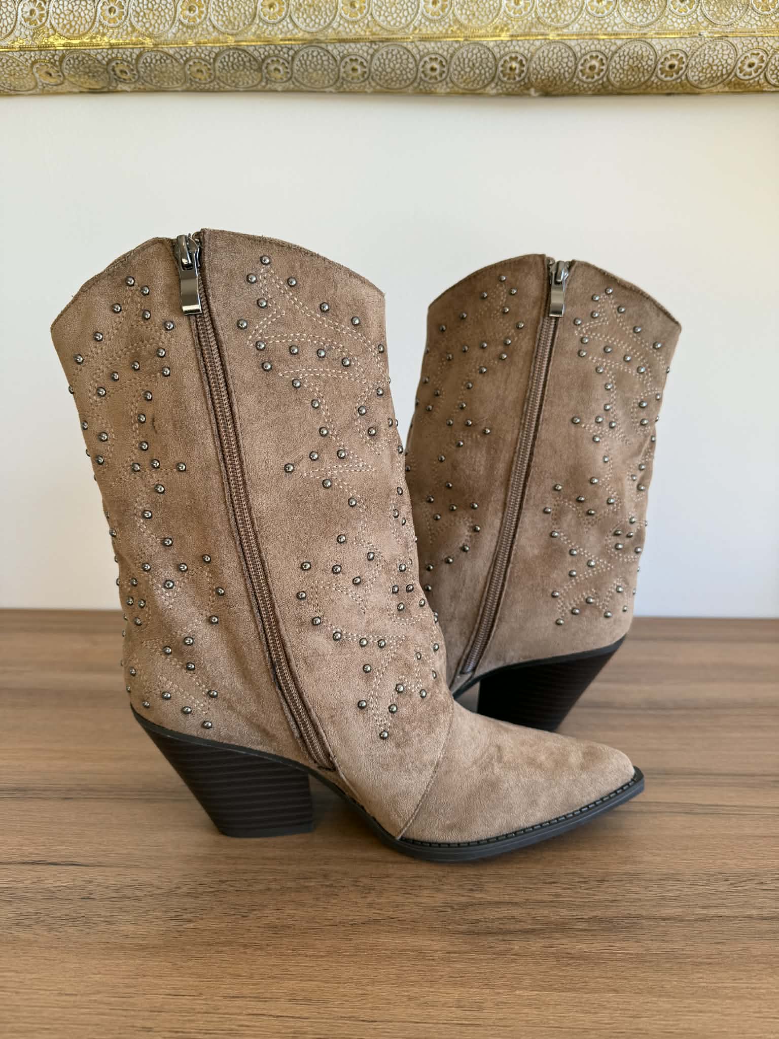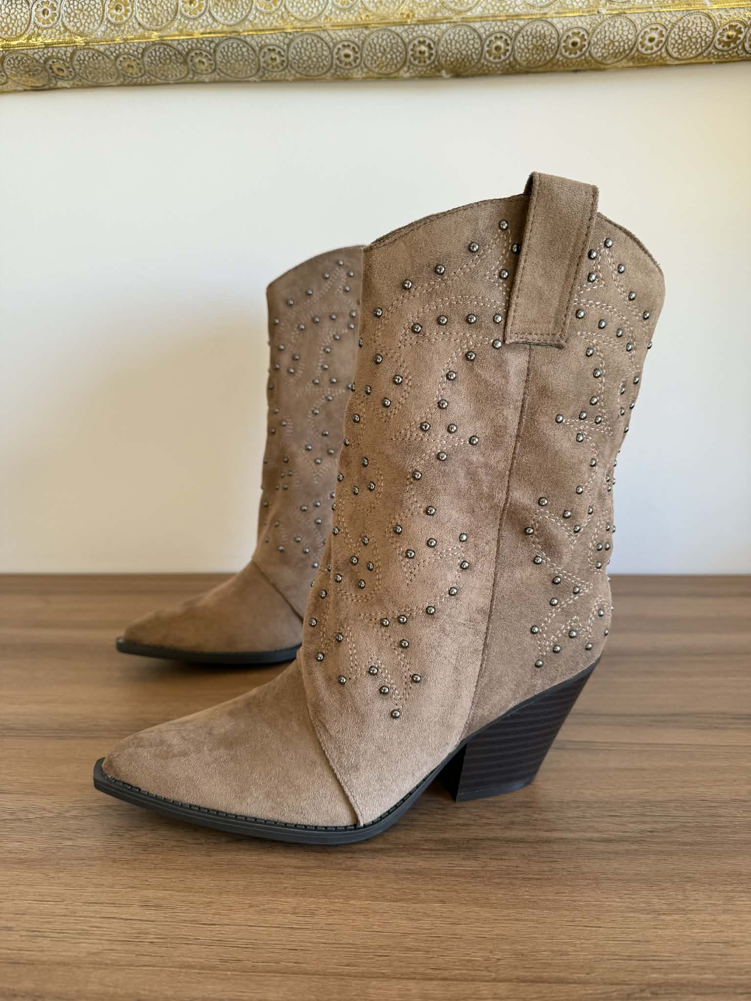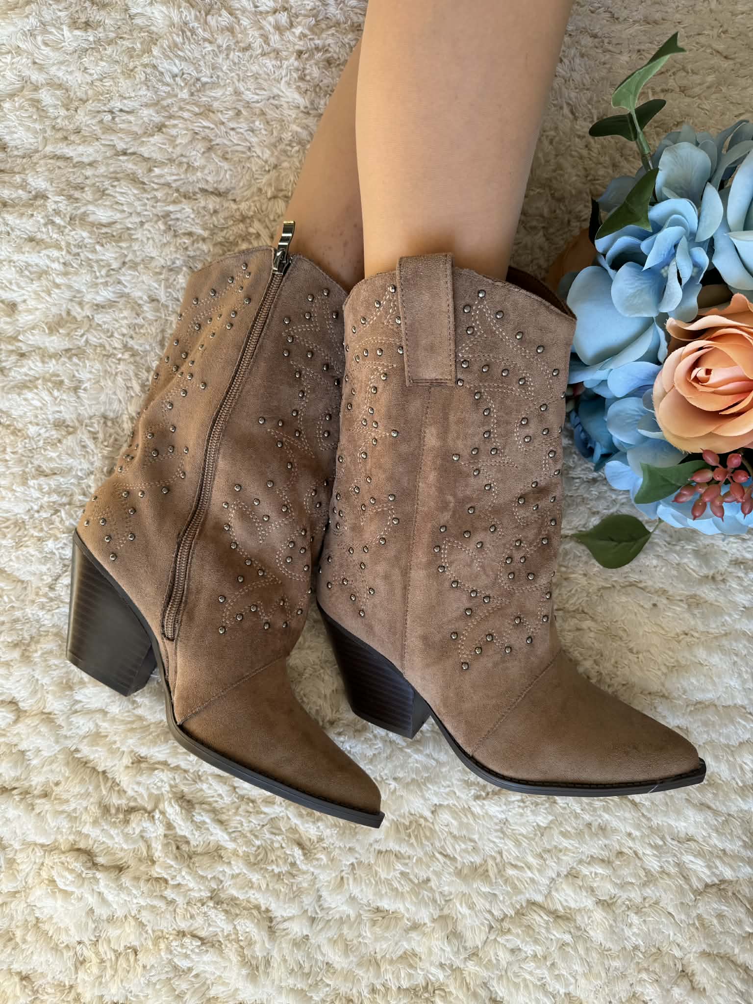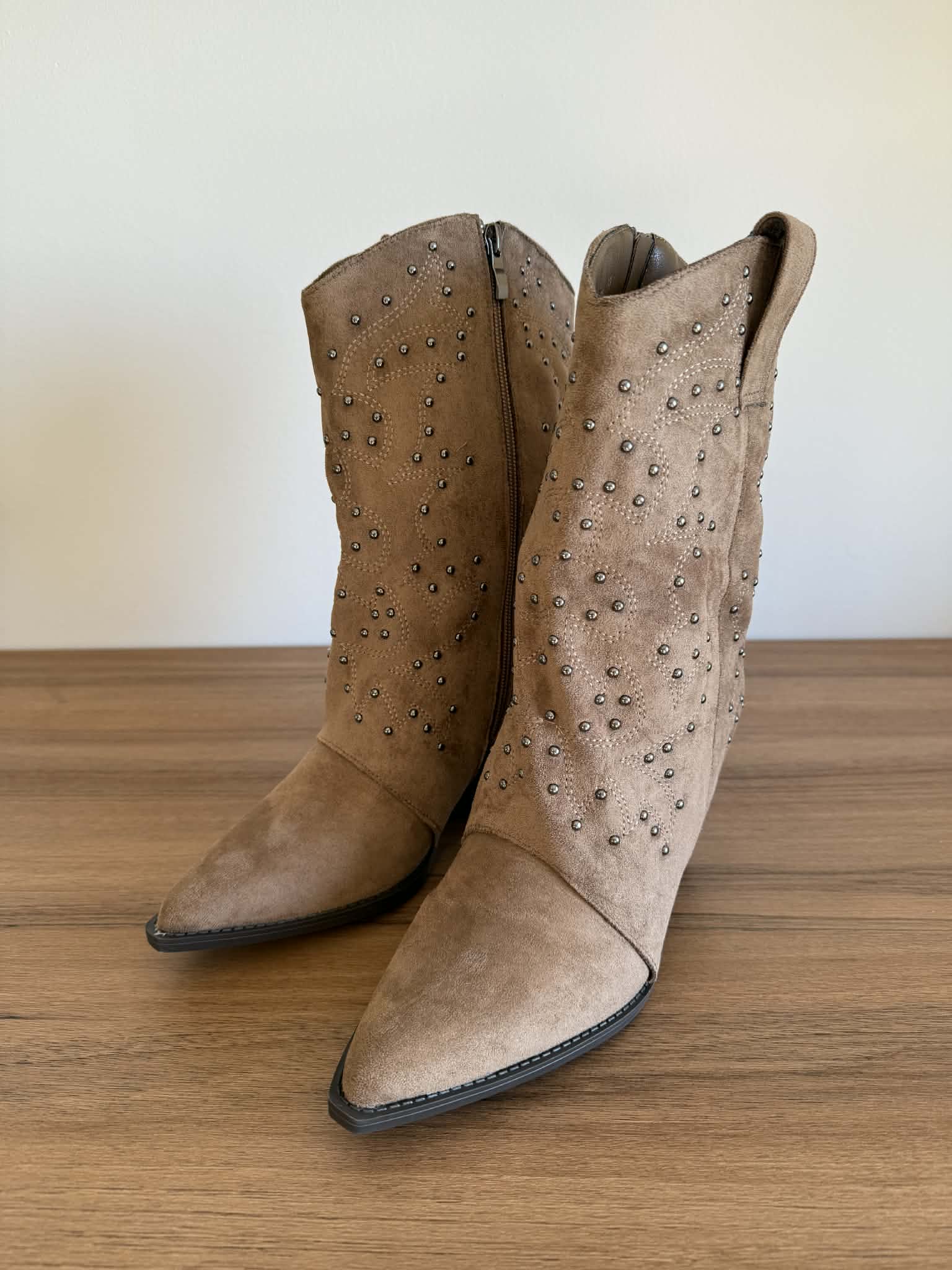 Bota em design moderno, muito tendência. Em camurça sintética. Com tachas decorativas. tem fecho. Salto bloco com 8cm de altura. Frente bicuda.