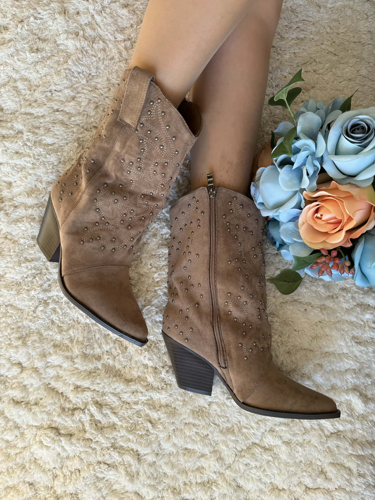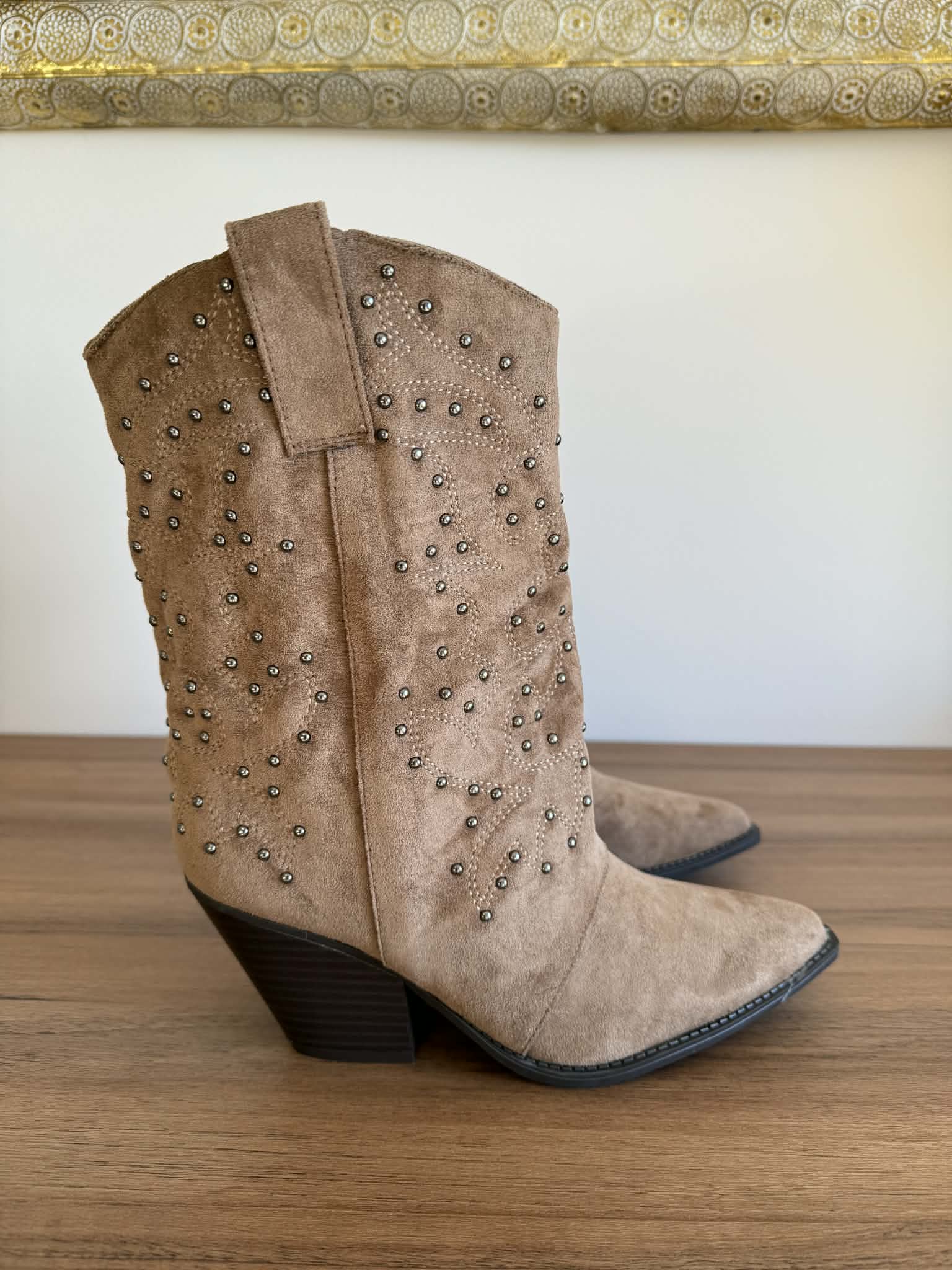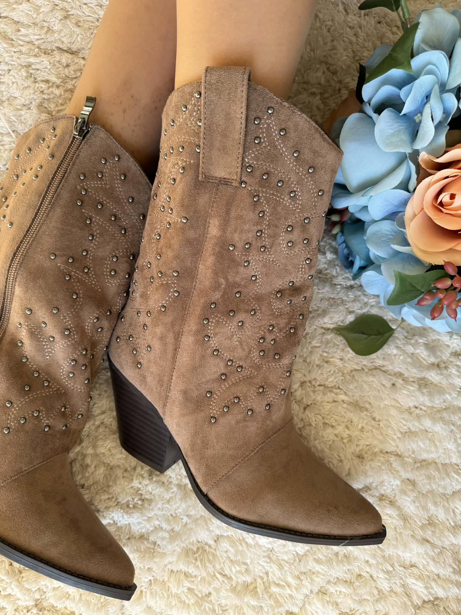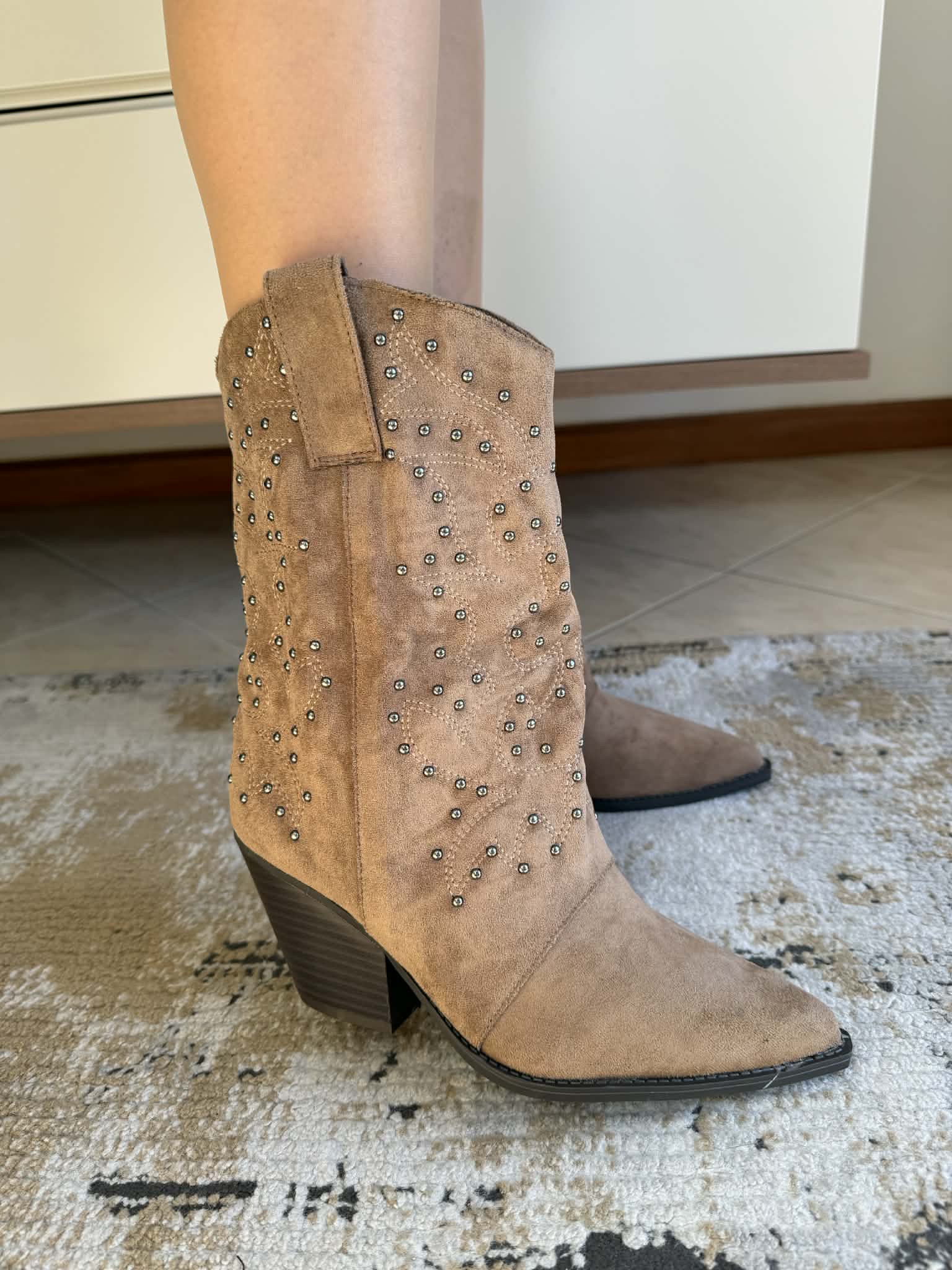 Bota em design moderno, muito tendência. Em camurça sintética. Com tachas decorativas. tem fecho. Salto bloco com 8cm de altura. Frente bicuda.