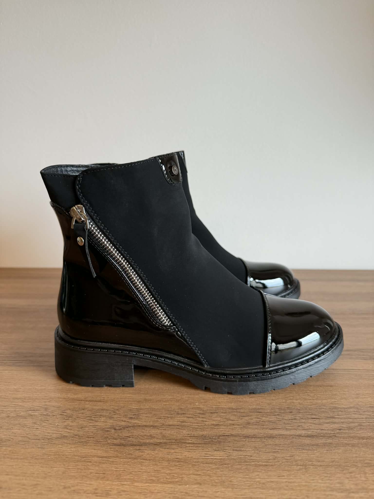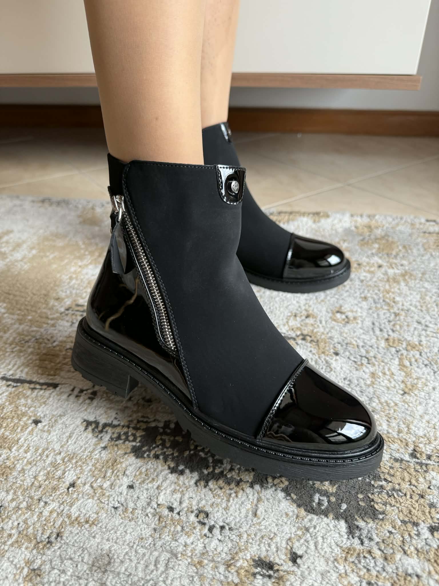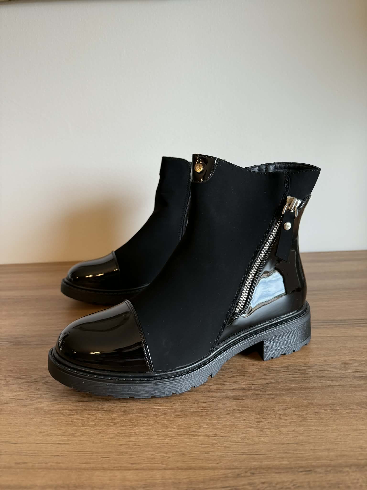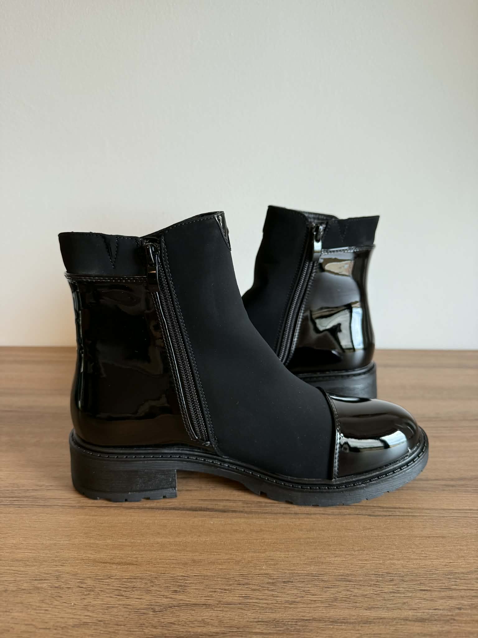 Esta bota preta combina estilo moderno com máximo conforto. O interior é totalmente forrado a pelo, garantindo um toque macio e aconchegante para os dias mais frios. Conta com um fecho lateral funcional que facilita o calçar, acompanhado por um segundo fecho decorativo que acrescenta um detalhe elegante e contemporâneo ao design. A mistura de acabamento liso com apontamentos em verniz dá-lhe um visual sofisticado e versátil, perfeito para complementar looks casuais ou mais urbanos.