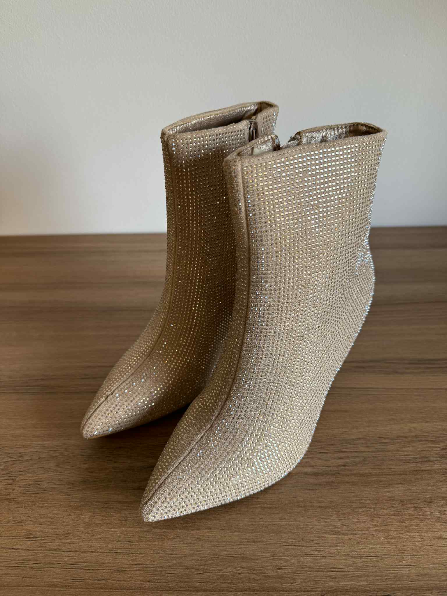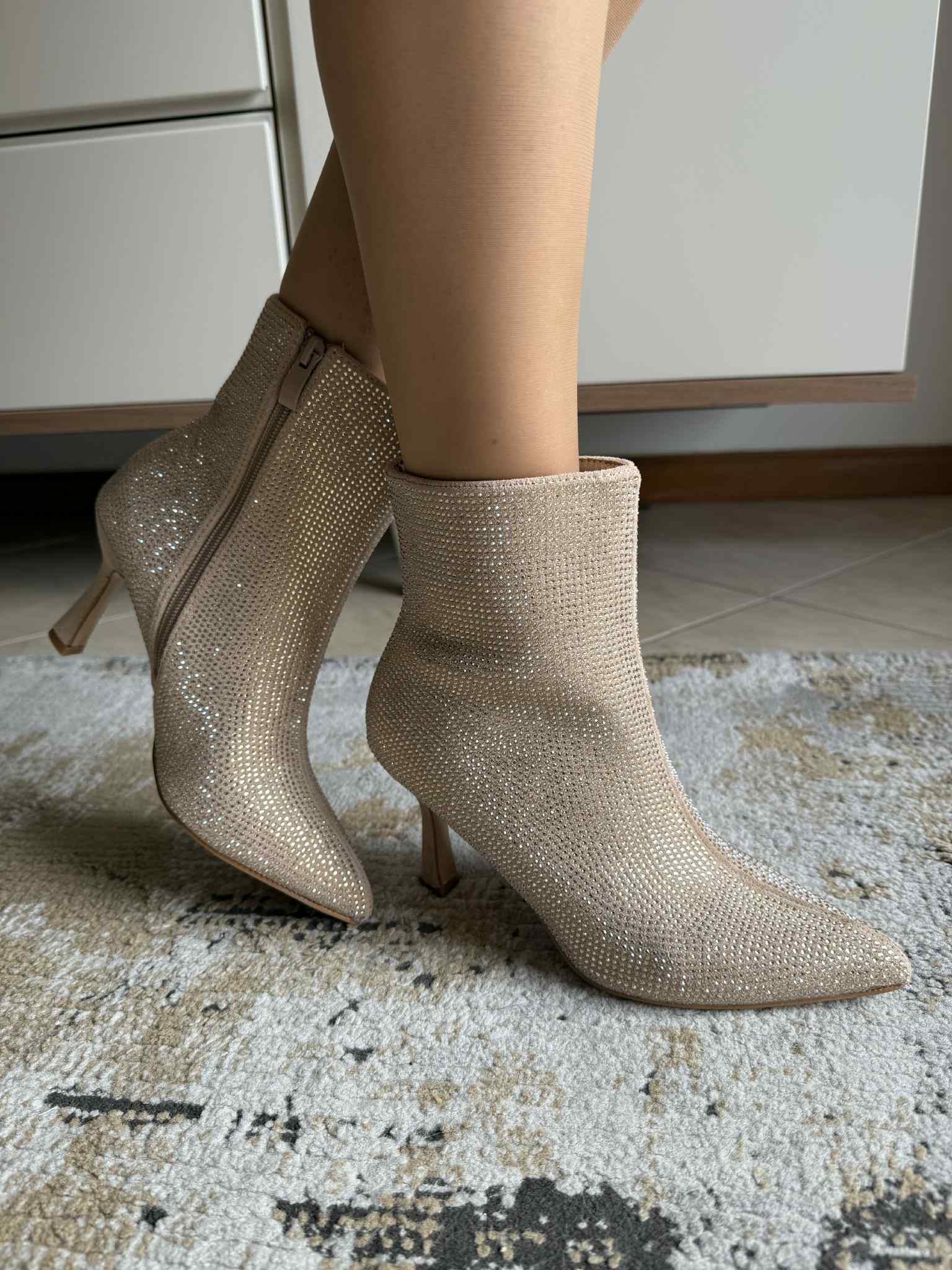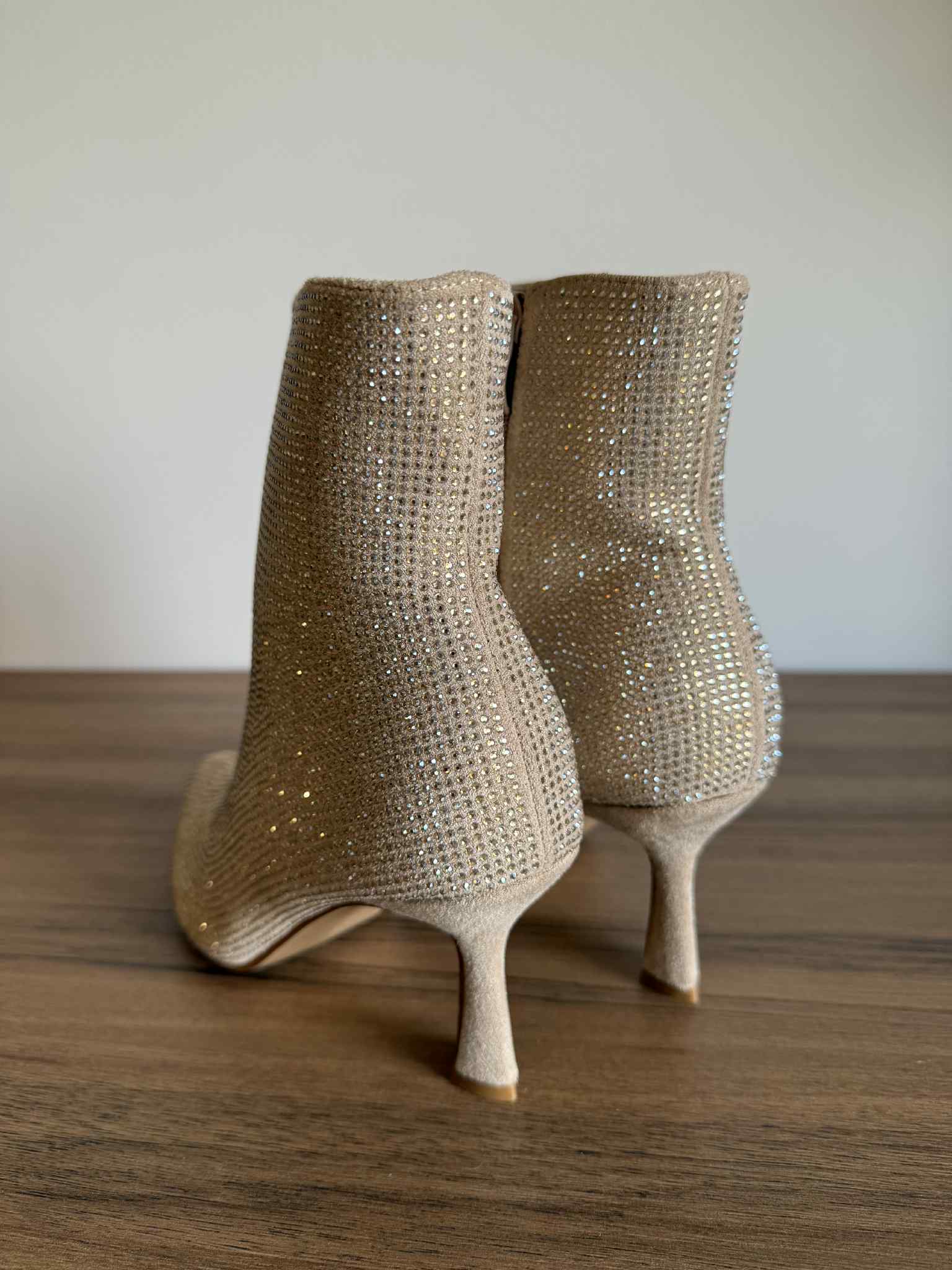 Botim feminino, em camurça sintética, todo coberto com brilhantes.