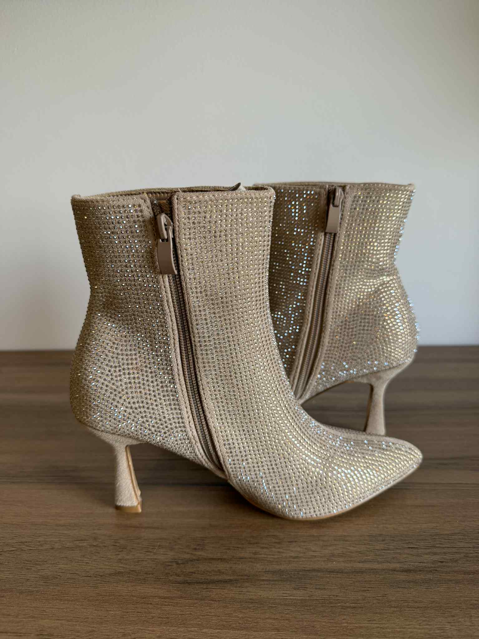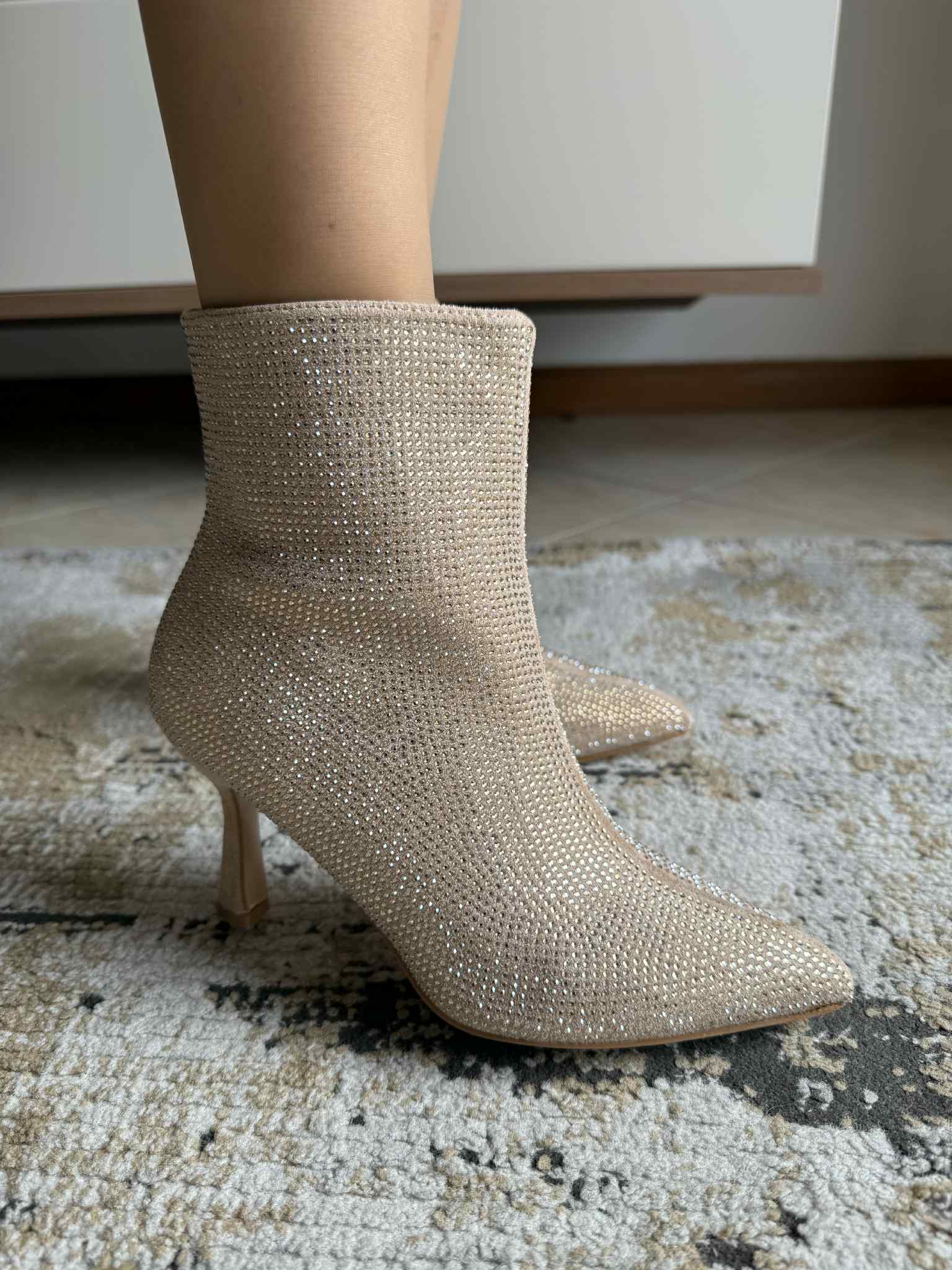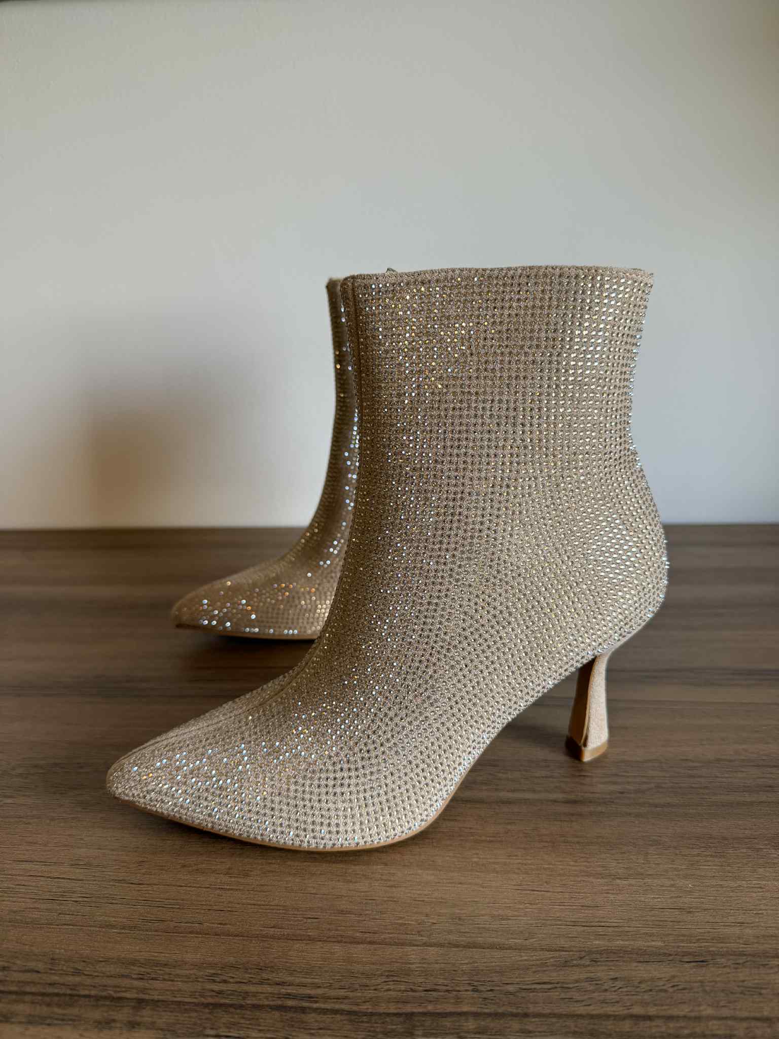 Botim feminino, em camurça sintética, todo coberto com brilhantes.