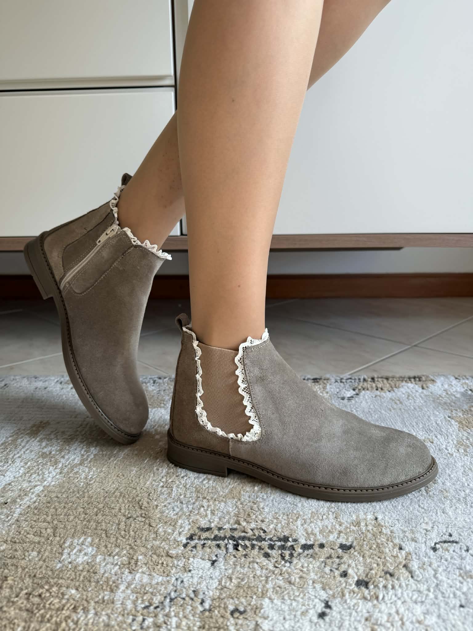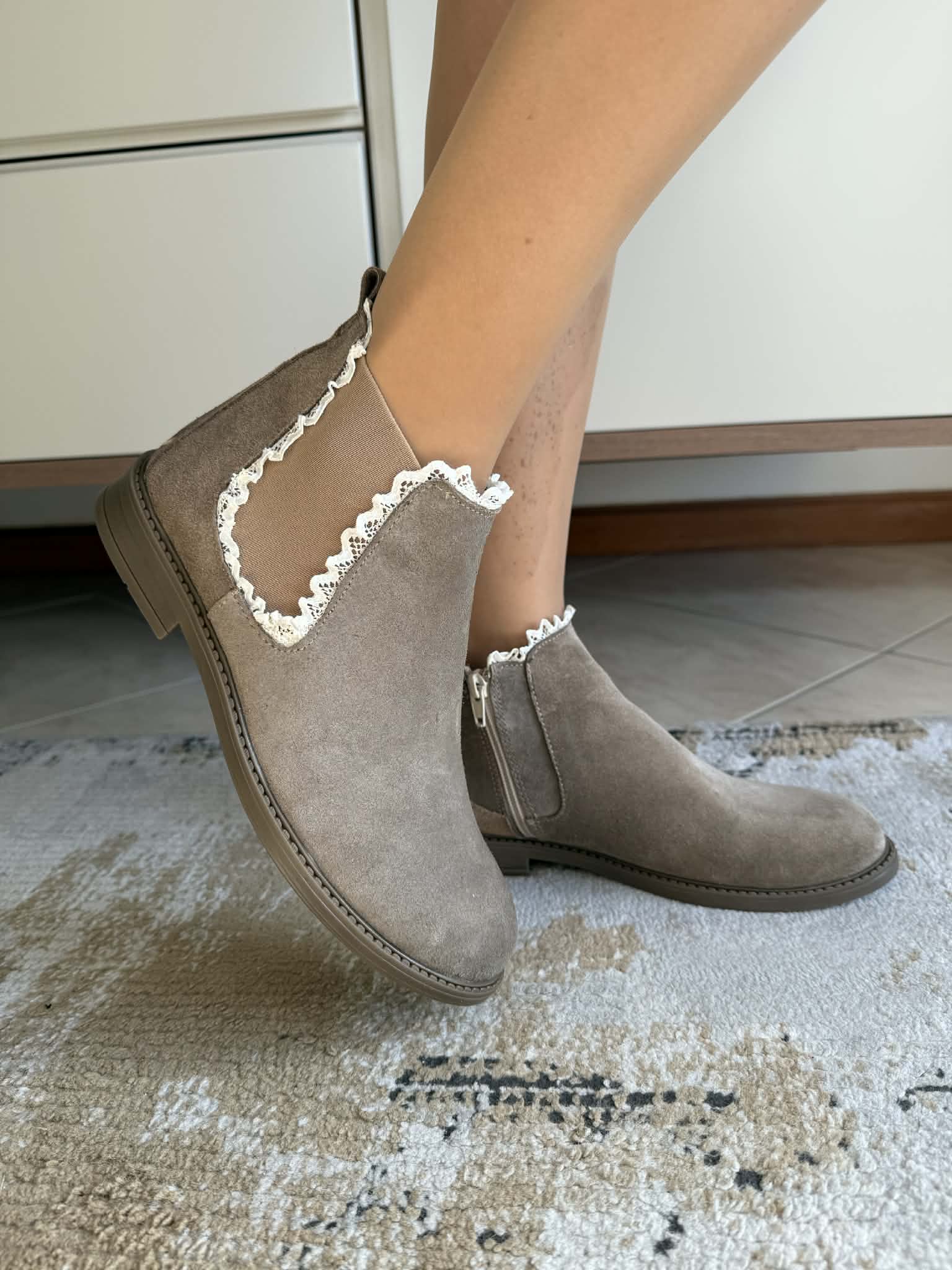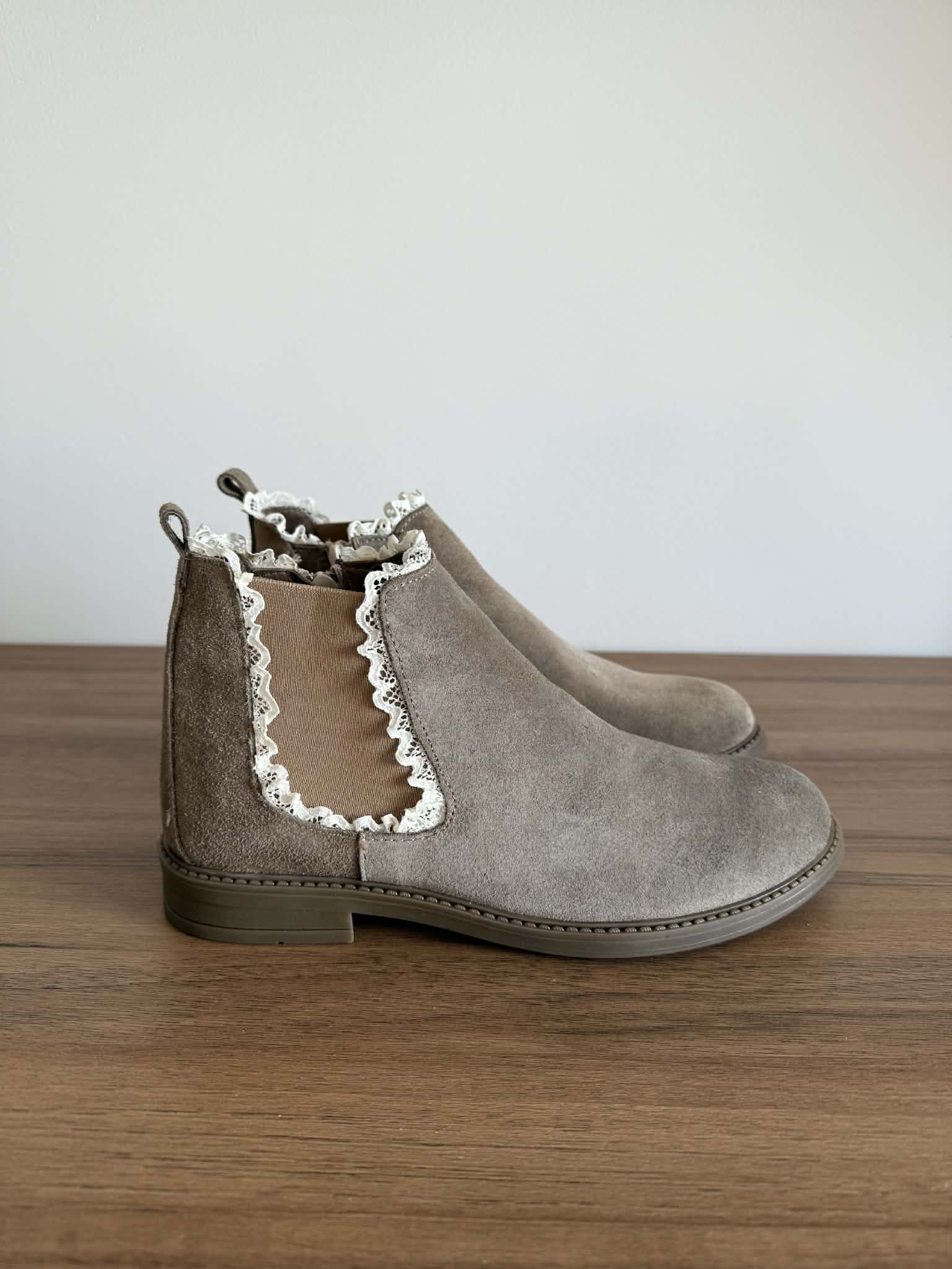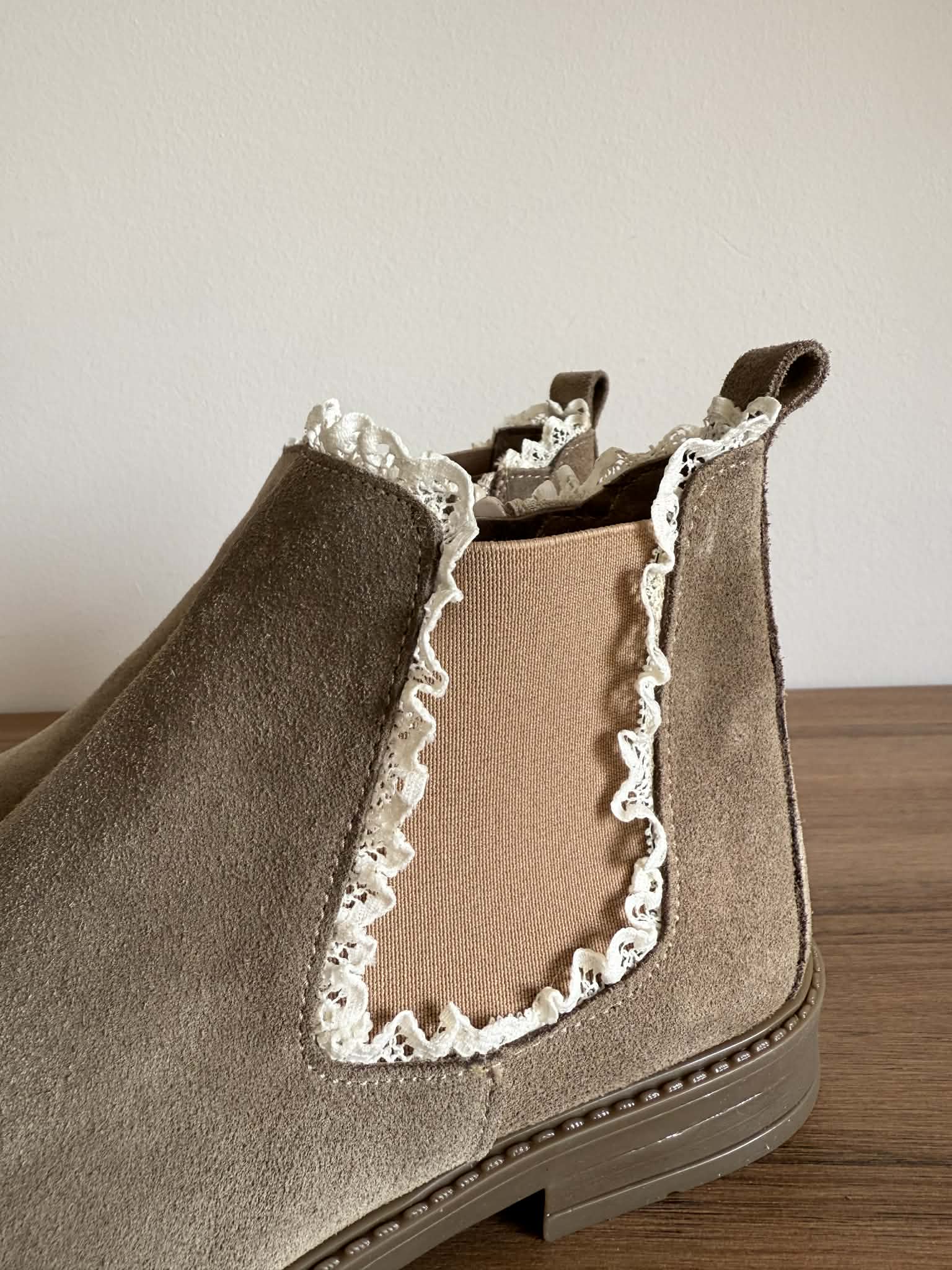 Bota fabricada em portugal, em camurça genuína. Com fecho e elástico. Detalhe de rendinha decorativa.