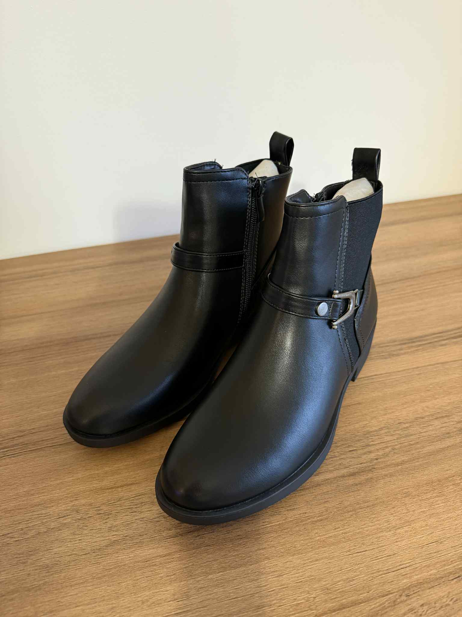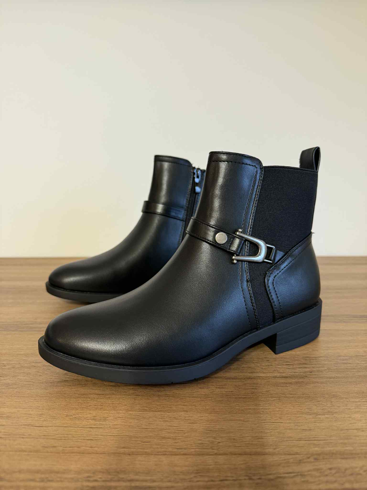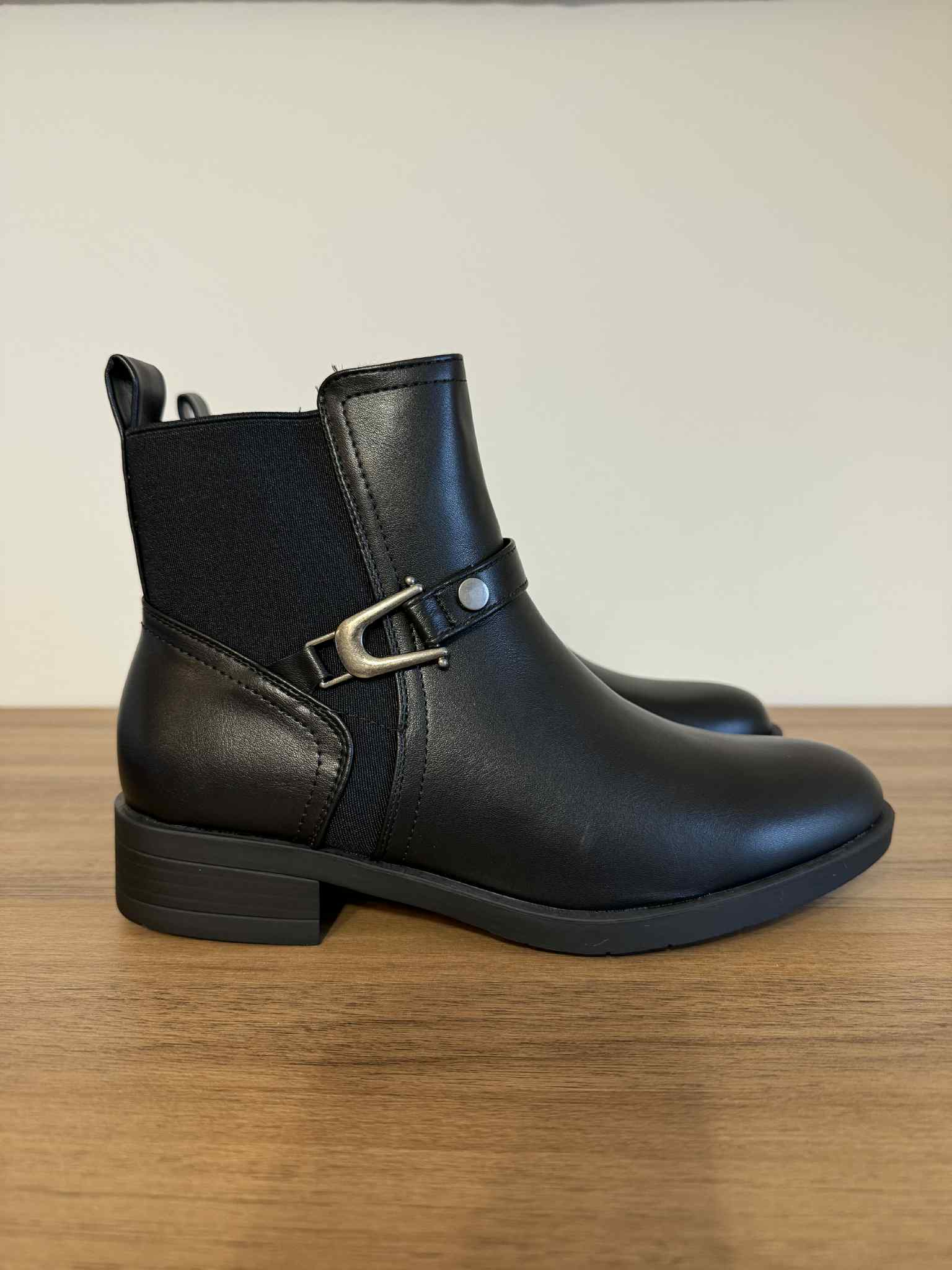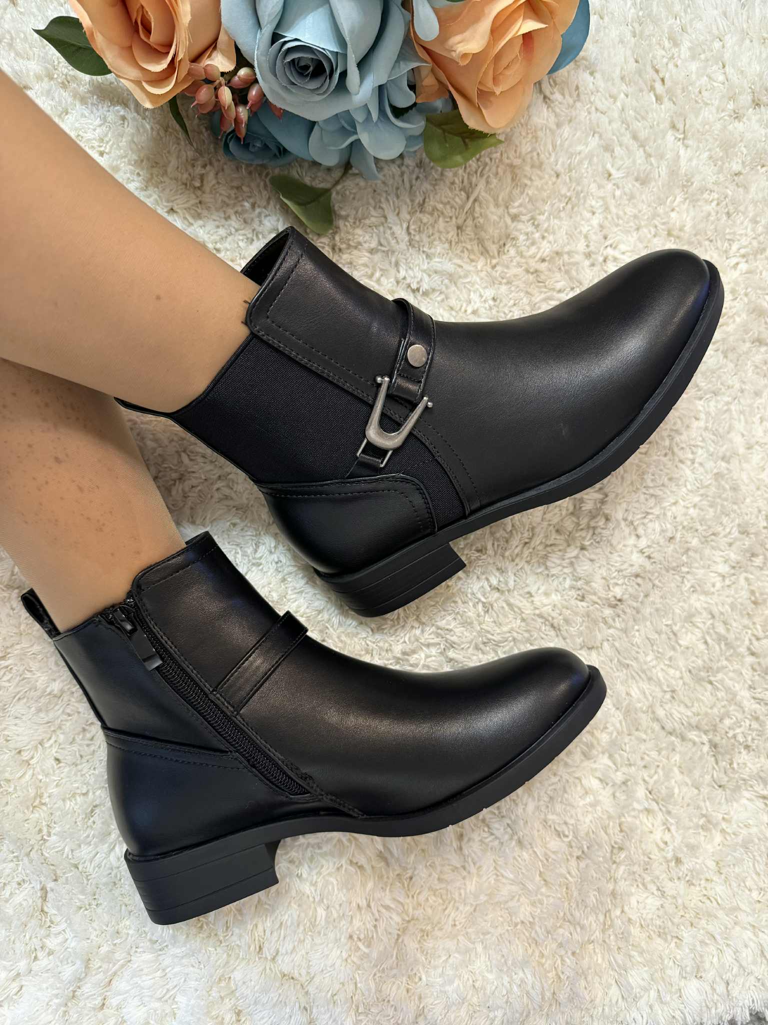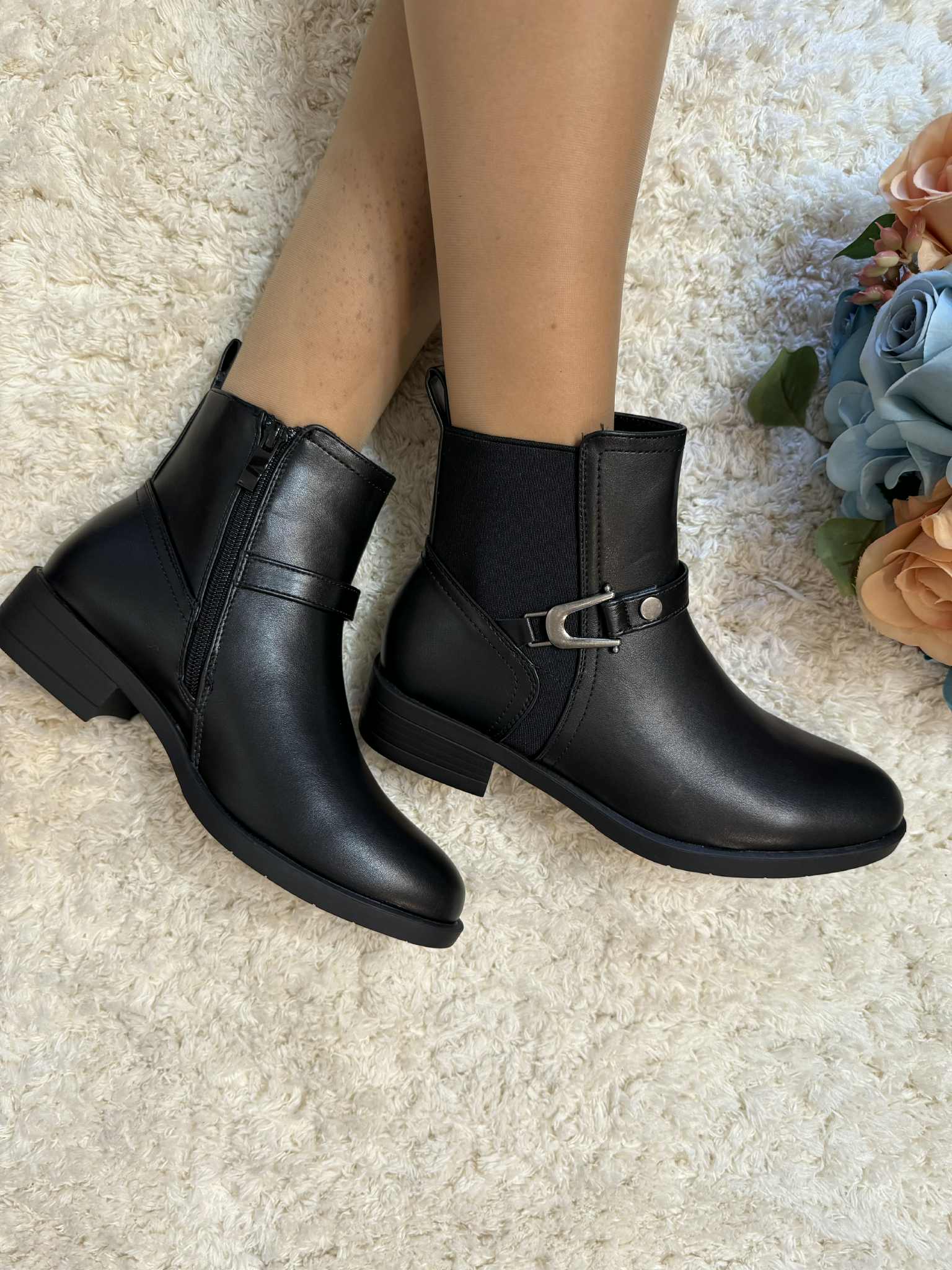 Botim com sola baixa, em pele sintética. Tem fecho e elástico. Com aplicação decorativa.