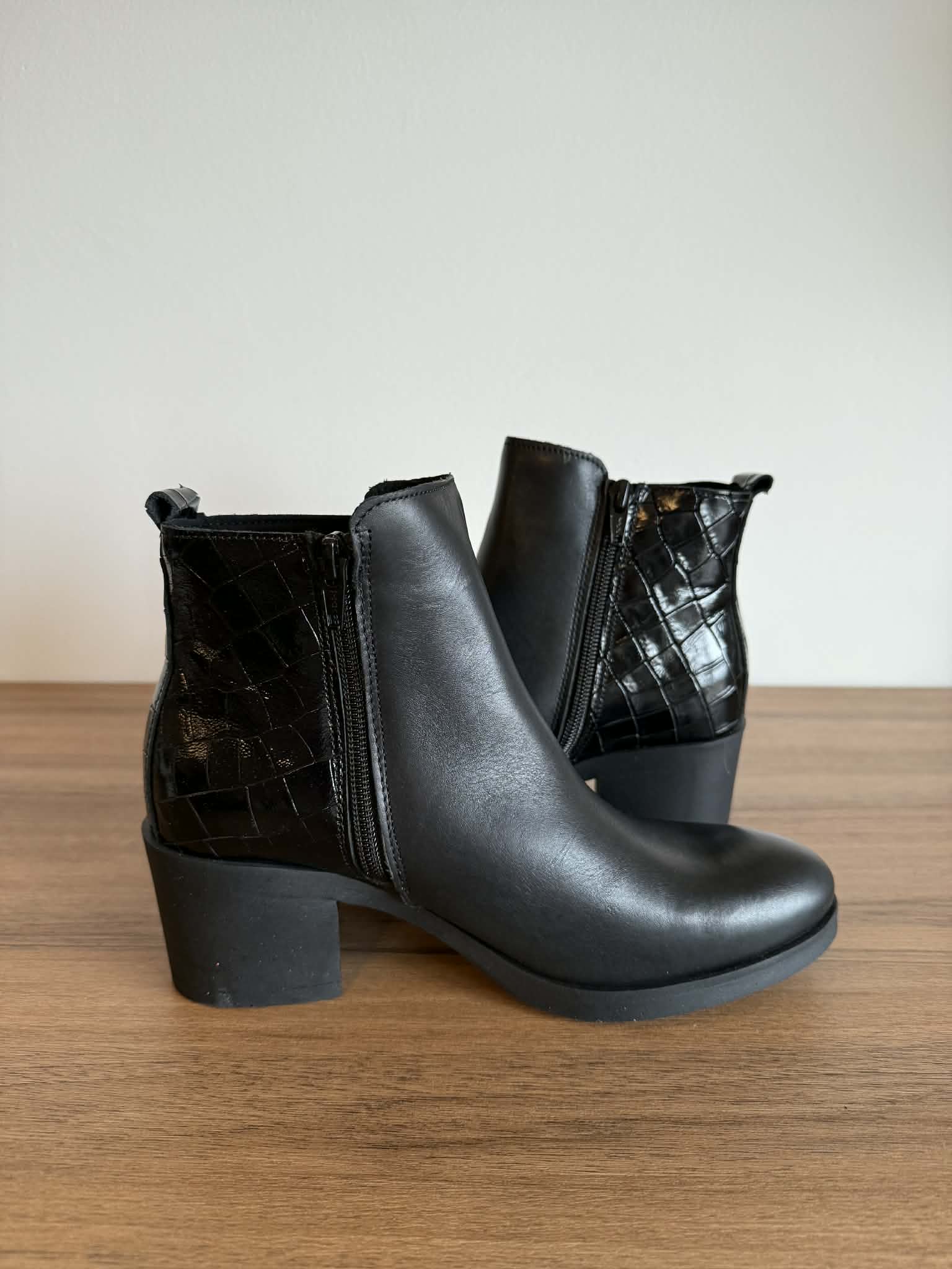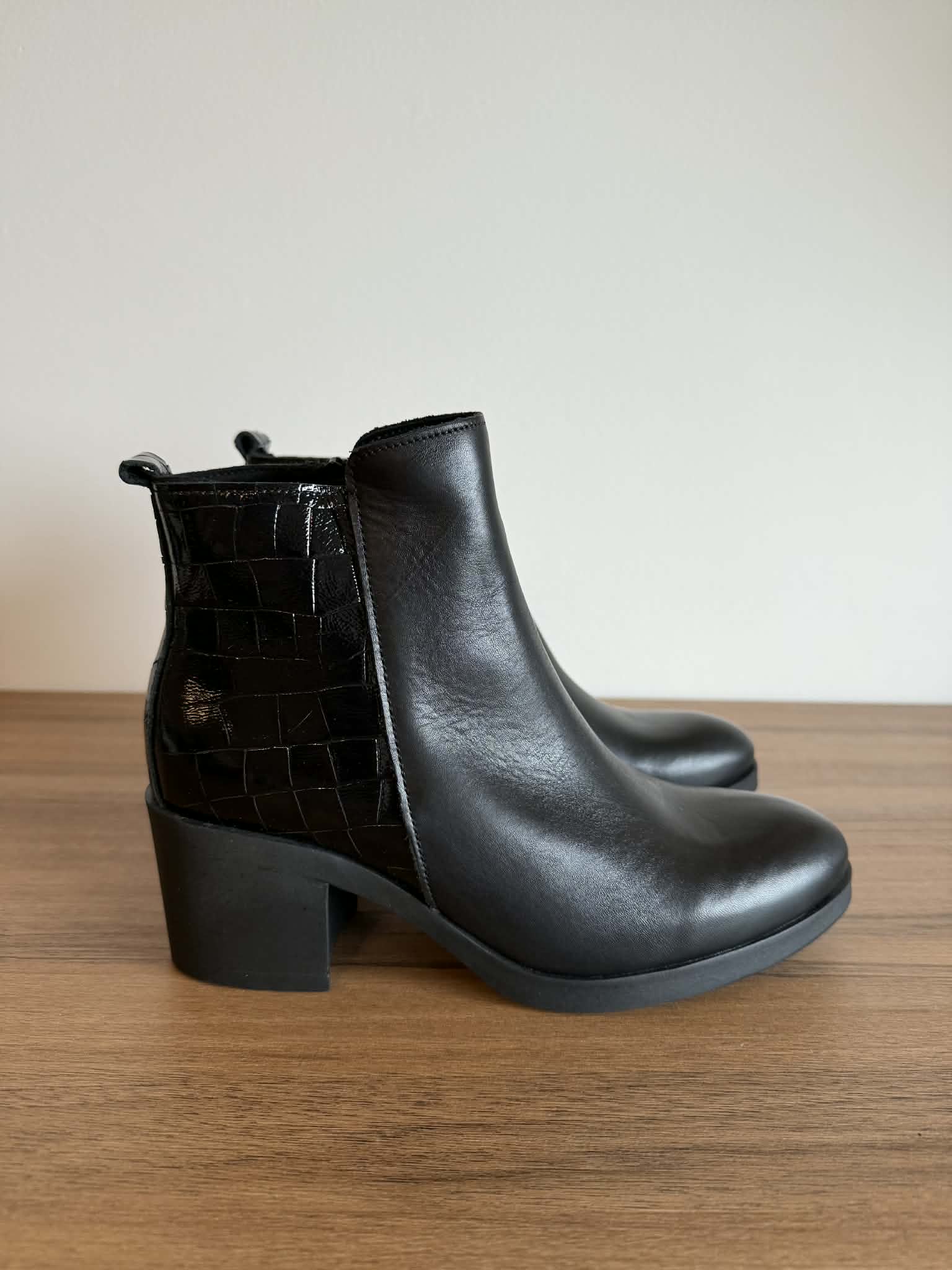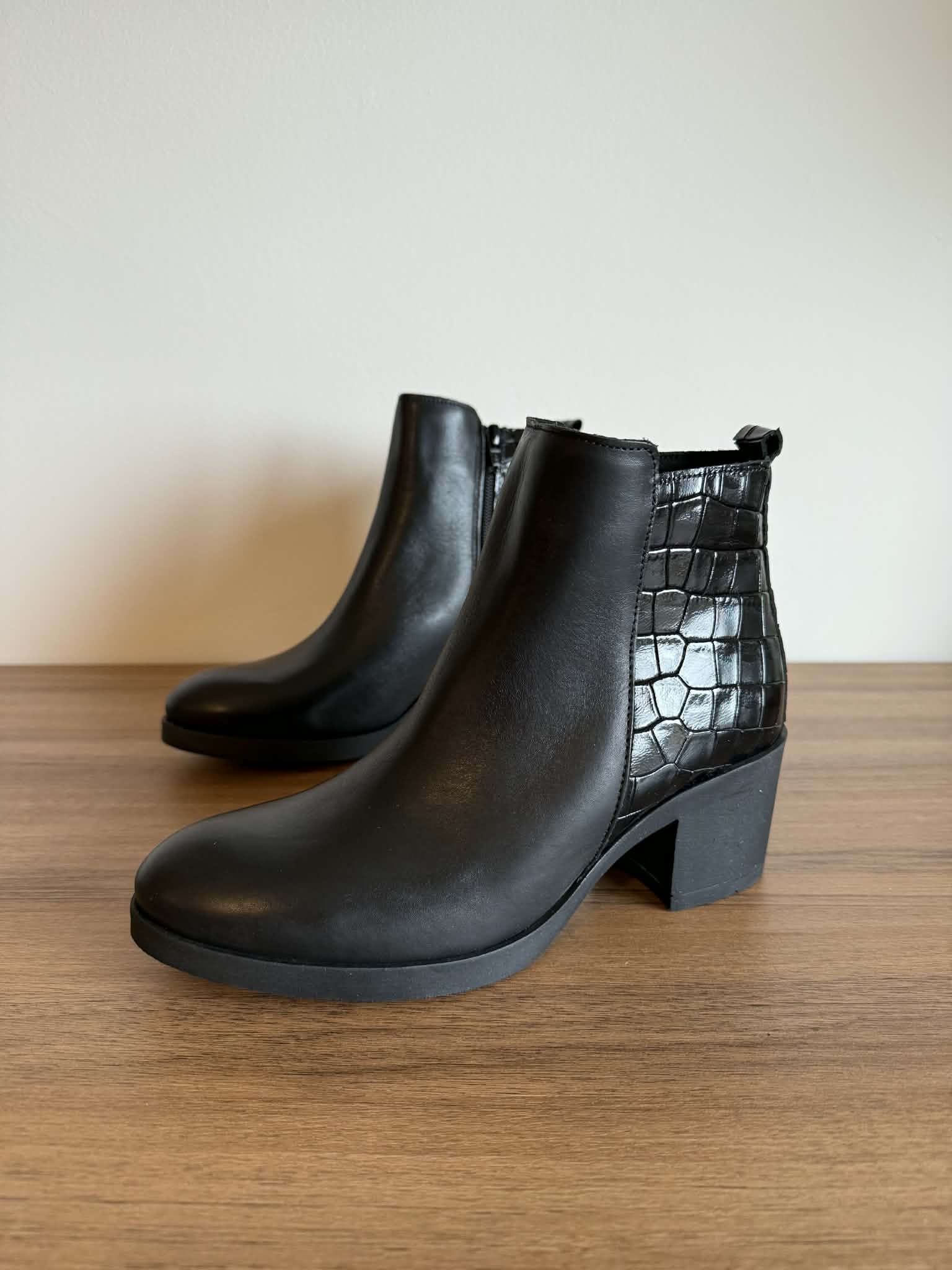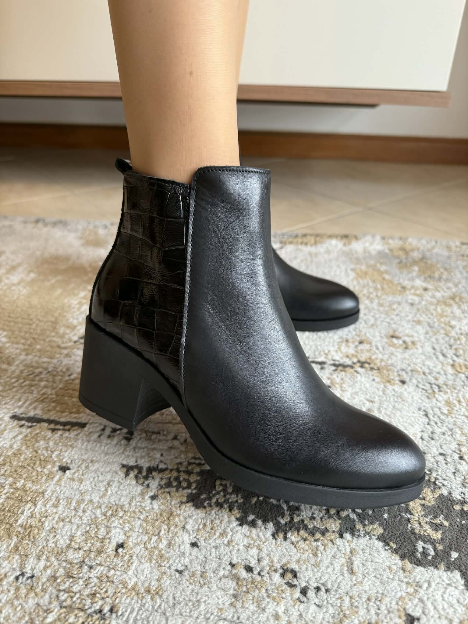 Botim em pele com detalhe croco e tacão
