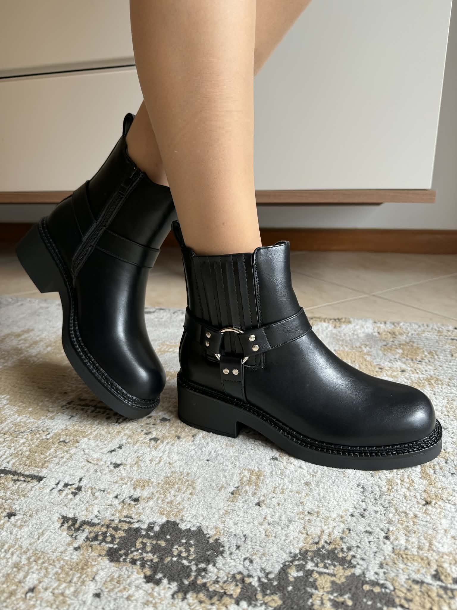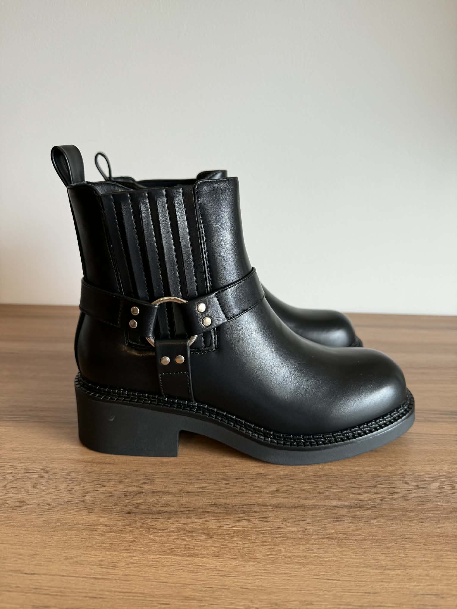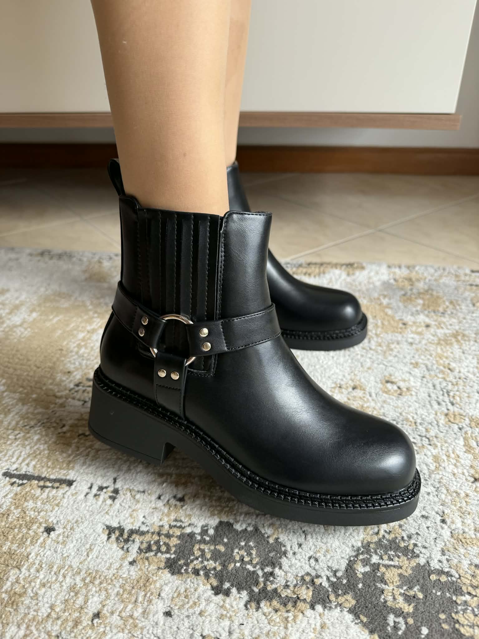 Botim feminino, com cano curto. Em pele sintética. Com detalhe de argola metálica decorativa. Elástico no cano. Sola baixa com cerca de 4.5cm de altura.