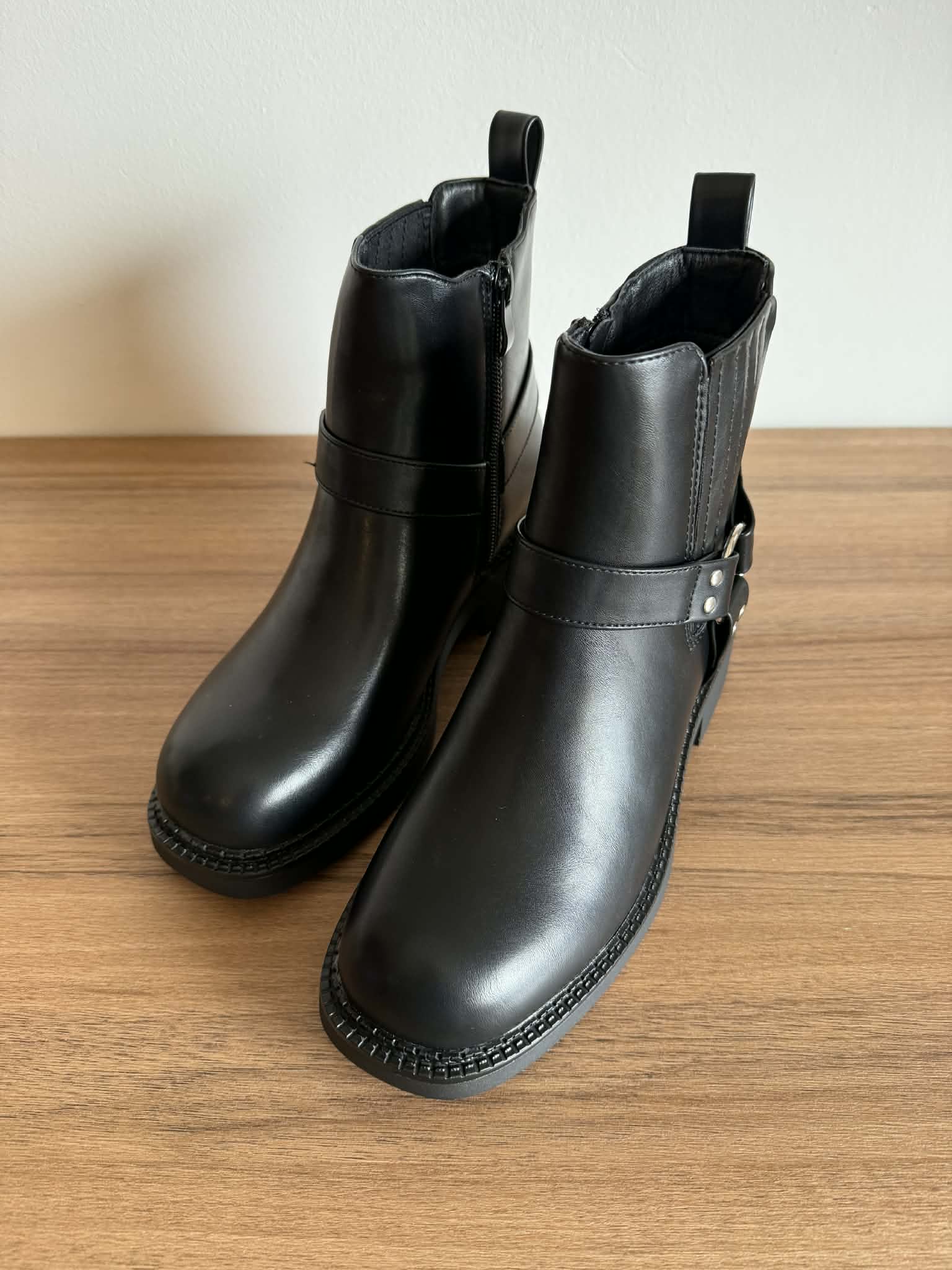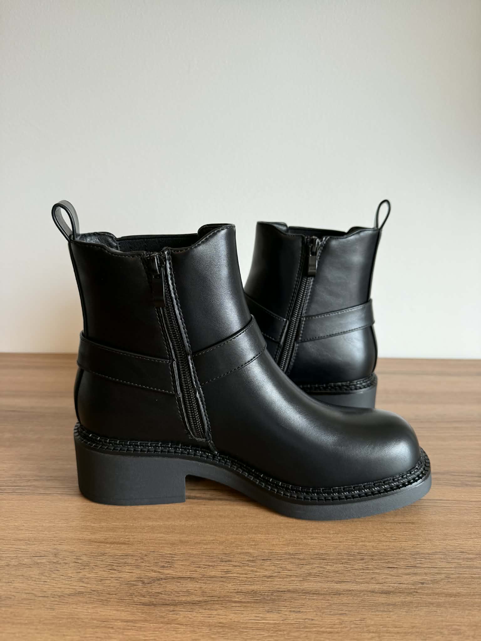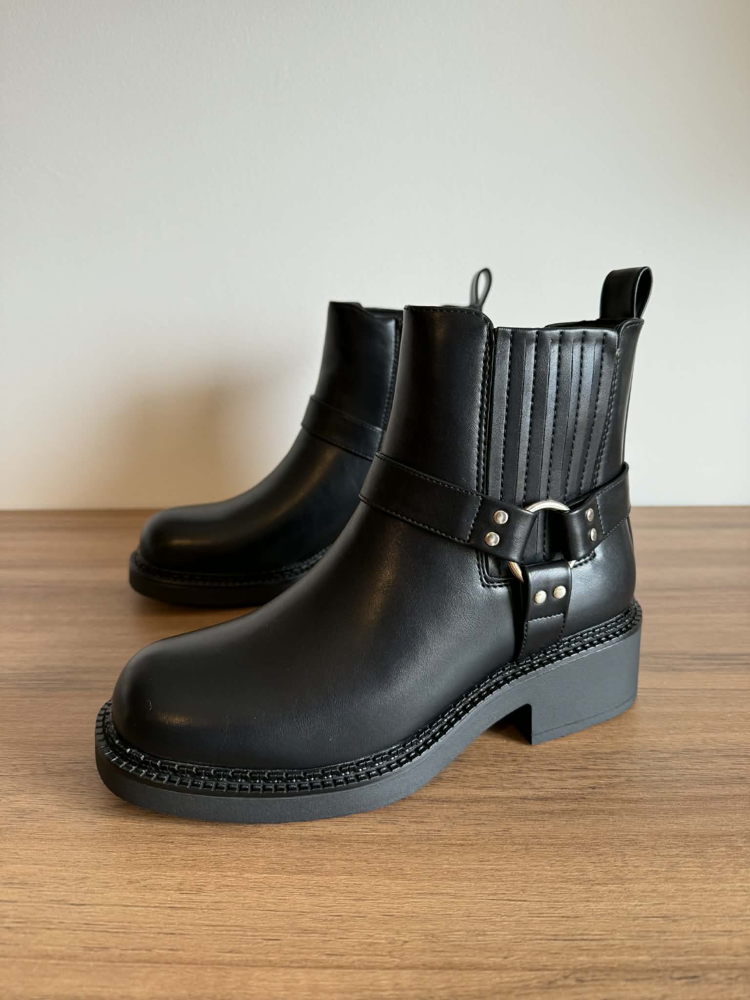 Botim feminino, com cano curto. Em pele sintética. Com detalhe de argola metálica decorativa. Elástico no cano. Sola baixa com cerca de 4.5cm de altura.