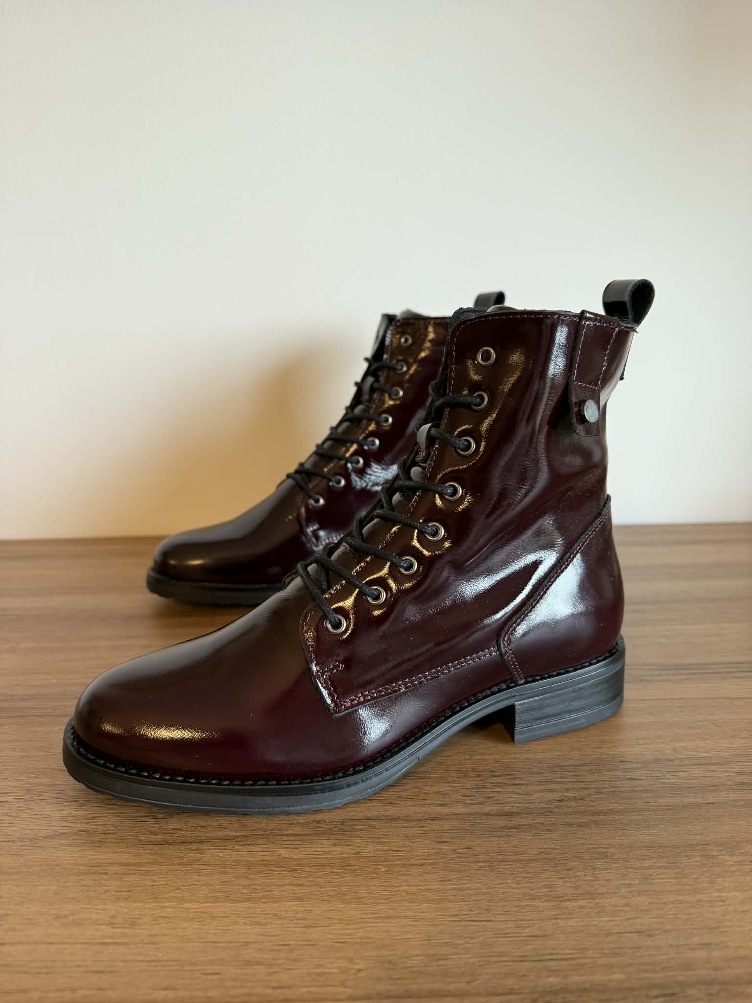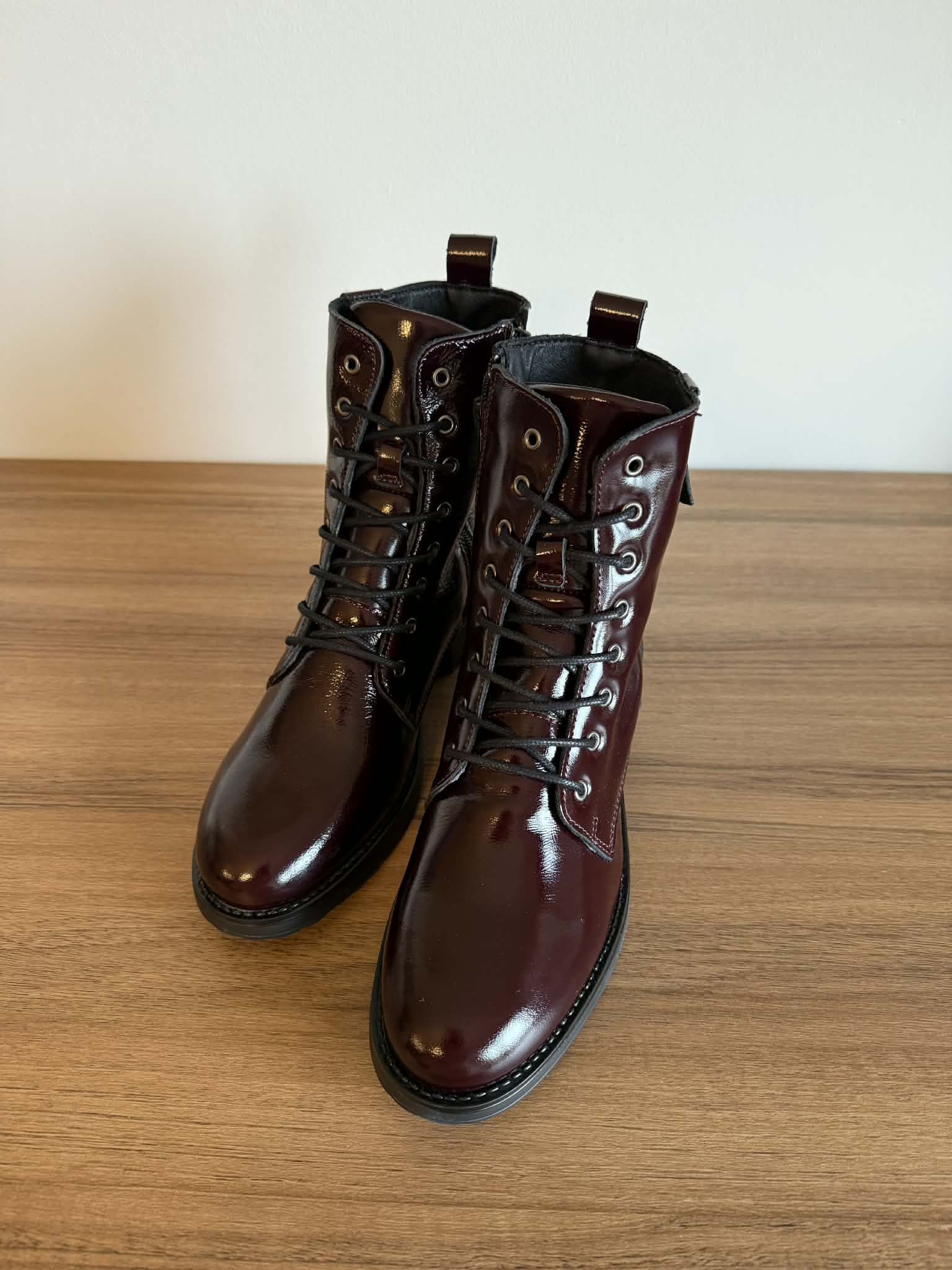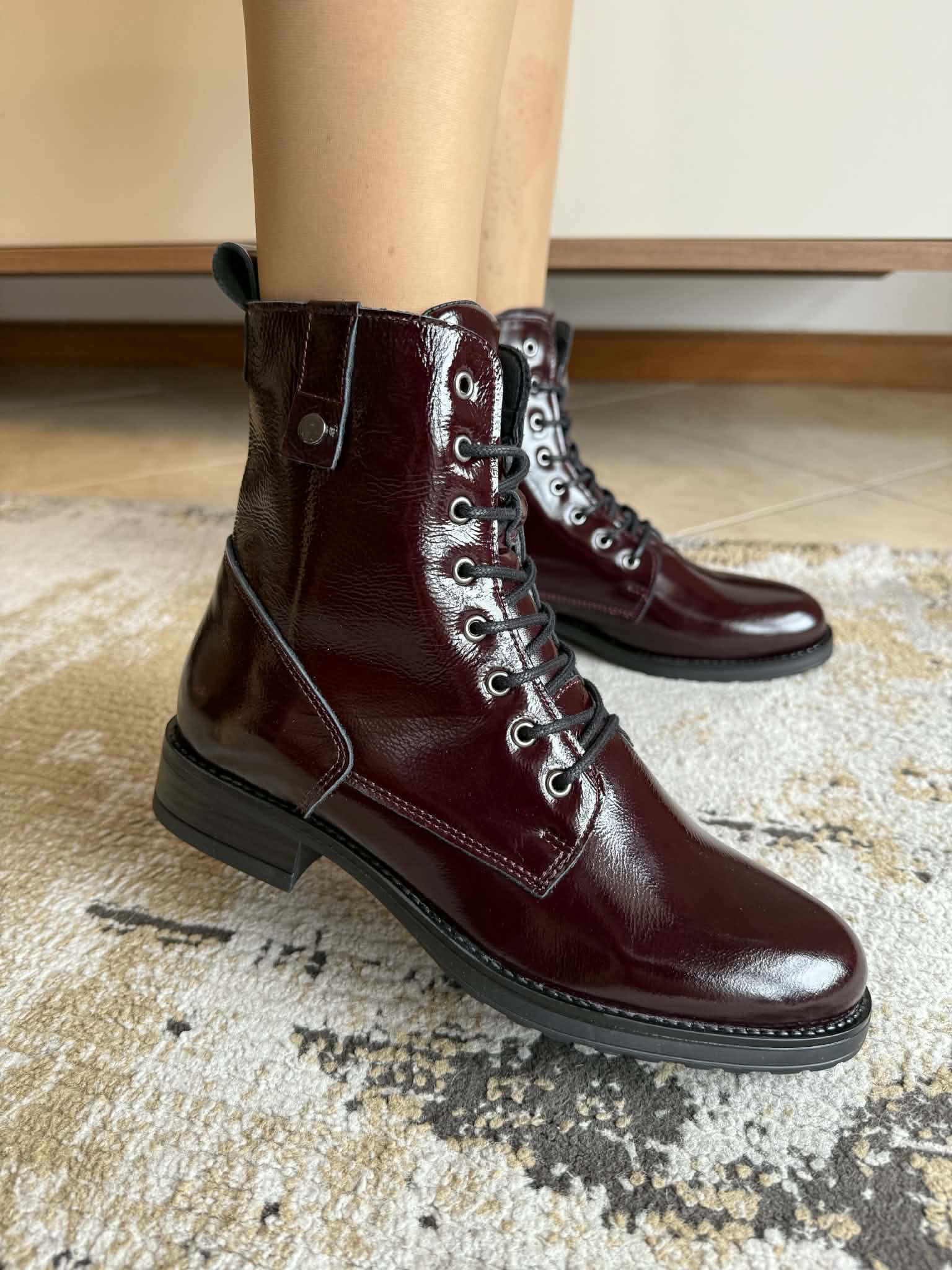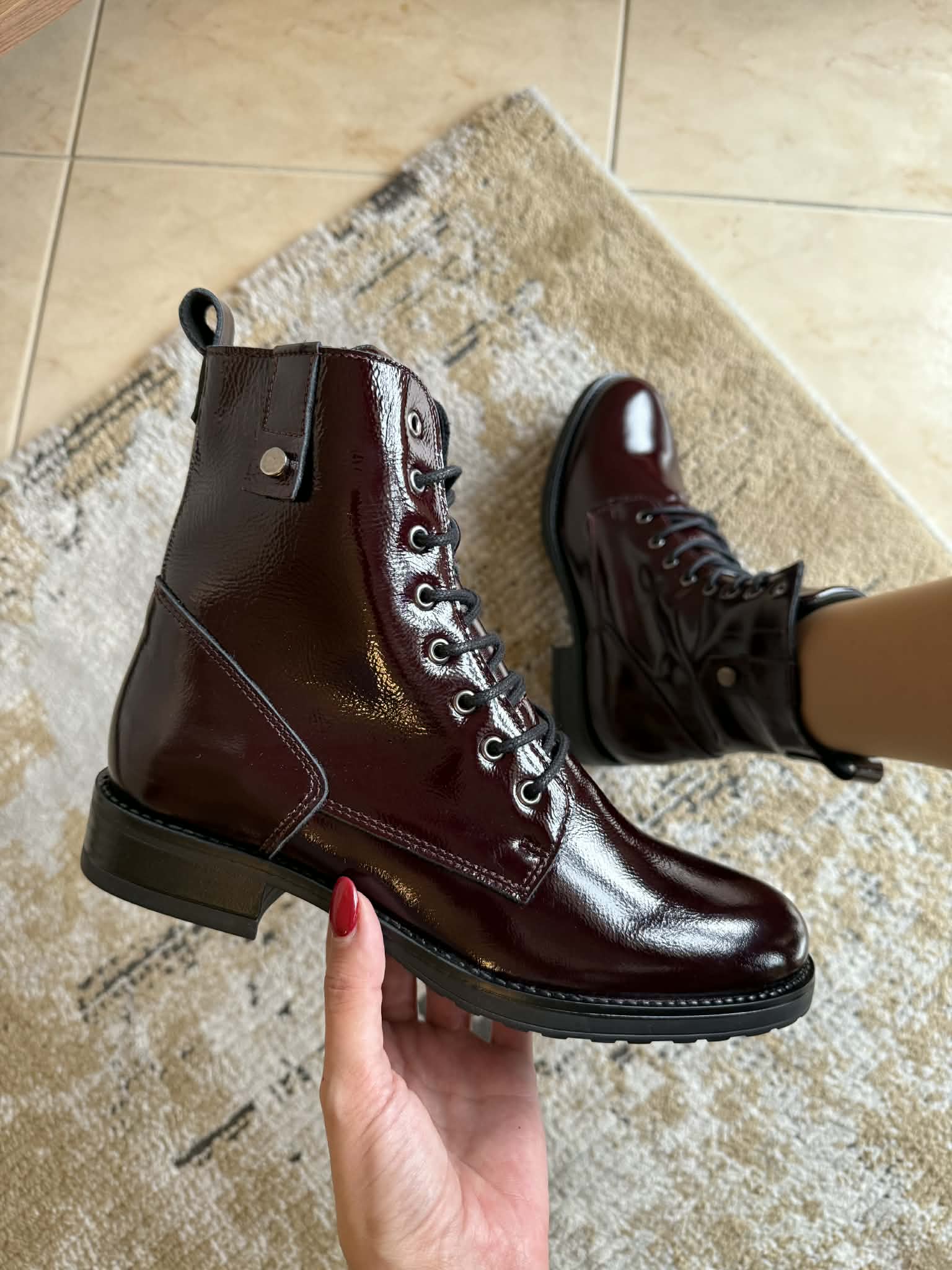 Botim estilo militar em pele envernizada – bordeaux