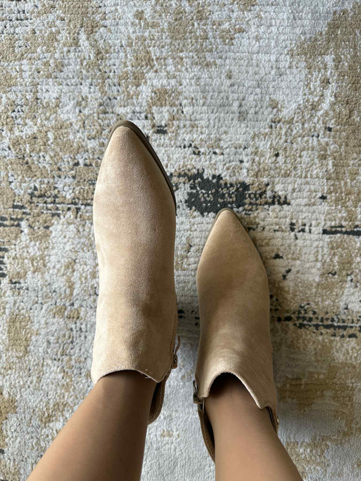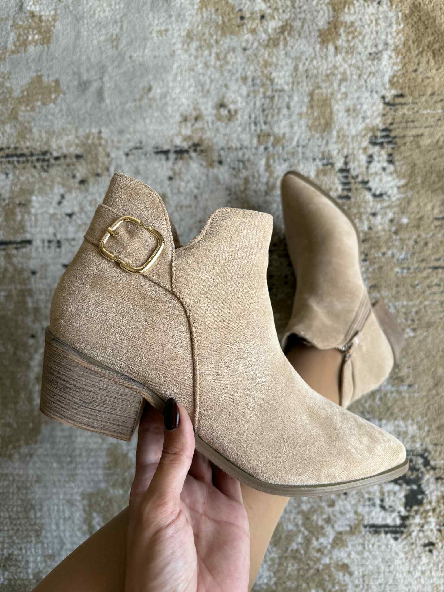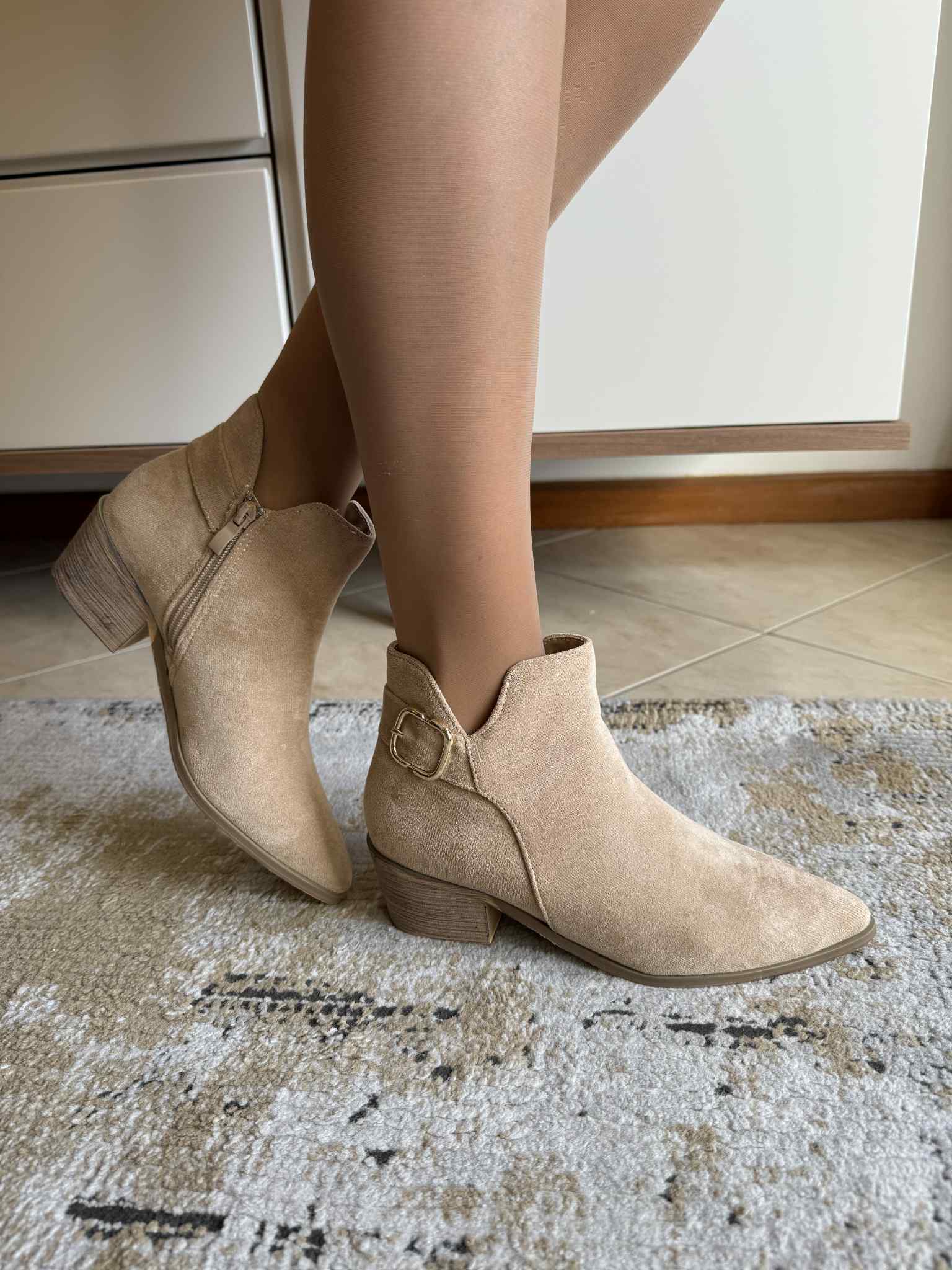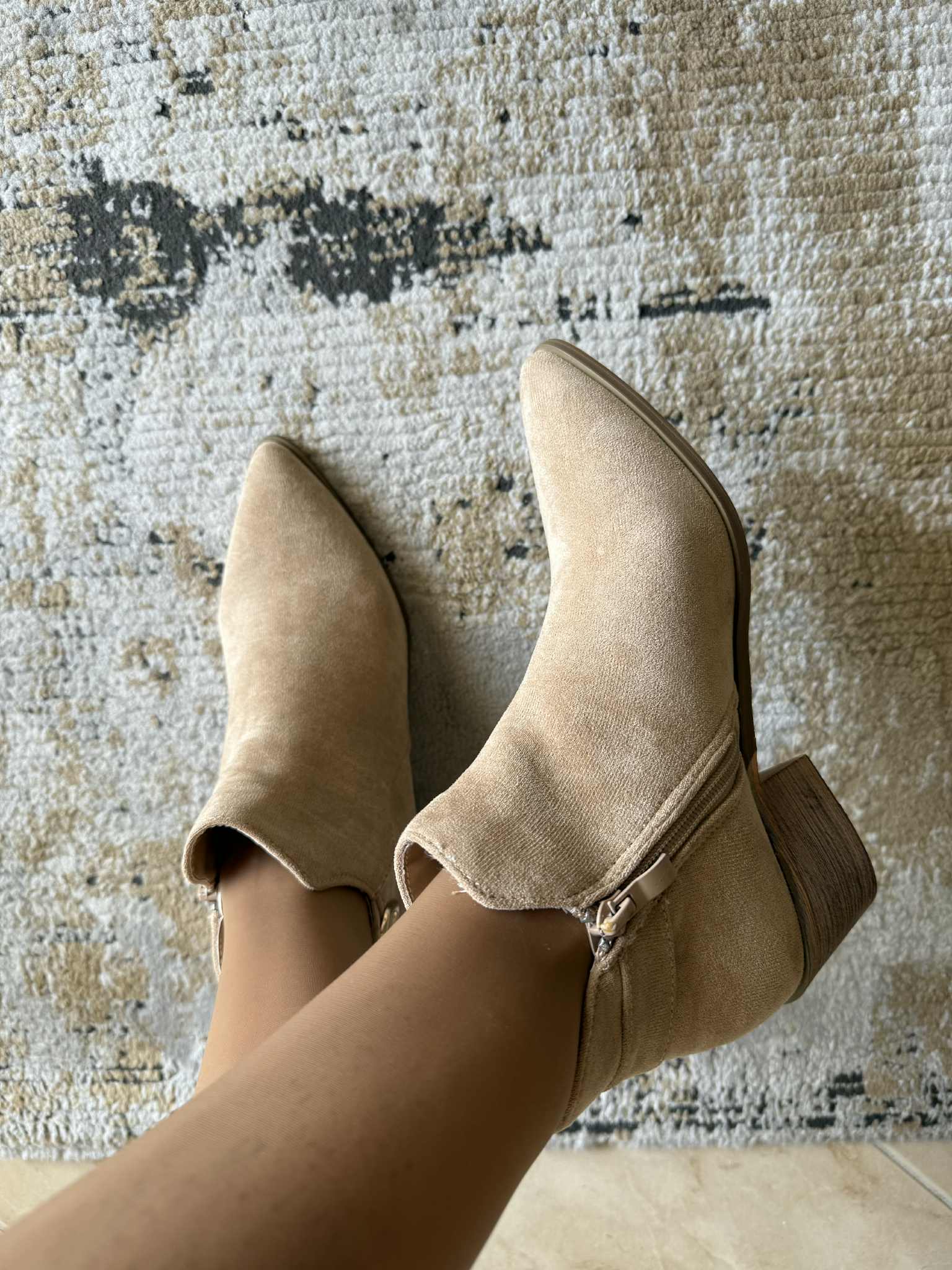 Botim bege, em camurça sintética. Estilo texana. Com tacão largo de 5cm de altura. Com fecho.