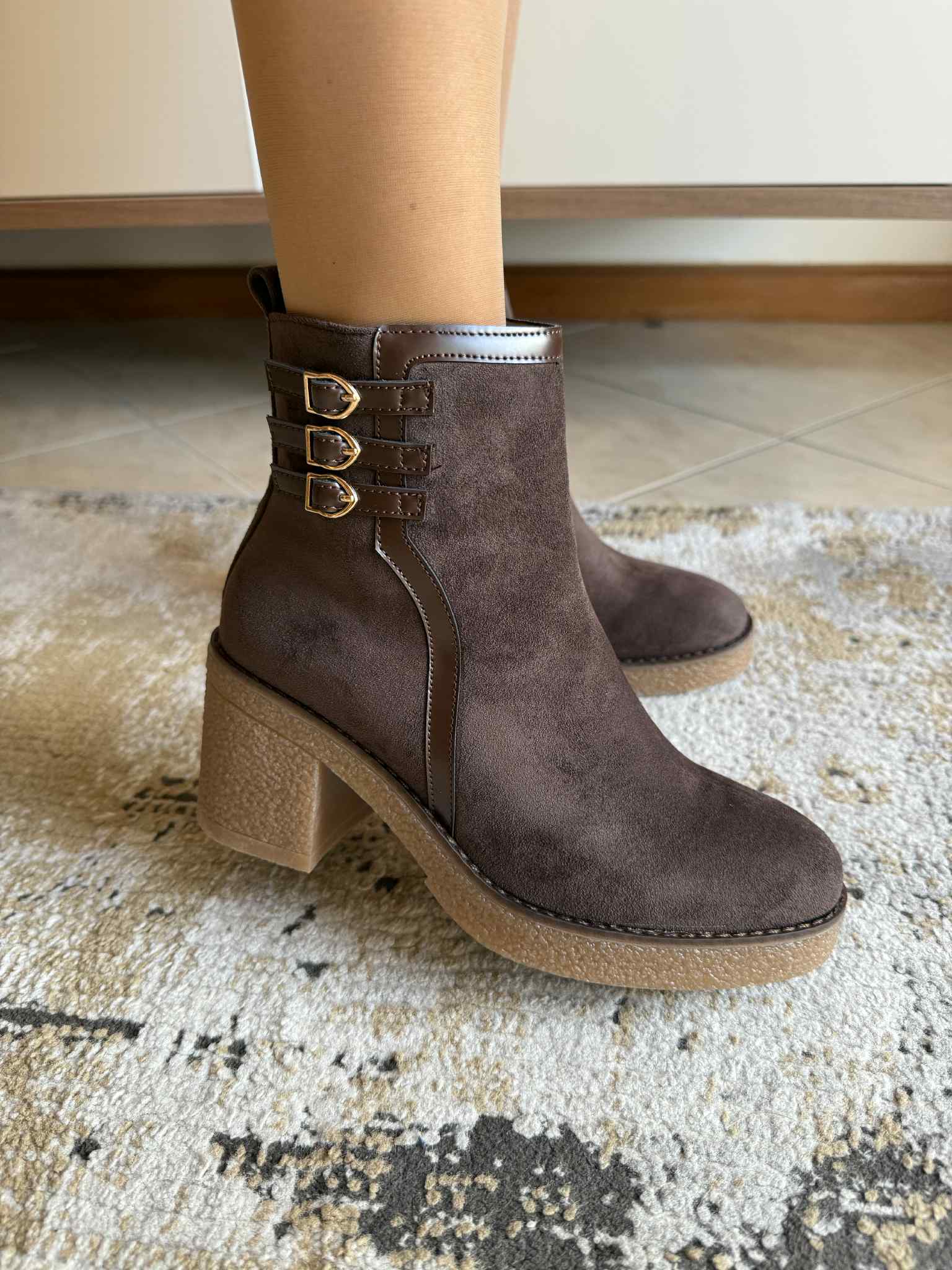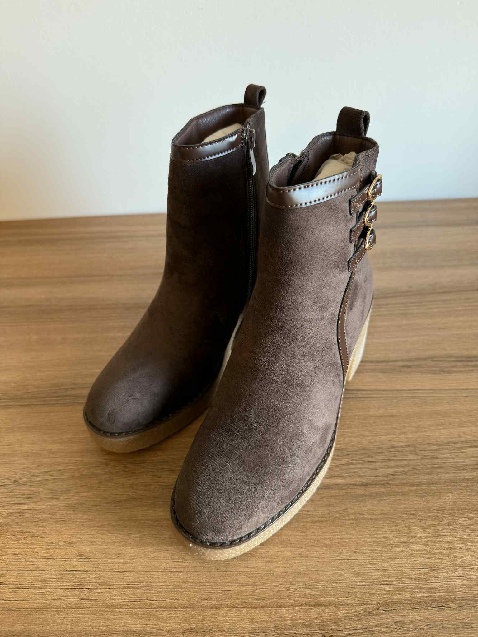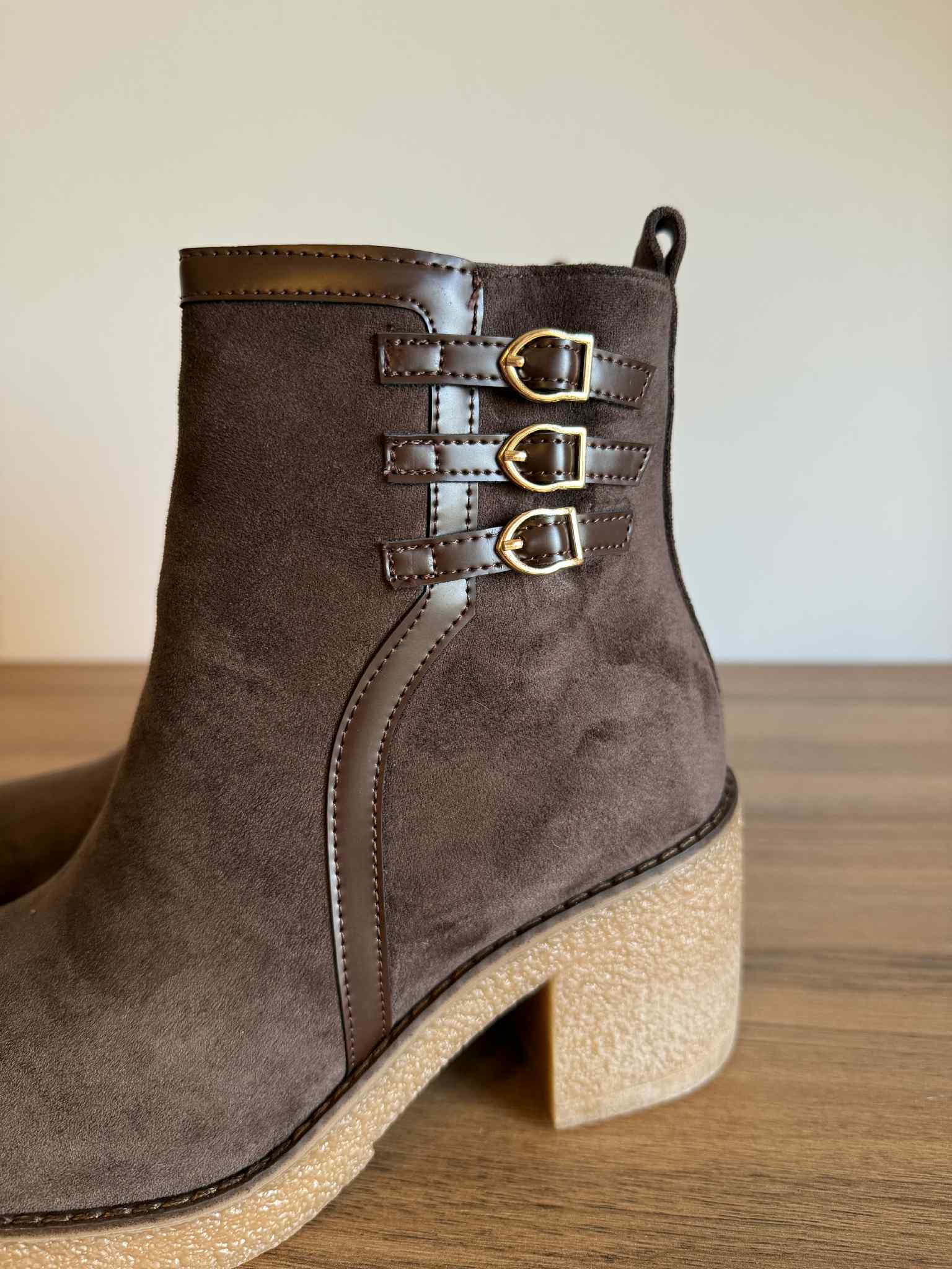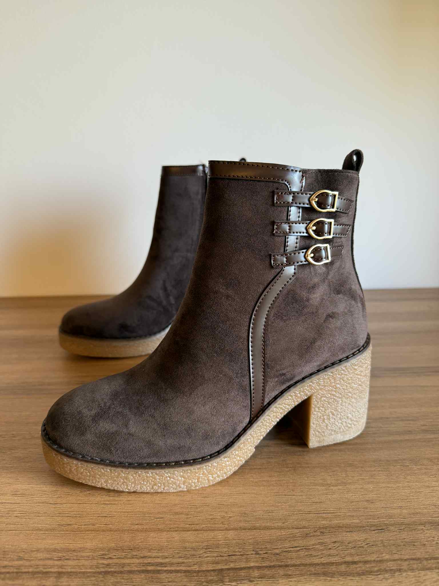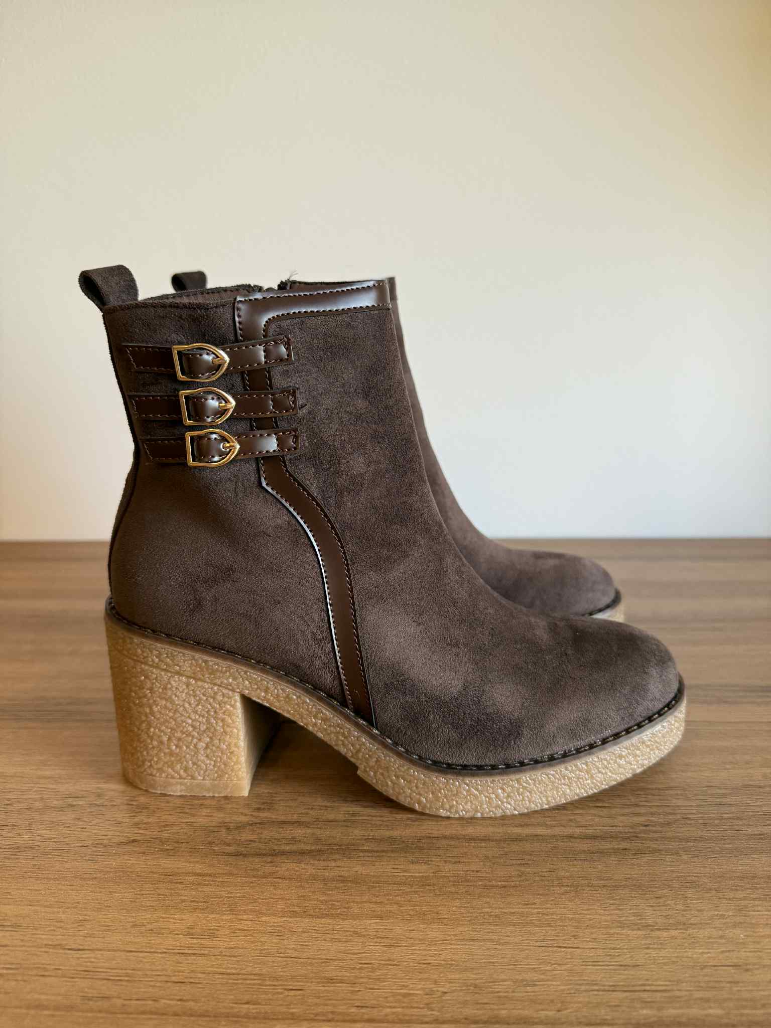 Botim em camurça sintética. Detalhes envernizados. Com fecho. Fivelas decorativas. Salto largo com 7cm de altura.